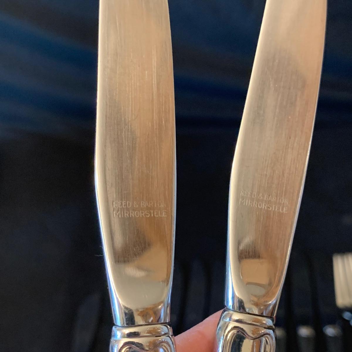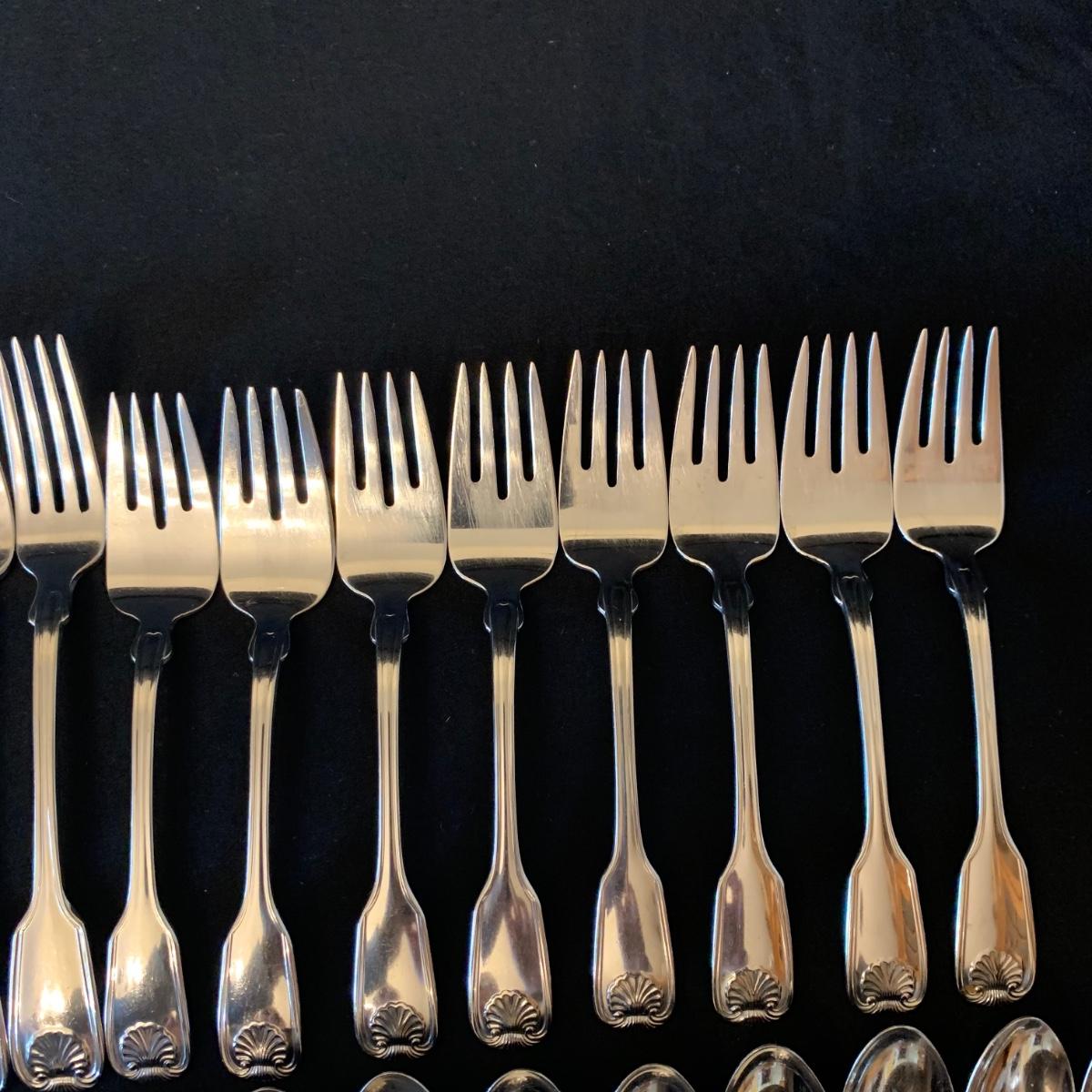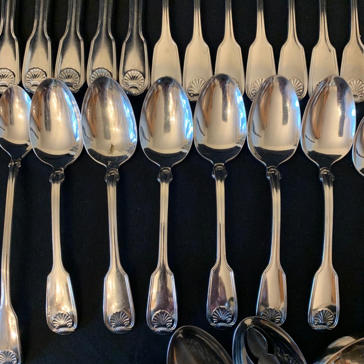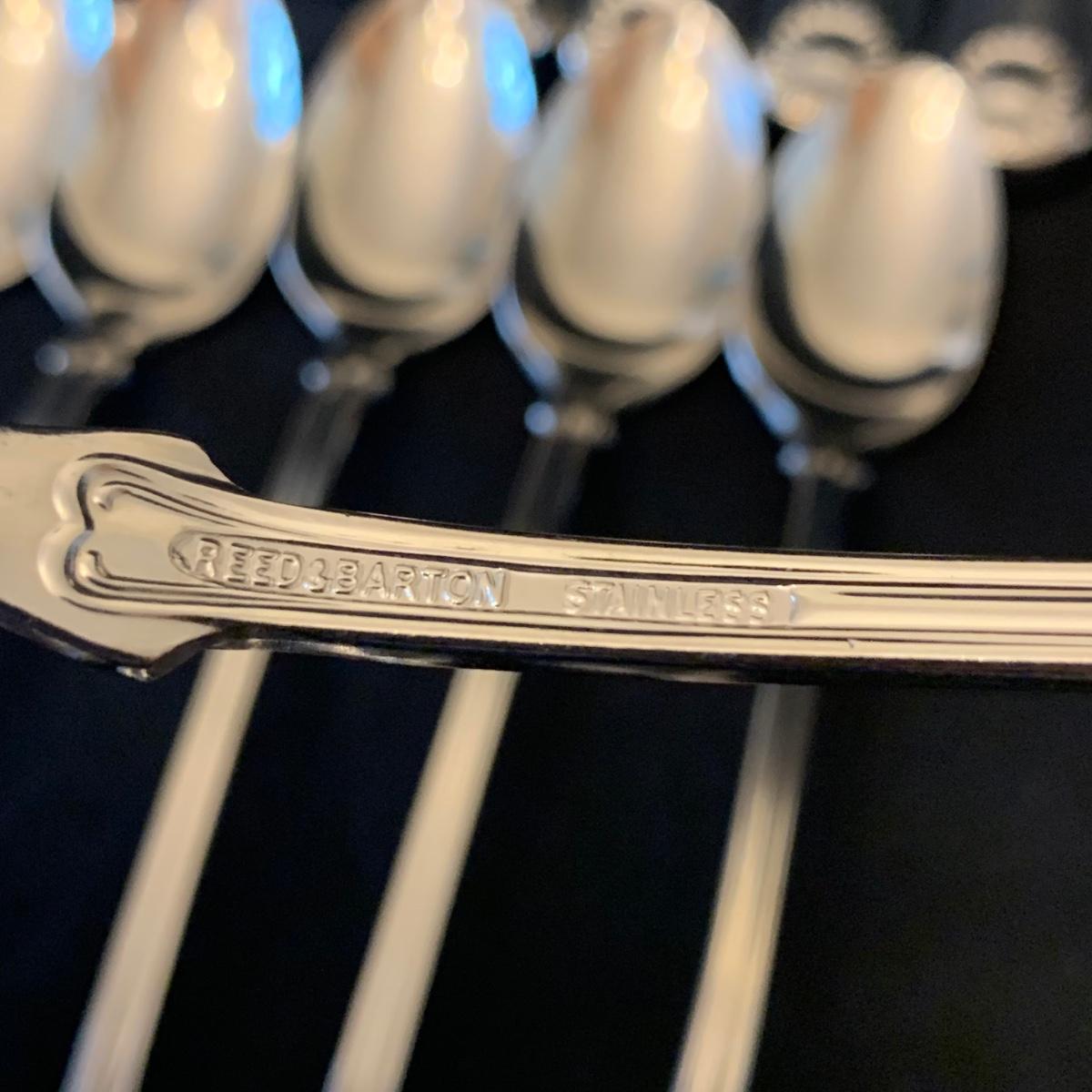 Set of Reed and Barton stainless steel flatware with their “˜Colonial Shell’ design. fifty-nine pieces total. A six person set plus extras. Includes knives, dinner forks, salad forks, soup spoons, dessert spoons, teaspoons, and serving utensils. In very good condition, just needs a good cleaning.