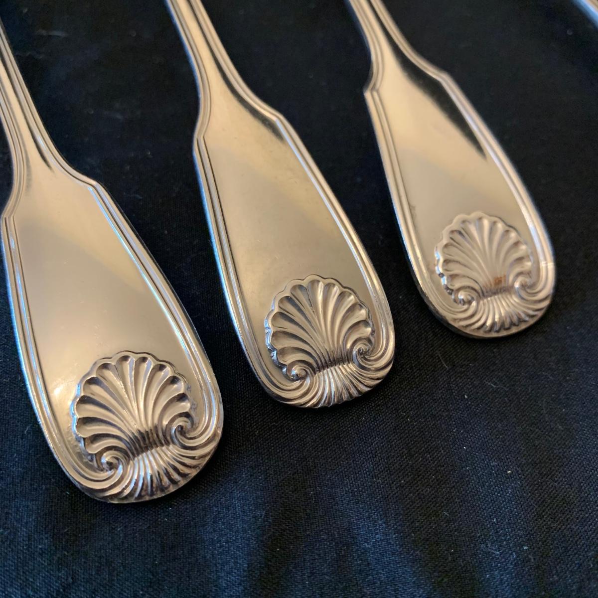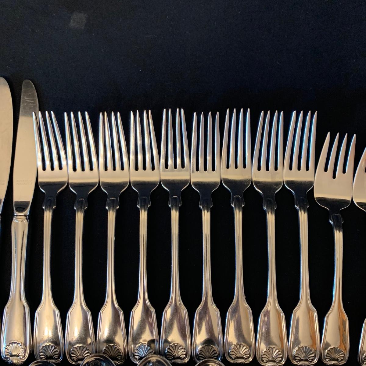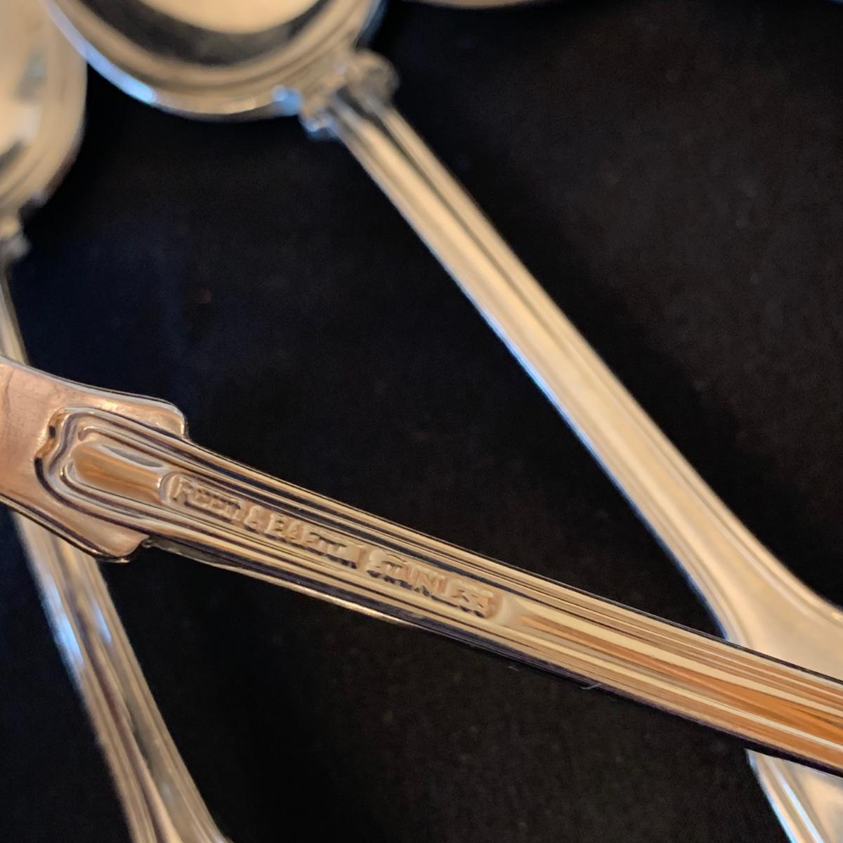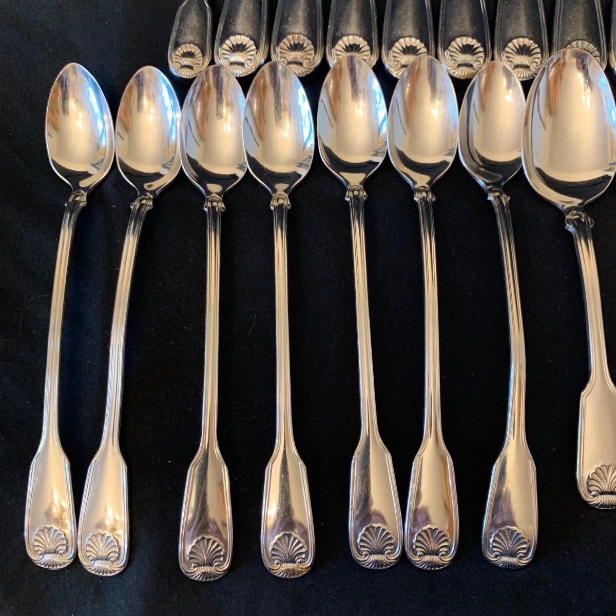 Set of Reed and Barton stainless steel flatware with their “˜Colonial Shell’ design. fifty-nine pieces total. A six person set plus extras. Includes knives, dinner forks, salad forks, soup spoons, dessert spoons, teaspoons, and serving utensils. In very good condition, just needs a good cleaning.