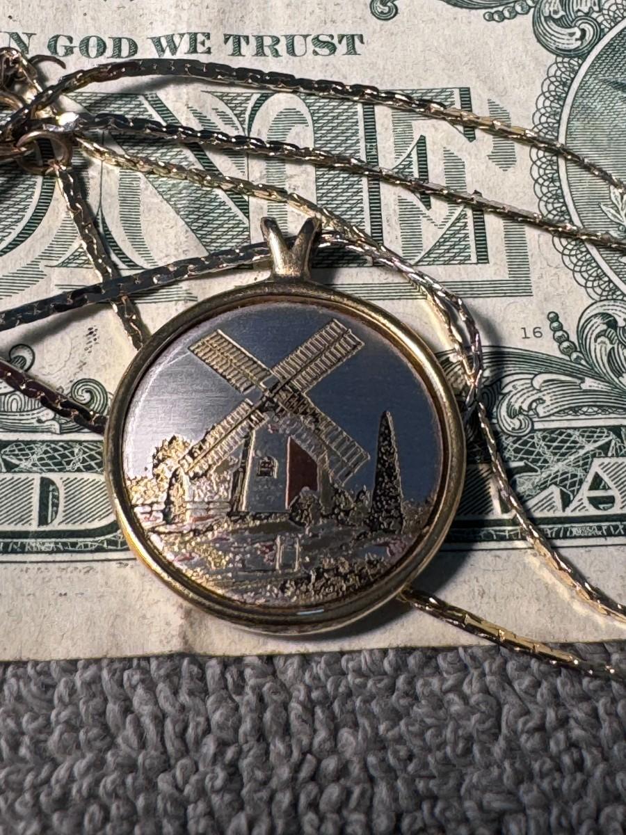 Reed & Barton Damascene pendant featuring a detailed windmill scene, likely a souvenir piece.