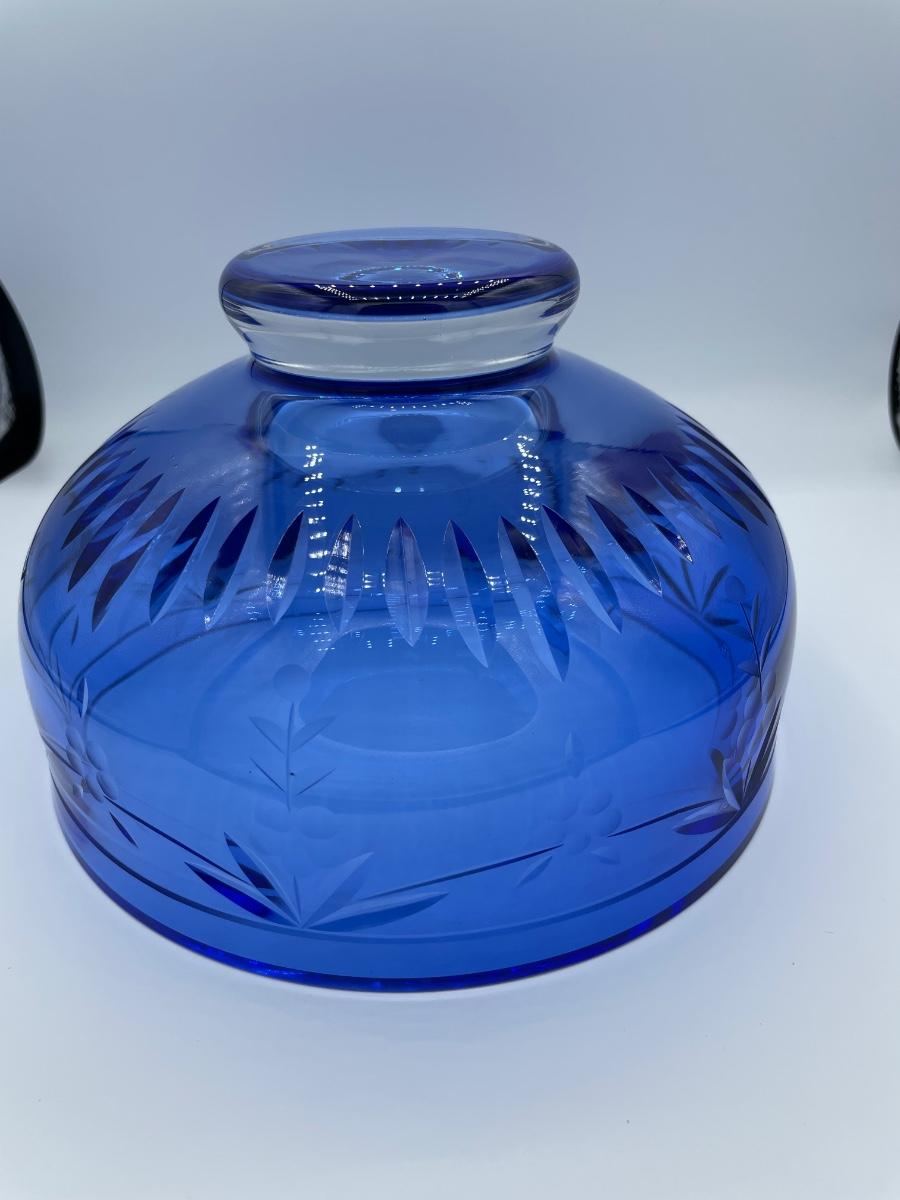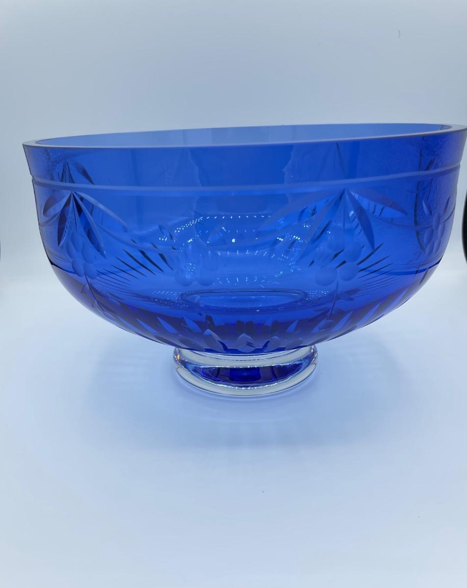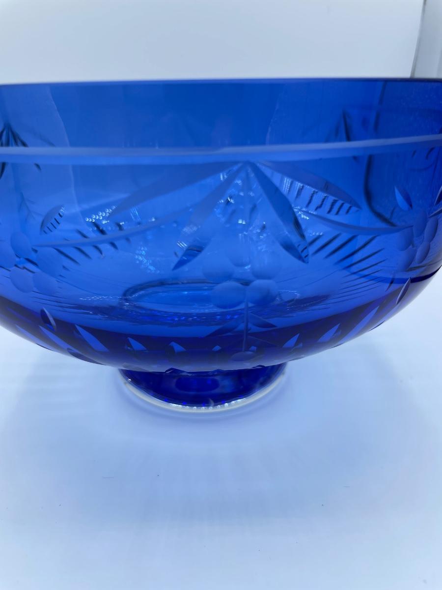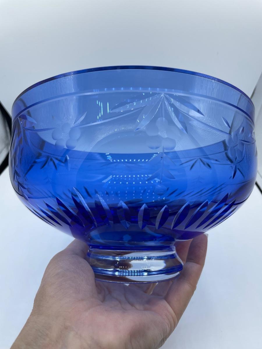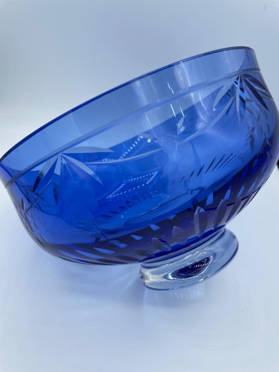 Heavy blue crystal footed bowl. 5” H by 7 1/2” W. No sticker.