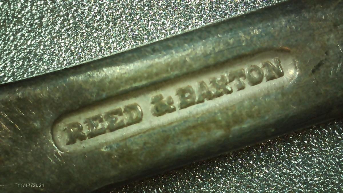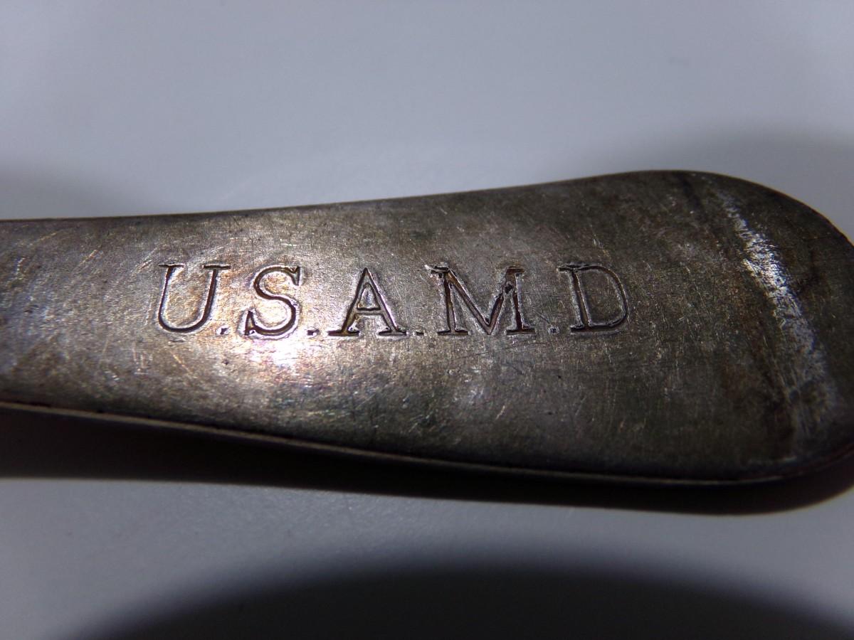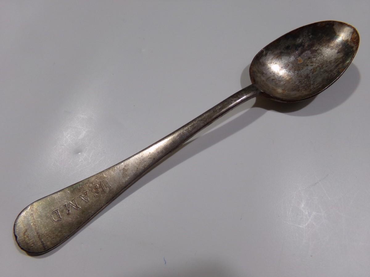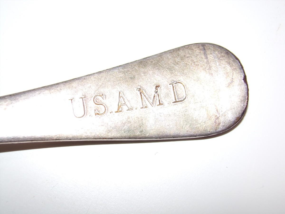 Reed & Barton table spoon, U.S.A.M.D.?maybe a military contract spoon? silver plate. We don't know what this particular I.D. lettering refers to.