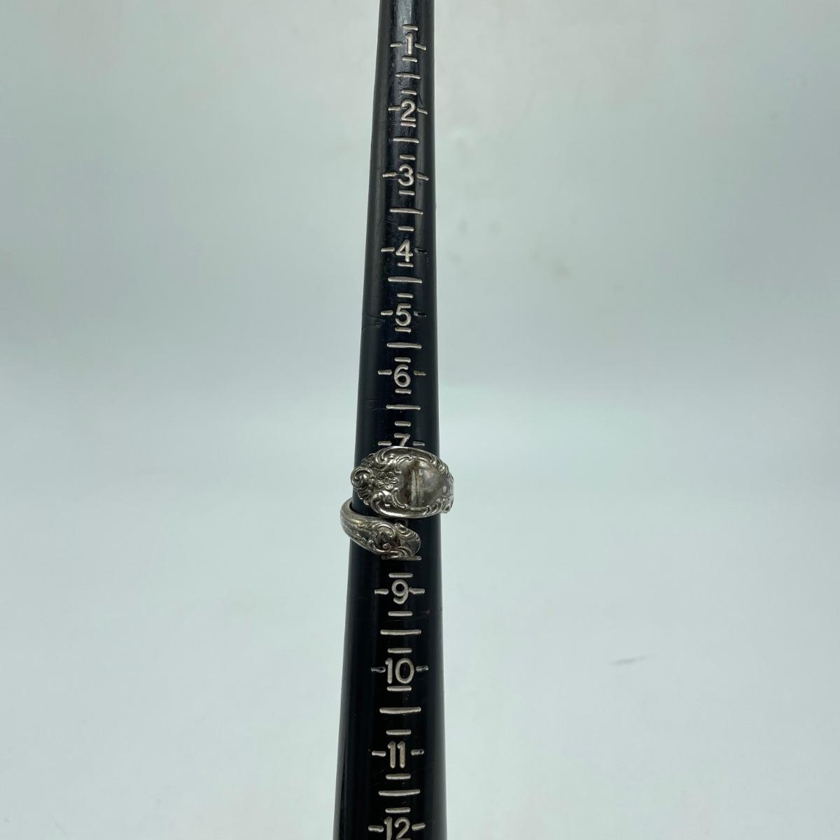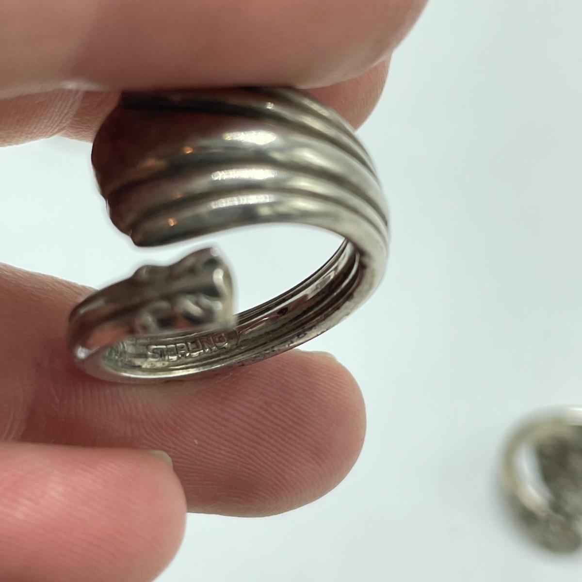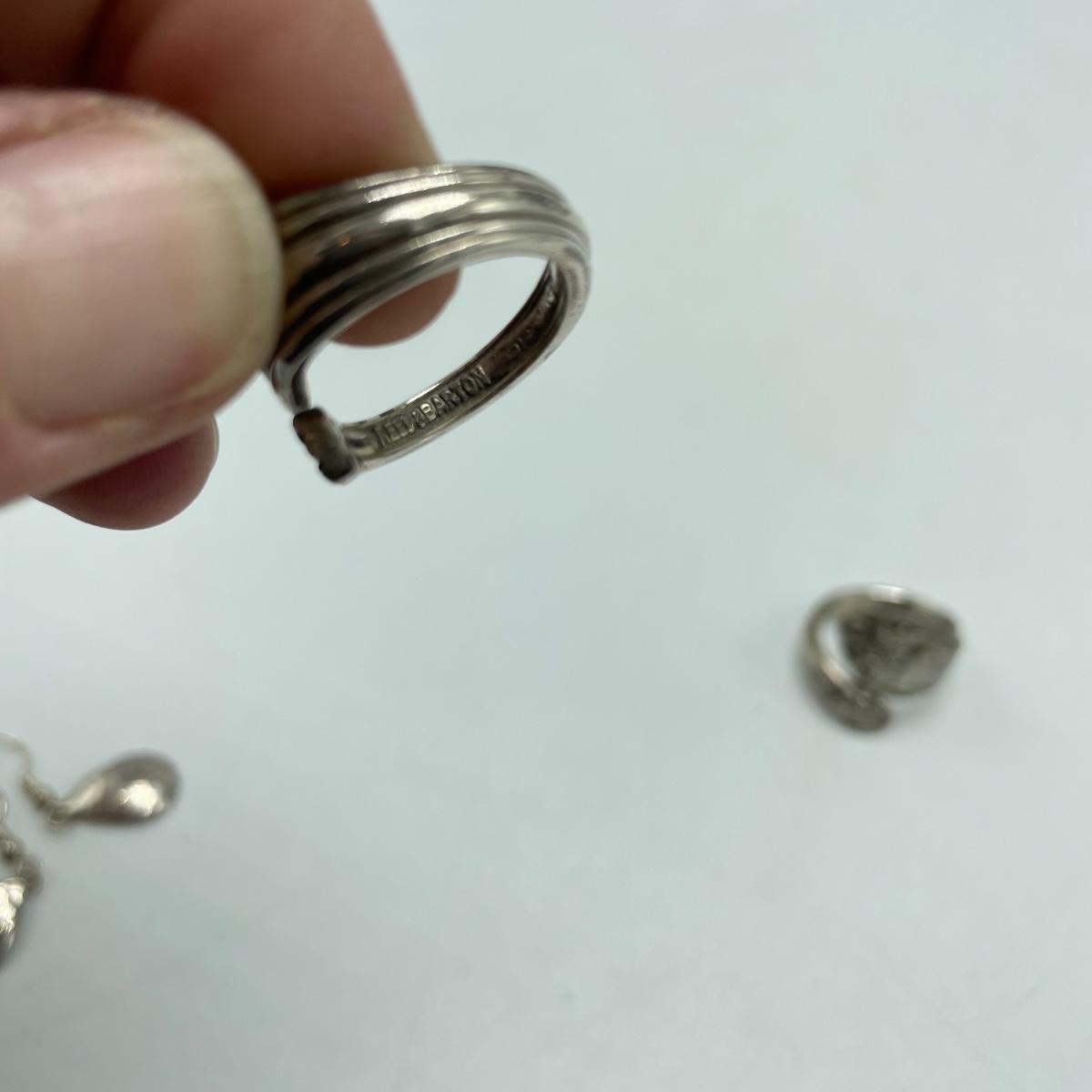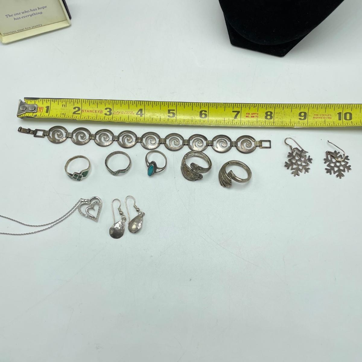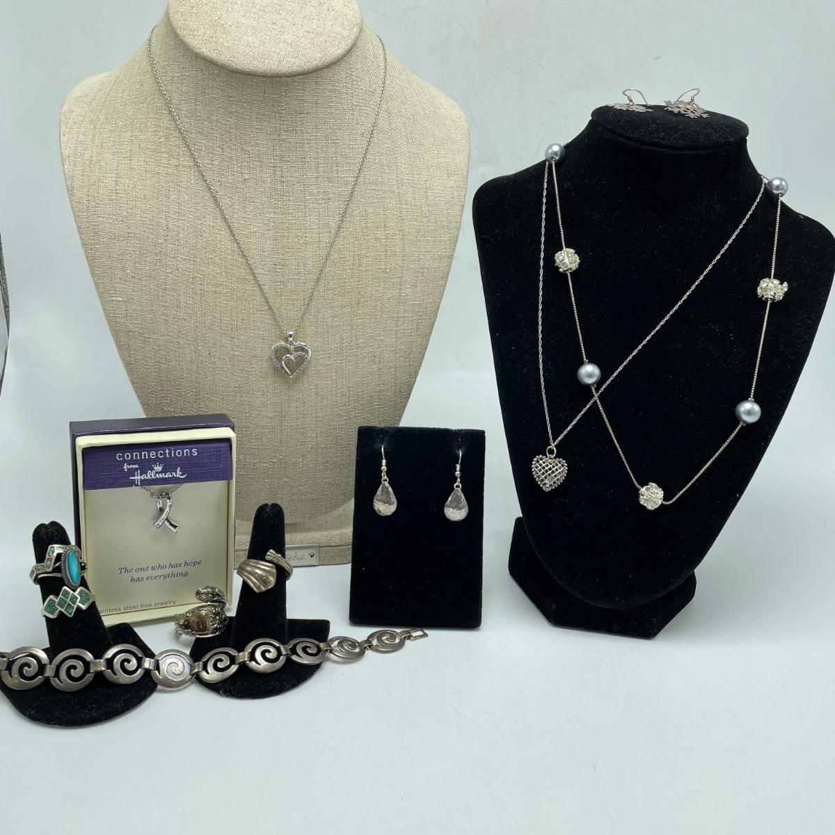 Three necklaces, the two with heart shaped pendants are marked sterling. There is a sterling linked bracelet, a snowflake pair of earrings and a local artist Stuart Nye earrings both marked 925. Lot features five rings three have smudged marks, but no clear 925 or sterling marks. The two repurposed silverware are both marked sterling. One is Reed & Barton and the other is Melrose by Gorham. See images. Shipping available.