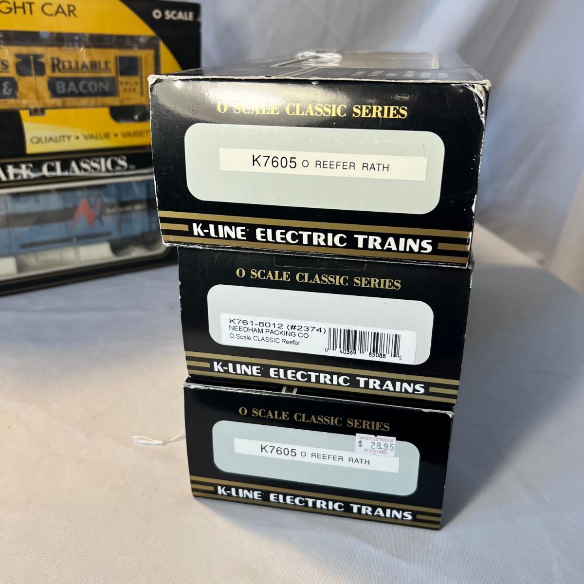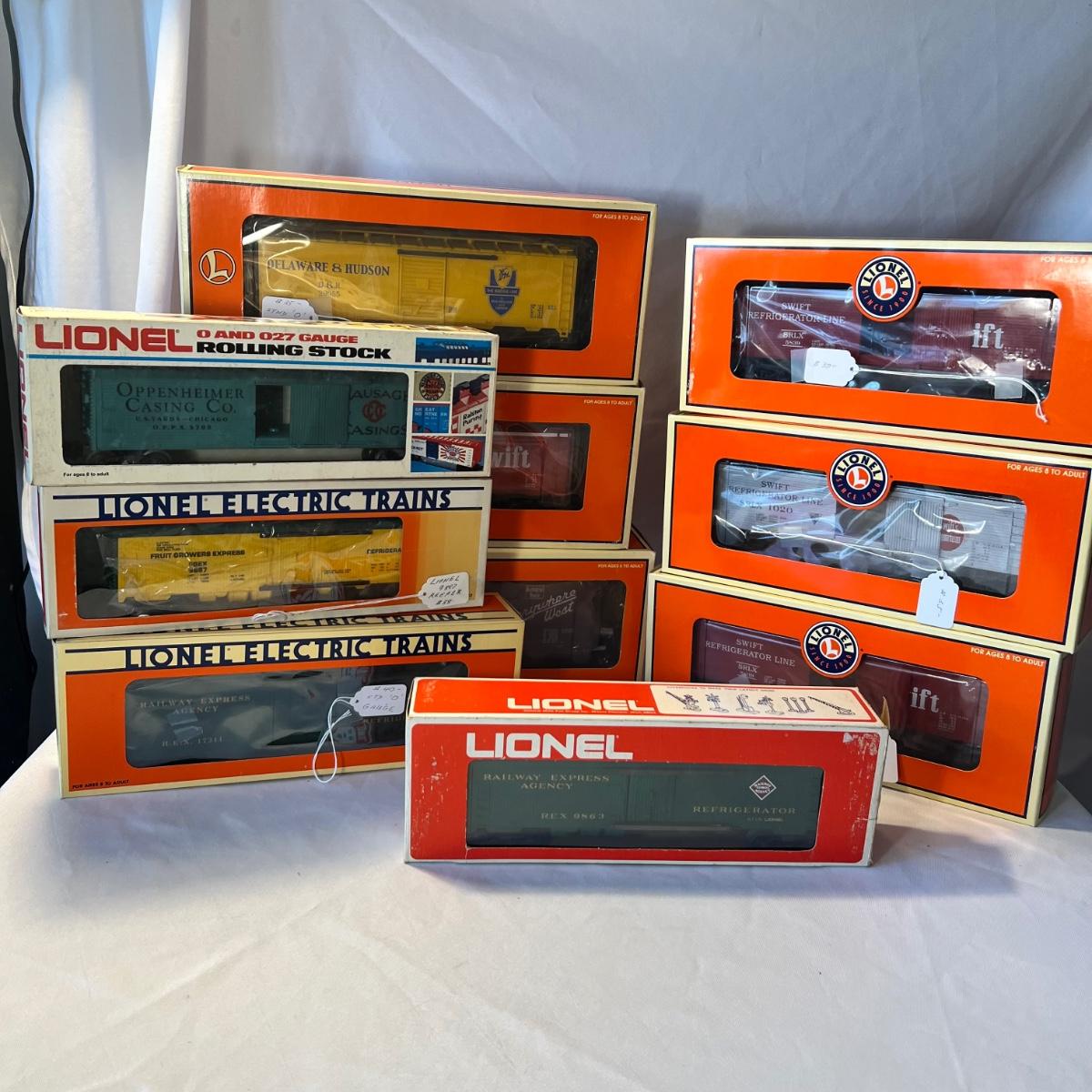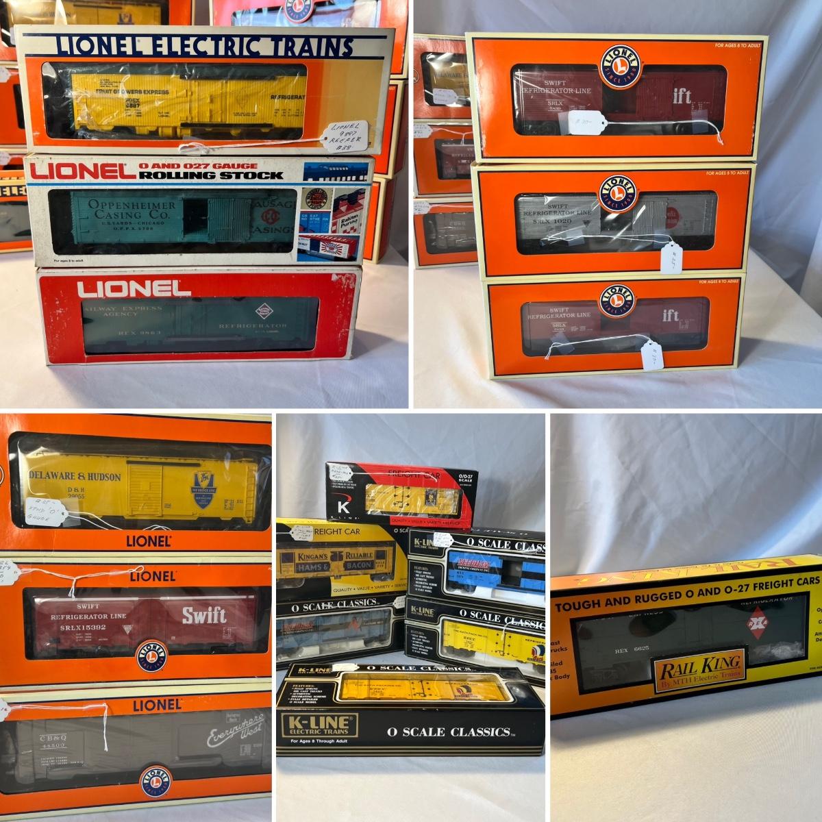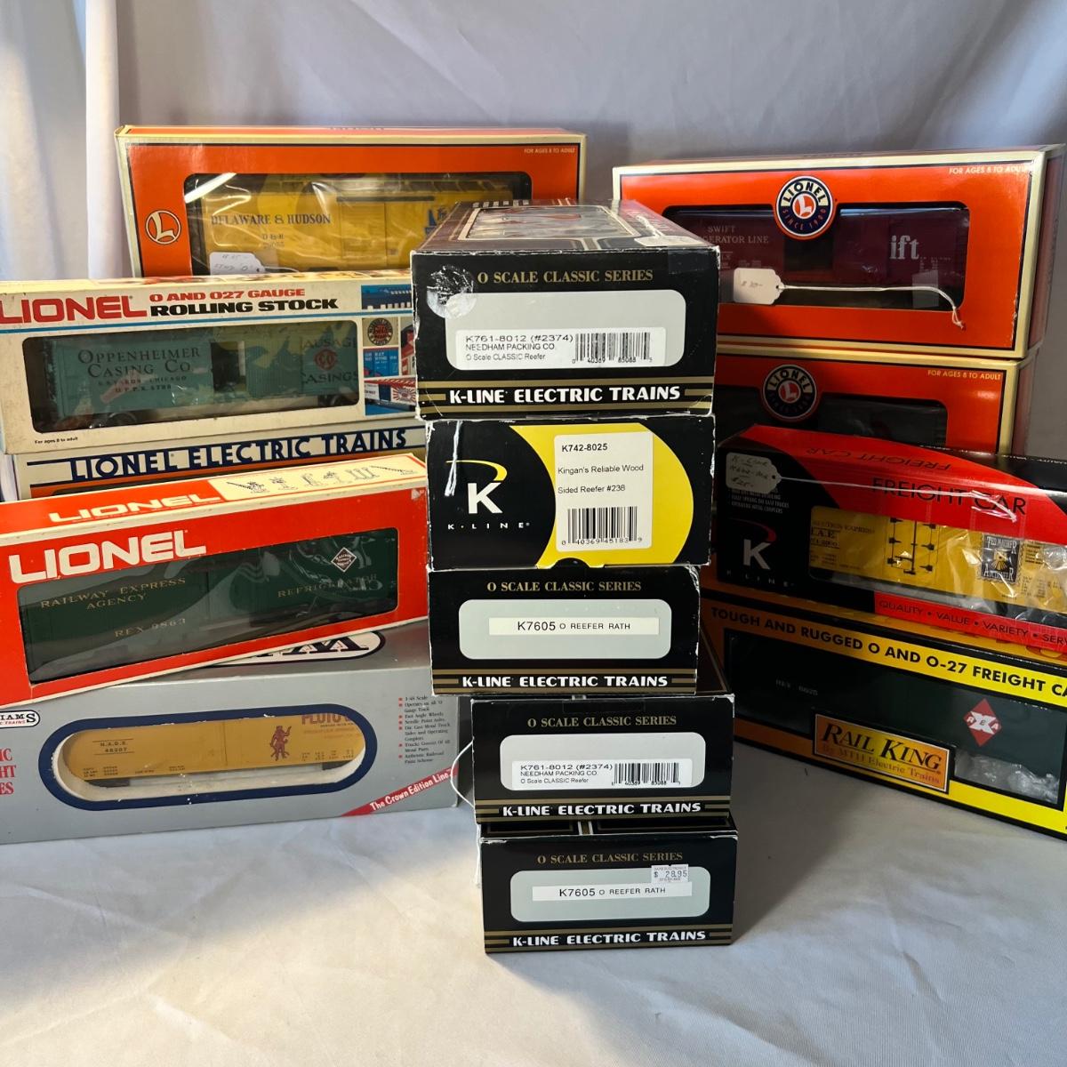 Large assortment of reefer cars plus one boxcar car. Includes ten Lionel cars, six K-Line and one each of Williams and Rail King. Please note that any price tag seen on an item was not put there by Sterling Transitions and does not reflect the current value of the item.