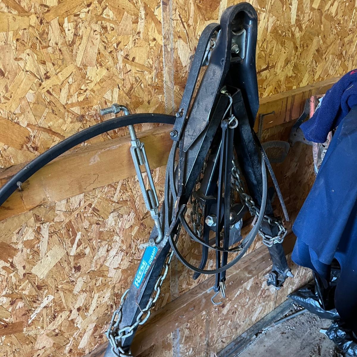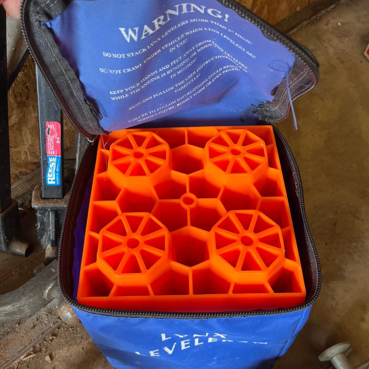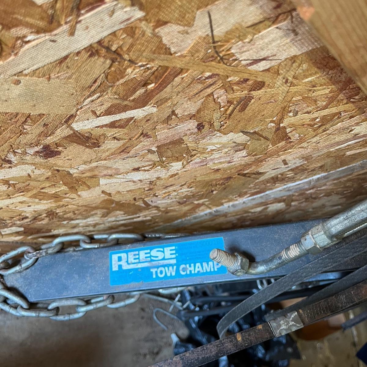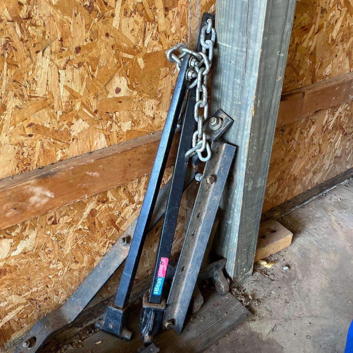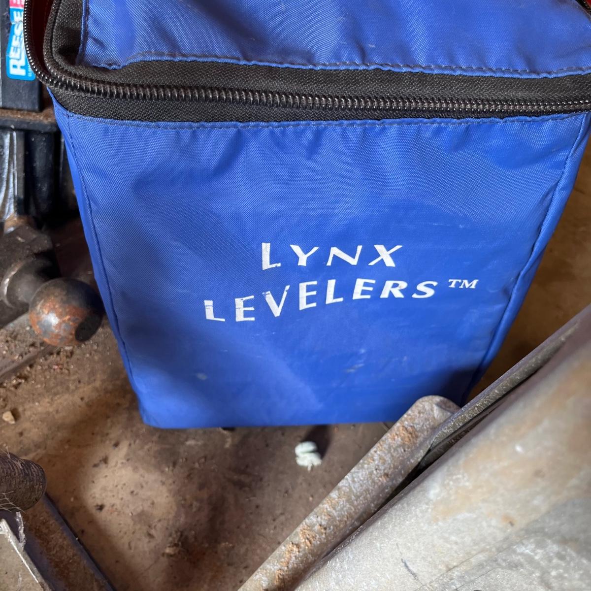 Lot includes a Reese Tow Champ tow bar rated at 5000 lb. Also includes receiver hitch, six stabilizer jacks and a pack of Lynx Levelers.