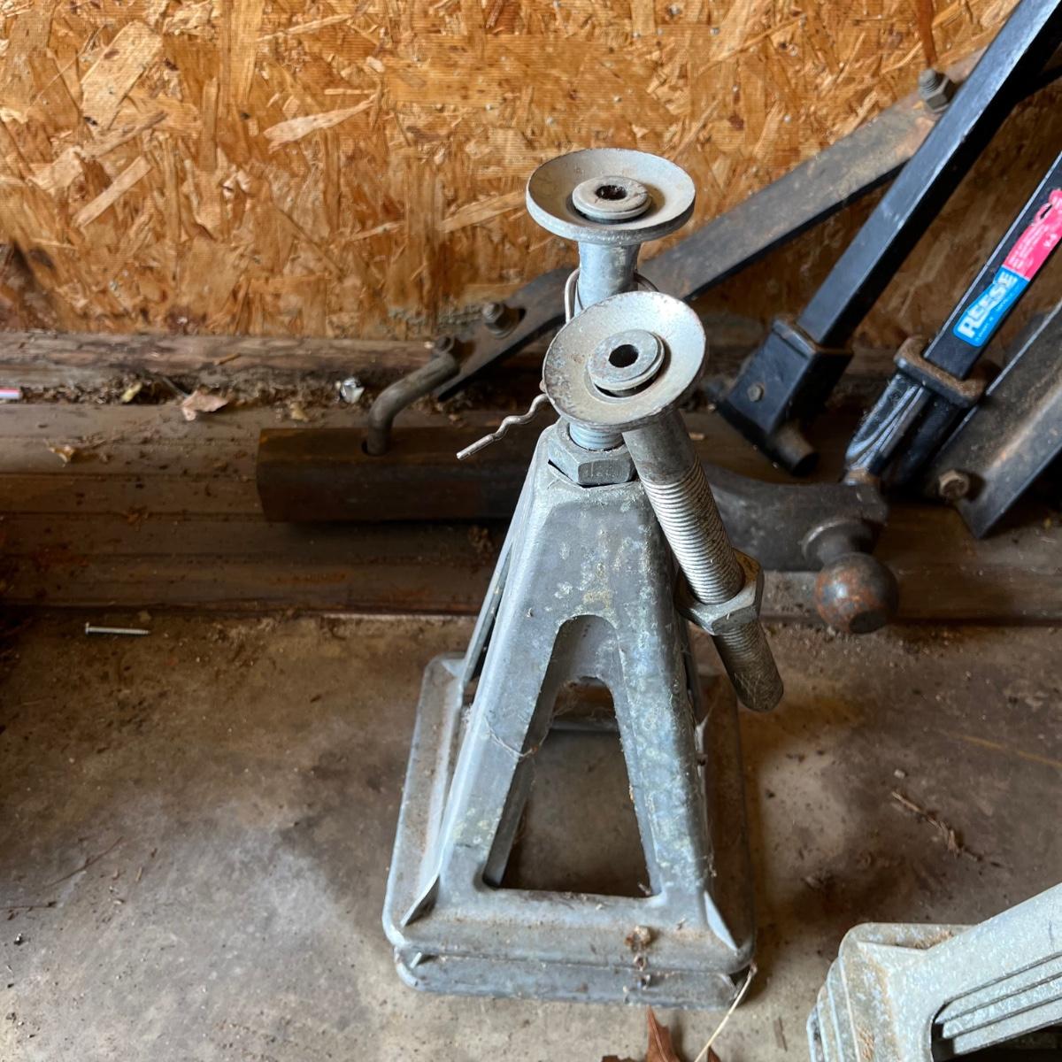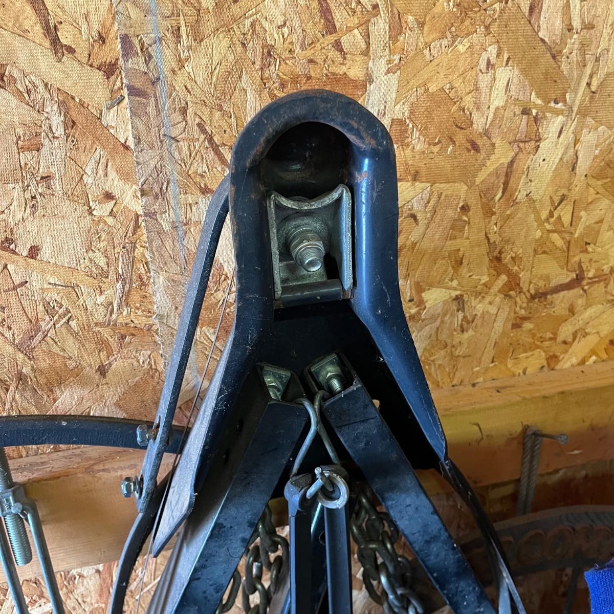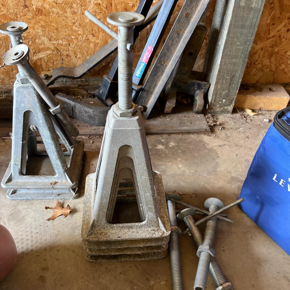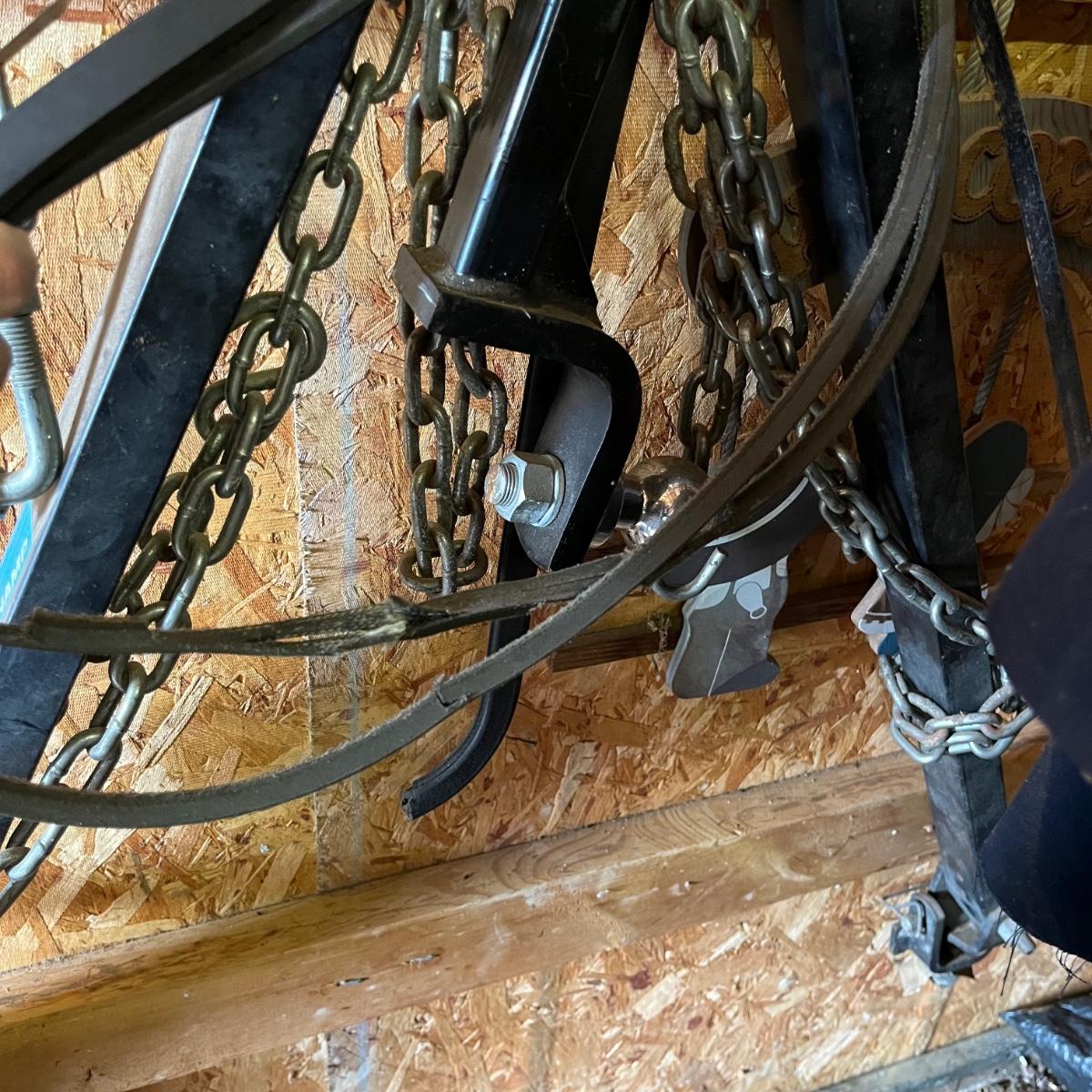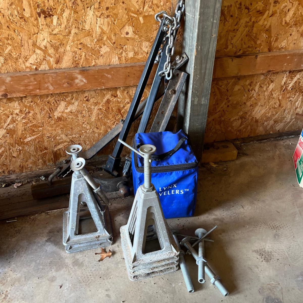 Lot includes a Reese Tow Champ tow bar rated at 5000 lb. Also includes receiver hitch, six stabilizer jacks and a pack of Lynx Levelers.
