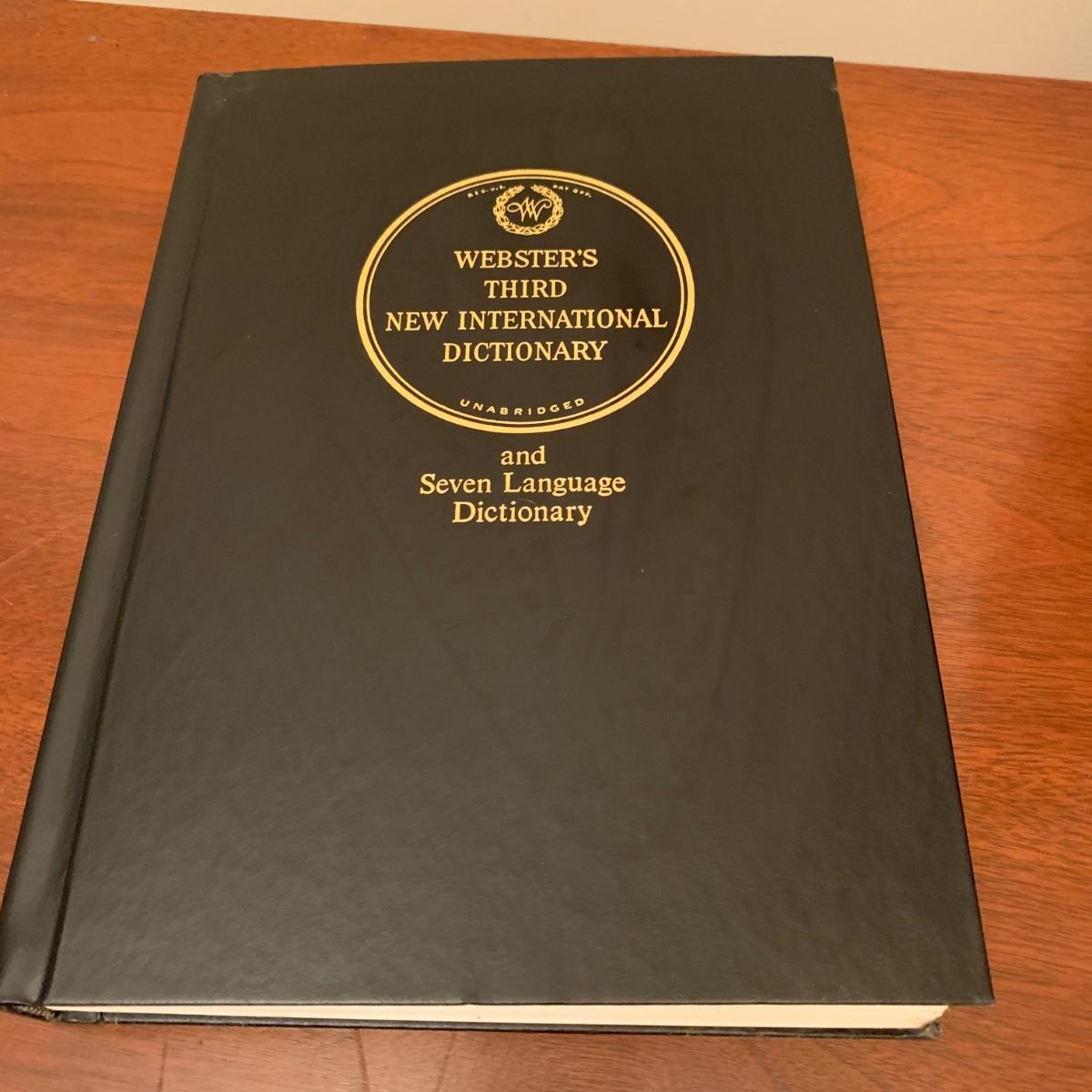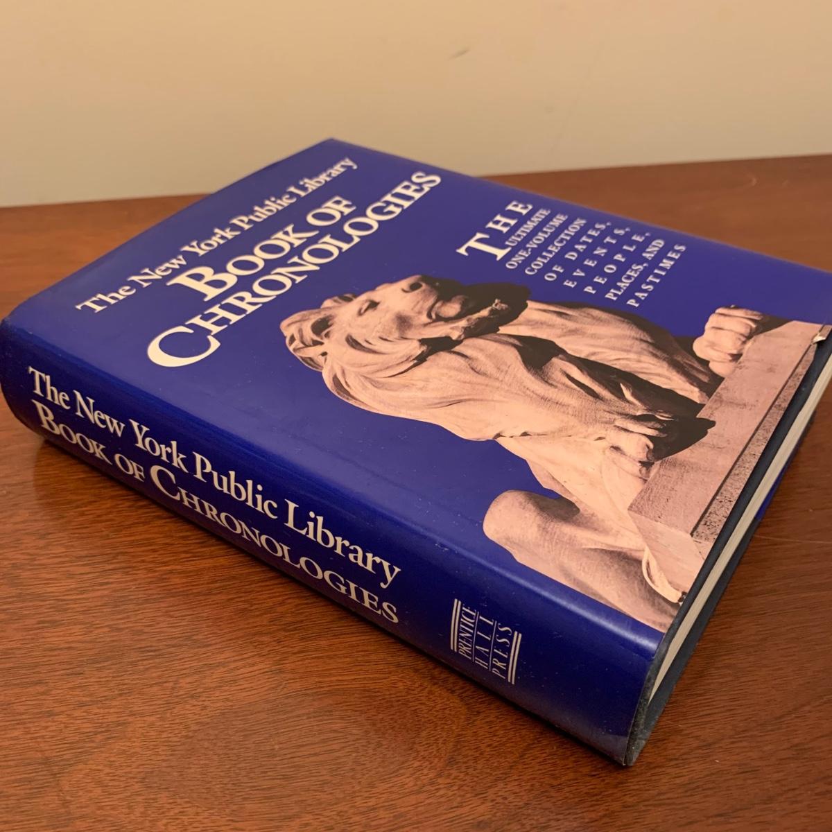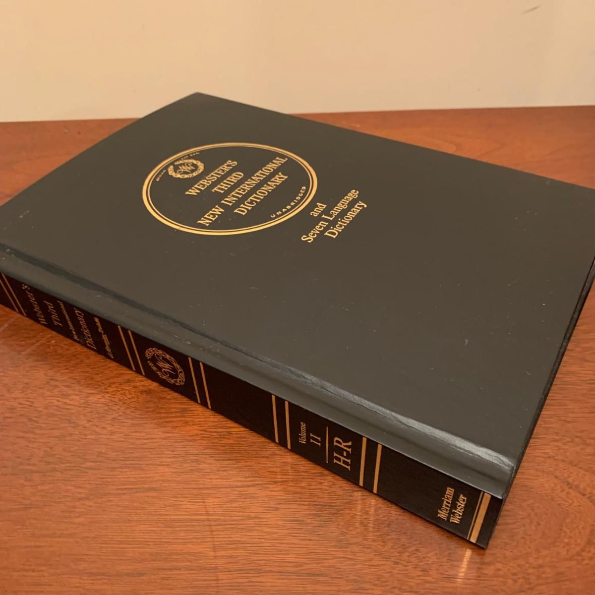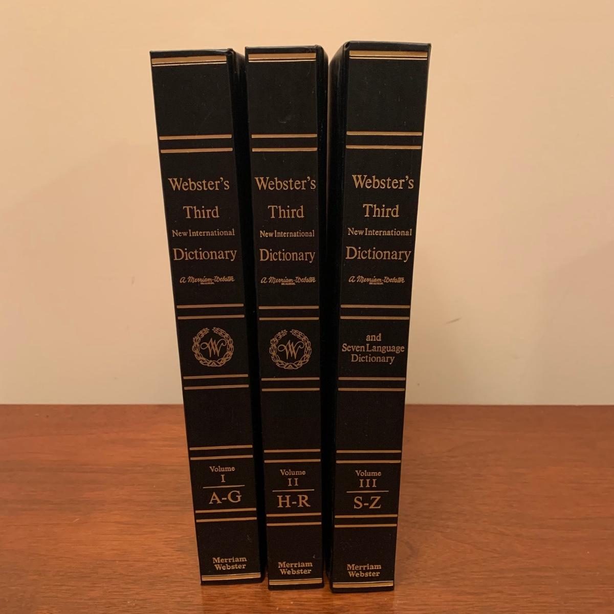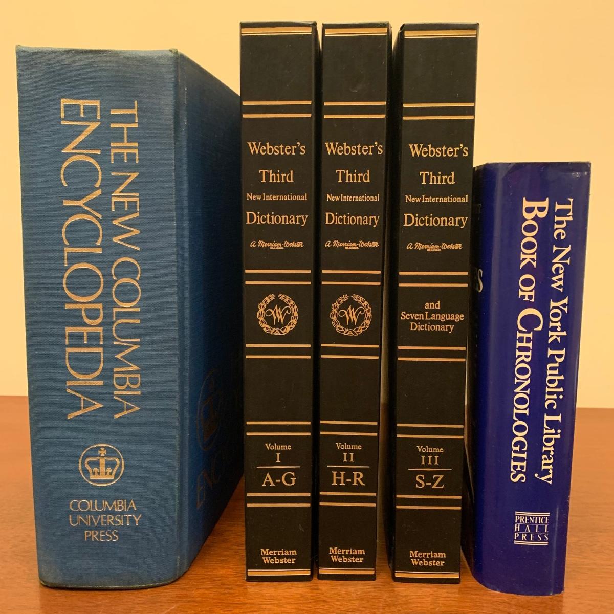 Five hardcover reference books in this collection, including The New Columbia Encyclopedia, Webster’s Third New International Dictionary three volume set, and The New York Public Library Book of Chronologies. The set of Webster’s dictionaries are in very good condition with covers that look like new. The Book of Chronologies has a bit of wear mostly shown on its dust cover. The cover of the encyclopedia feels worn but is intact. The binding is a bit loose. All books have dust on the tops of their pages. The encyclopedia is quite large and heavy. It measures 9.5” x 3.5” x 12.25”.