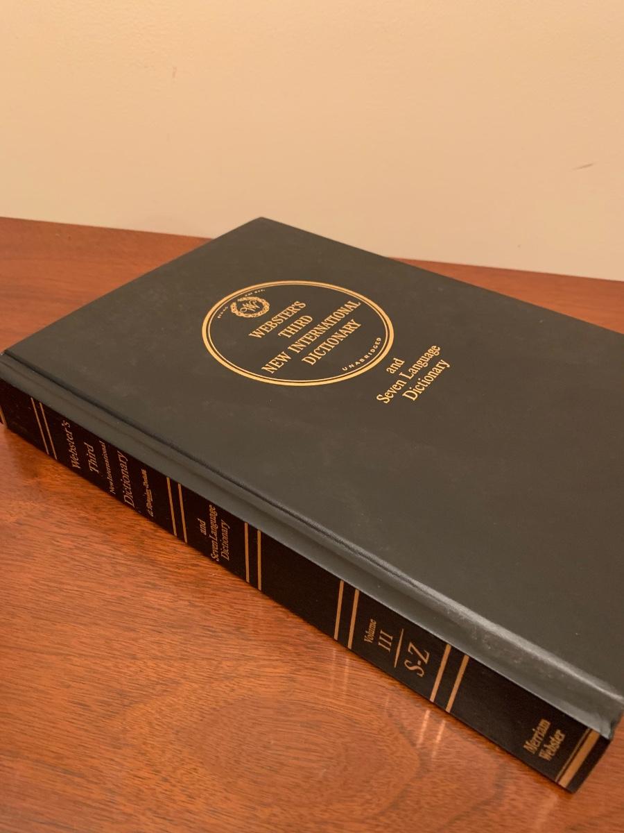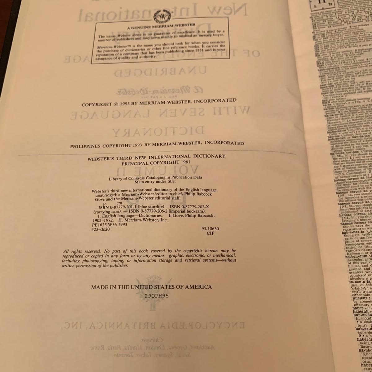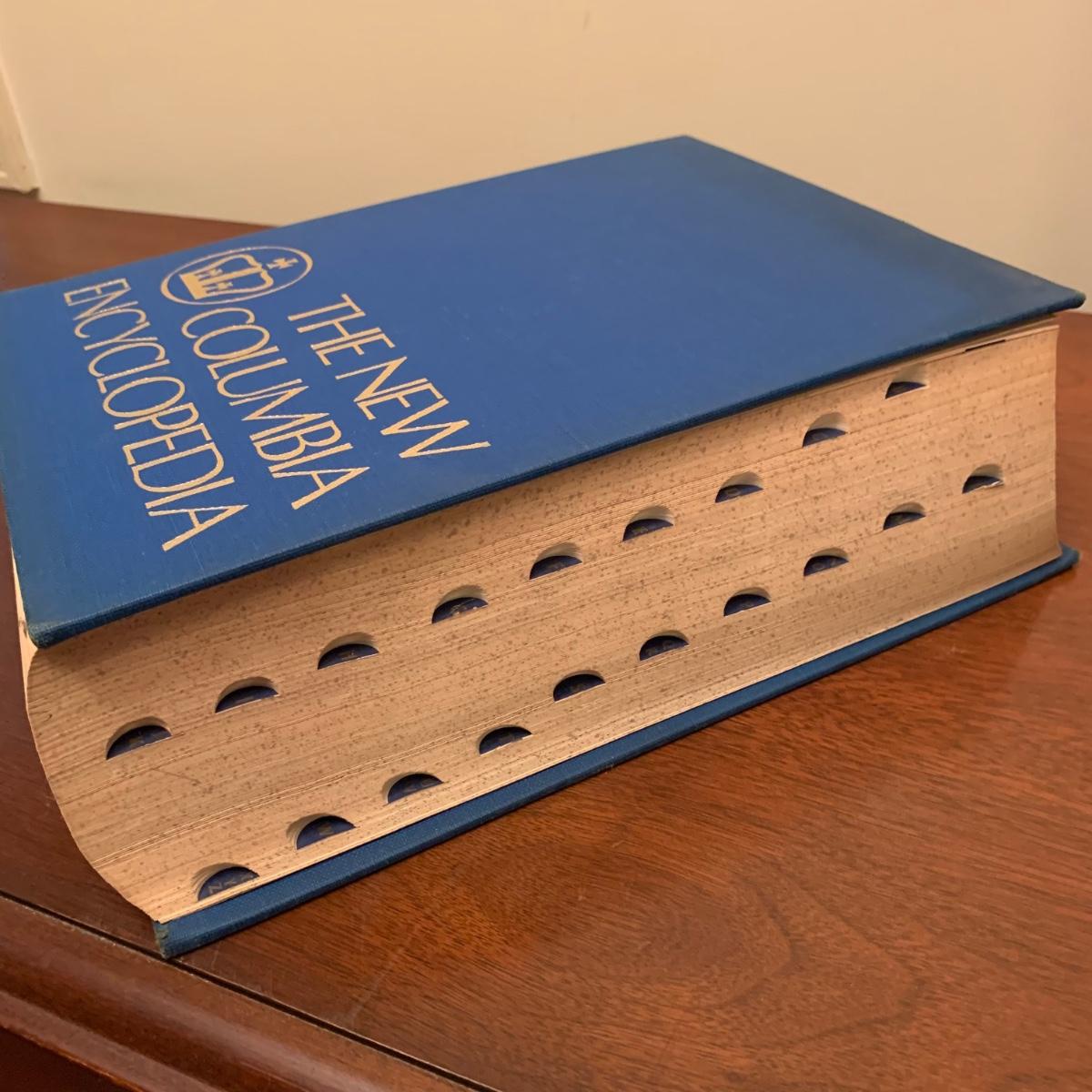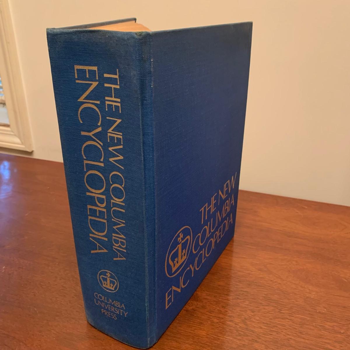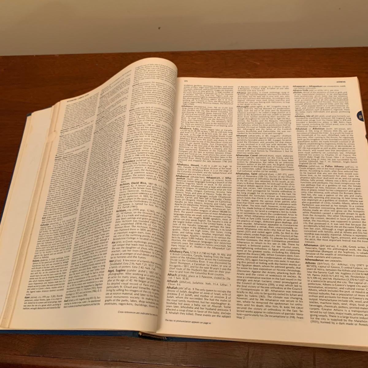 Five hardcover reference books in this collection, including The New Columbia Encyclopedia, Webster’s Third New International Dictionary three volume set, and The New York Public Library Book of Chronologies. The set of Webster’s dictionaries are in very good condition with covers that look like new. The Book of Chronologies has a bit of wear mostly shown on its dust cover. The cover of the encyclopedia feels worn but is intact. The binding is a bit loose. All books have dust on the tops of their pages. The encyclopedia is quite large and heavy. It measures 9.5” x 3.5” x 12.25”.