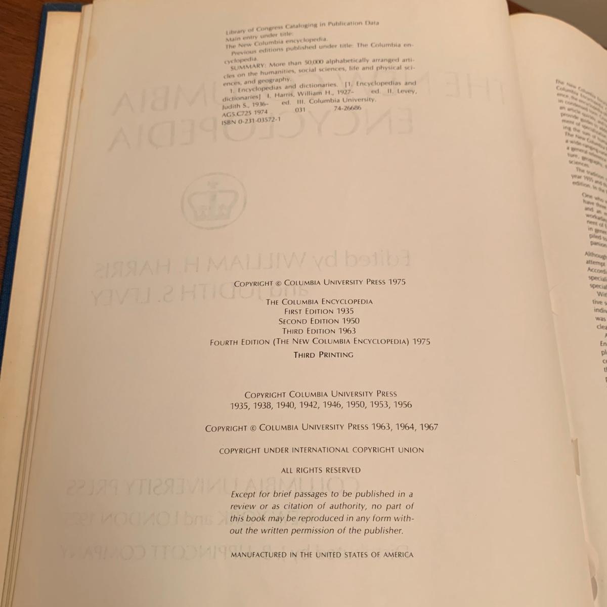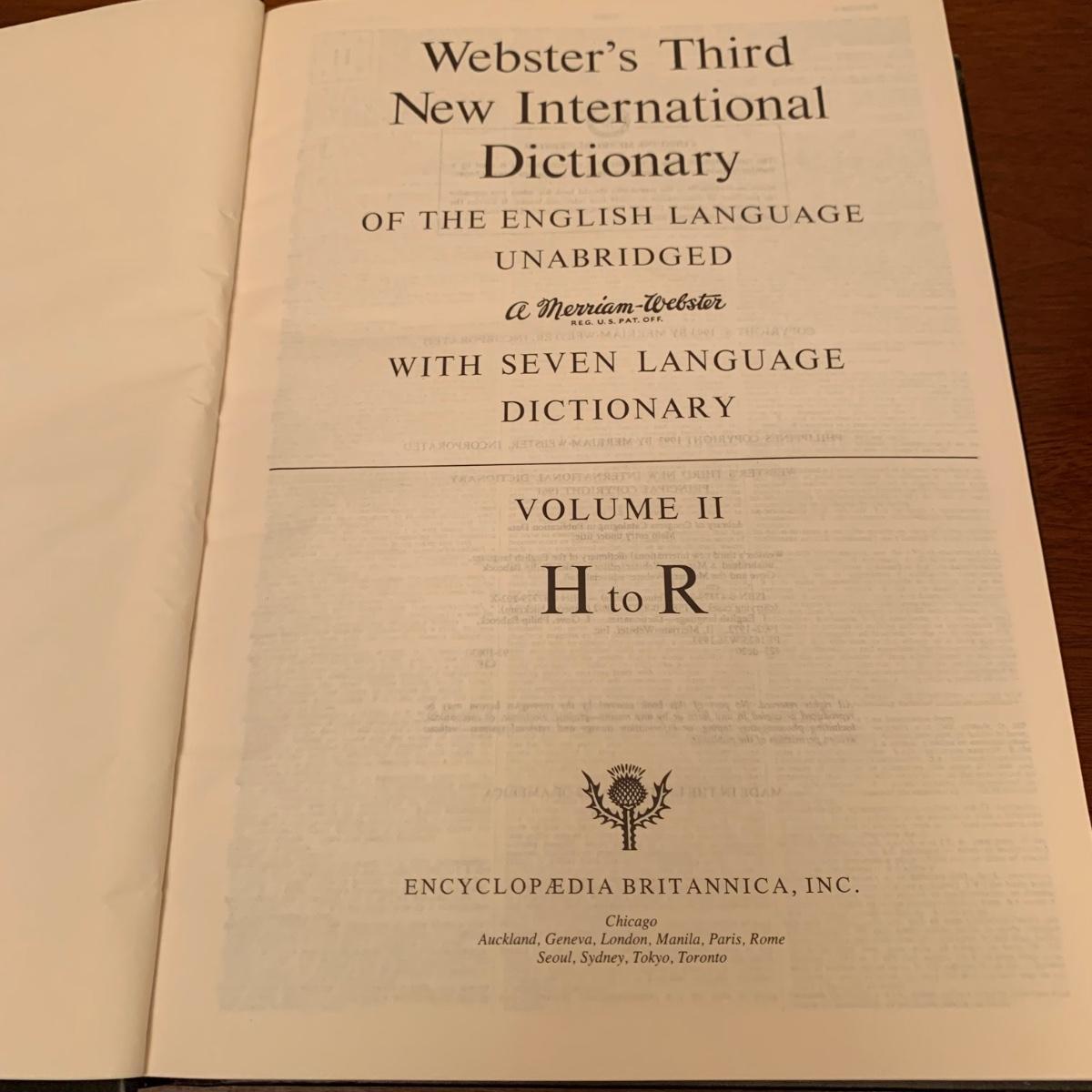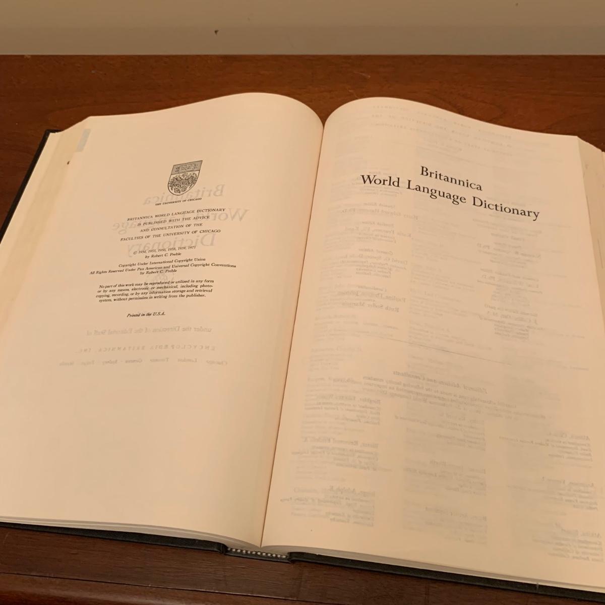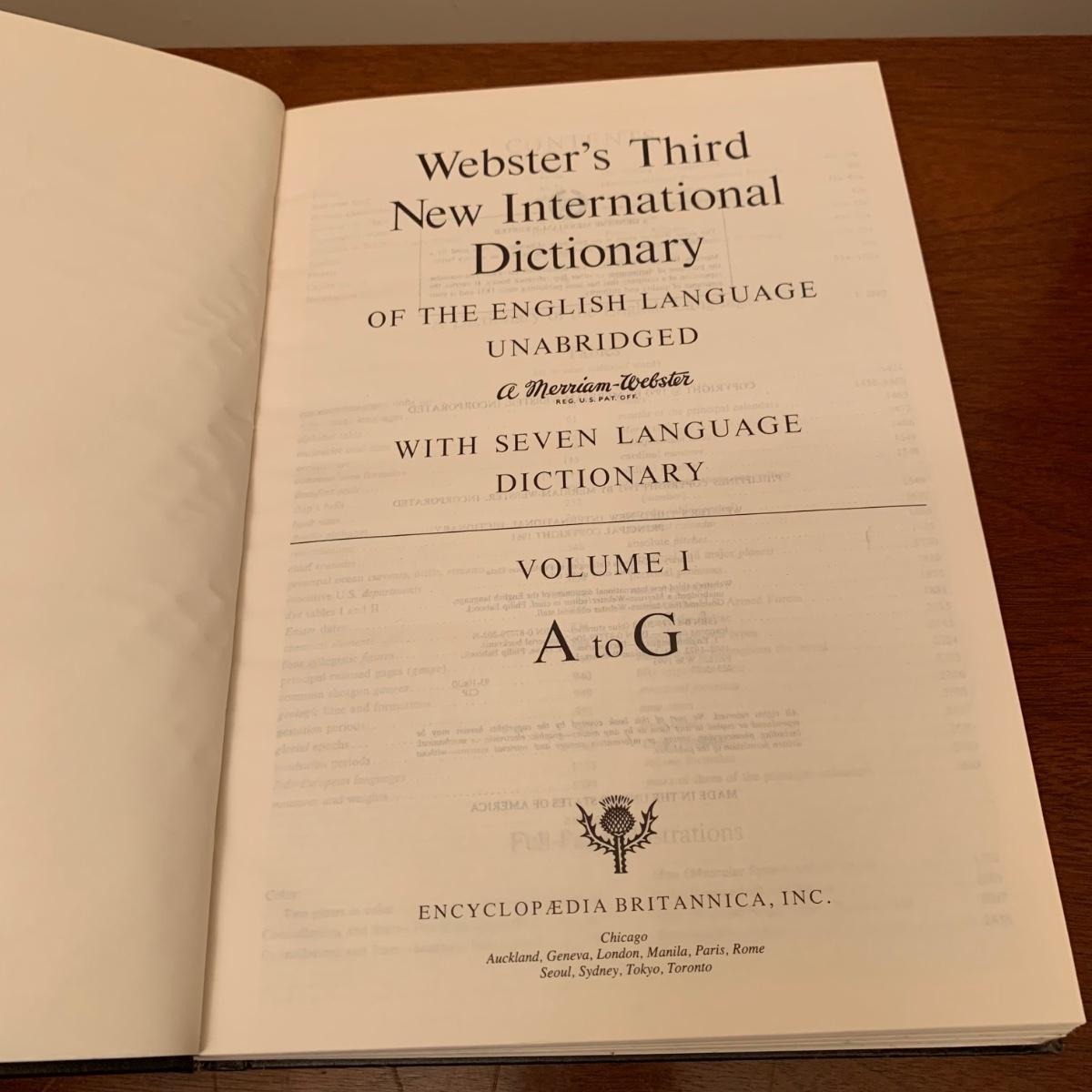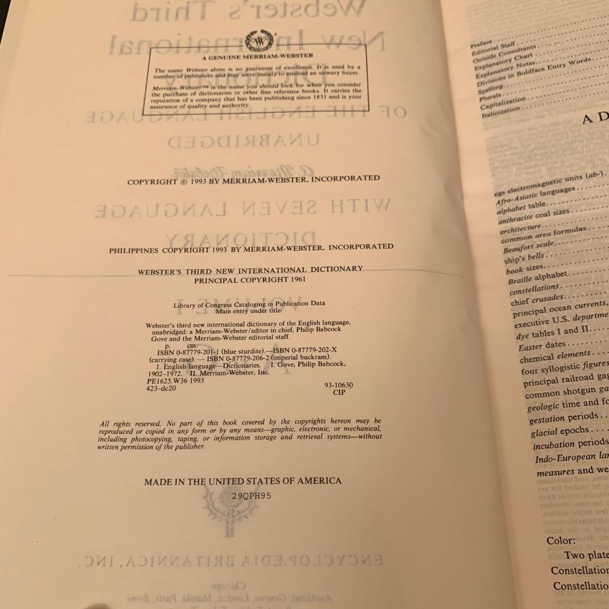 Five hardcover reference books in this collection, including The New Columbia Encyclopedia, Webster’s Third New International Dictionary three volume set, and The New York Public Library Book of Chronologies. The set of Webster’s dictionaries are in very good condition with covers that look like new. The Book of Chronologies has a bit of wear mostly shown on its dust cover. The cover of the encyclopedia feels worn but is intact. The binding is a bit loose. All books have dust on the tops of their pages. The encyclopedia is quite large and heavy. It measures 9.5” x 3.5” x 12.25”.