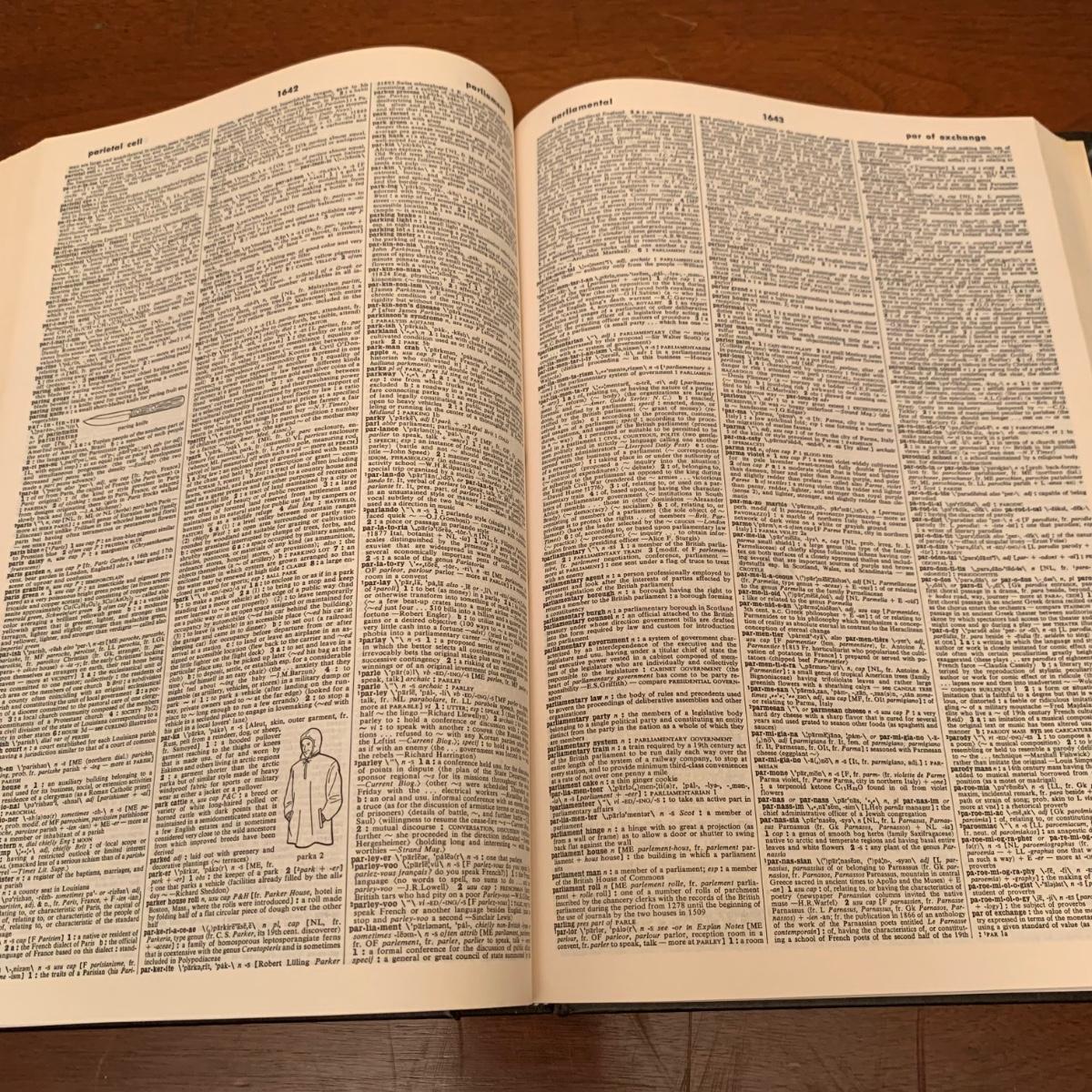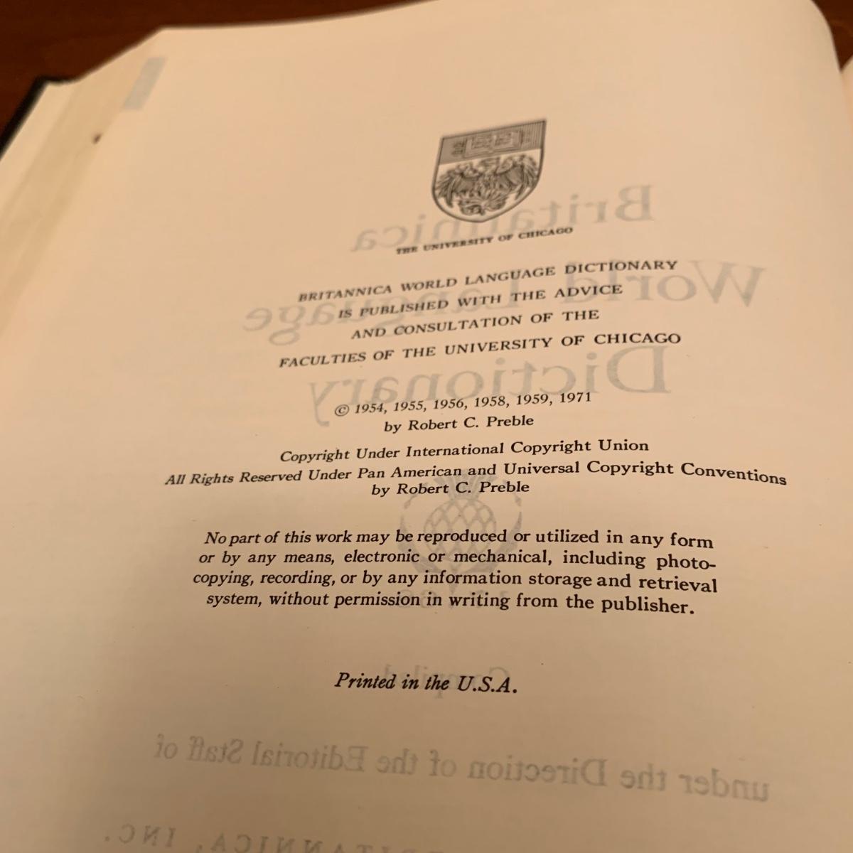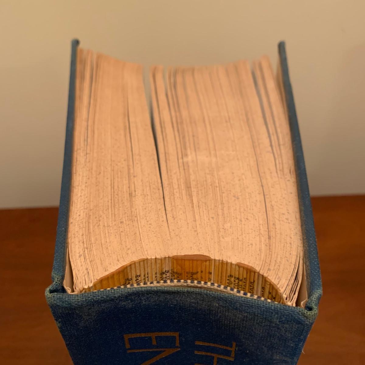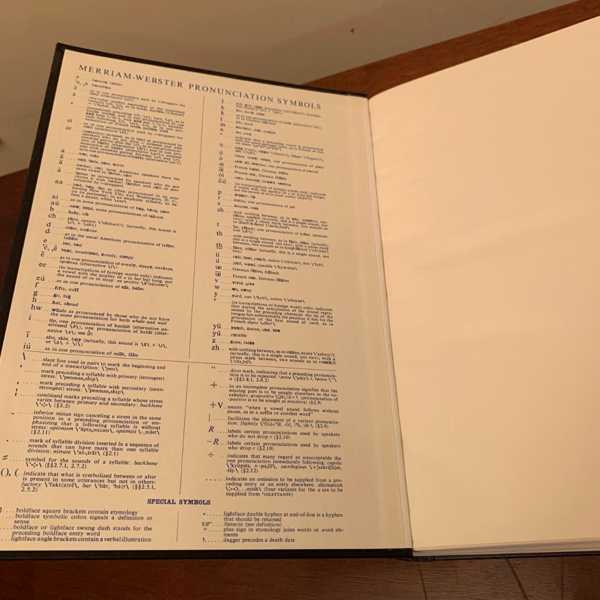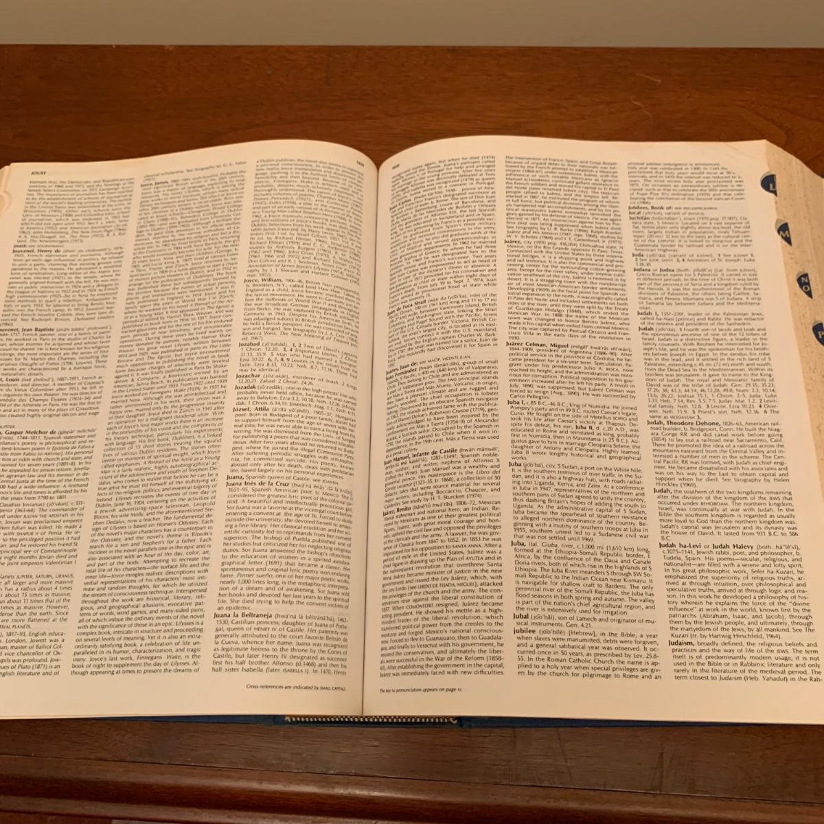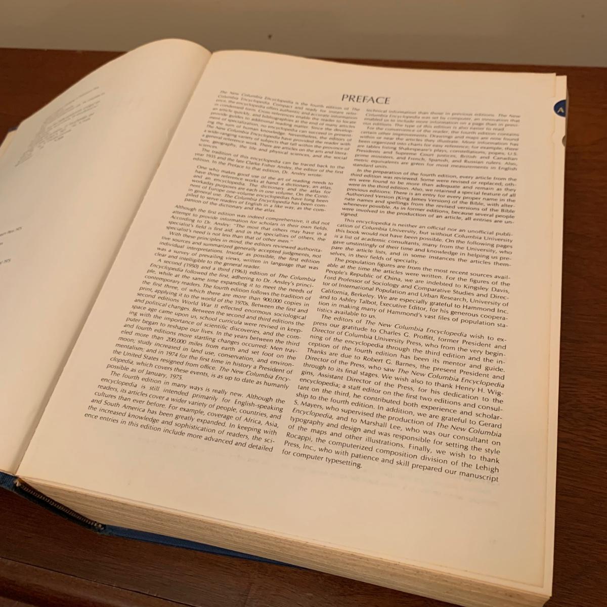 Five hardcover reference books in this collection, including The New Columbia Encyclopedia, Webster’s Third New International Dictionary three volume set, and The New York Public Library Book of Chronologies. The set of Webster’s dictionaries are in very good condition with covers that look like new. The Book of Chronologies has a bit of wear mostly shown on its dust cover. The cover of the encyclopedia feels worn but is intact. The binding is a bit loose. All books have dust on the tops of their pages. The encyclopedia is quite large and heavy. It measures 9.5” x 3.5” x 12.25”.