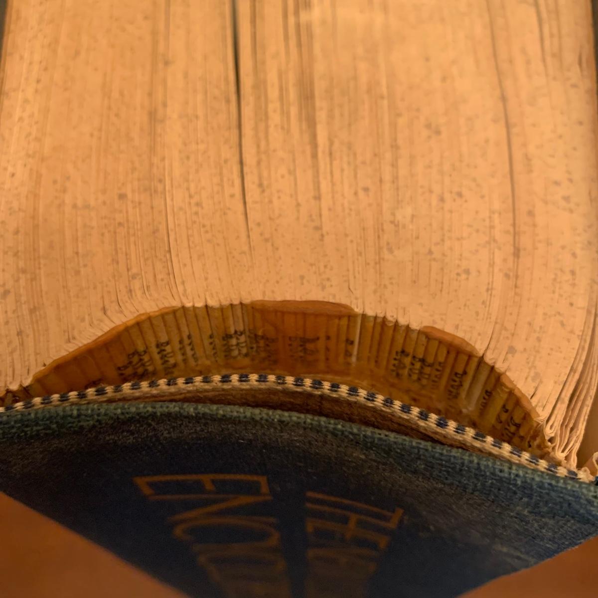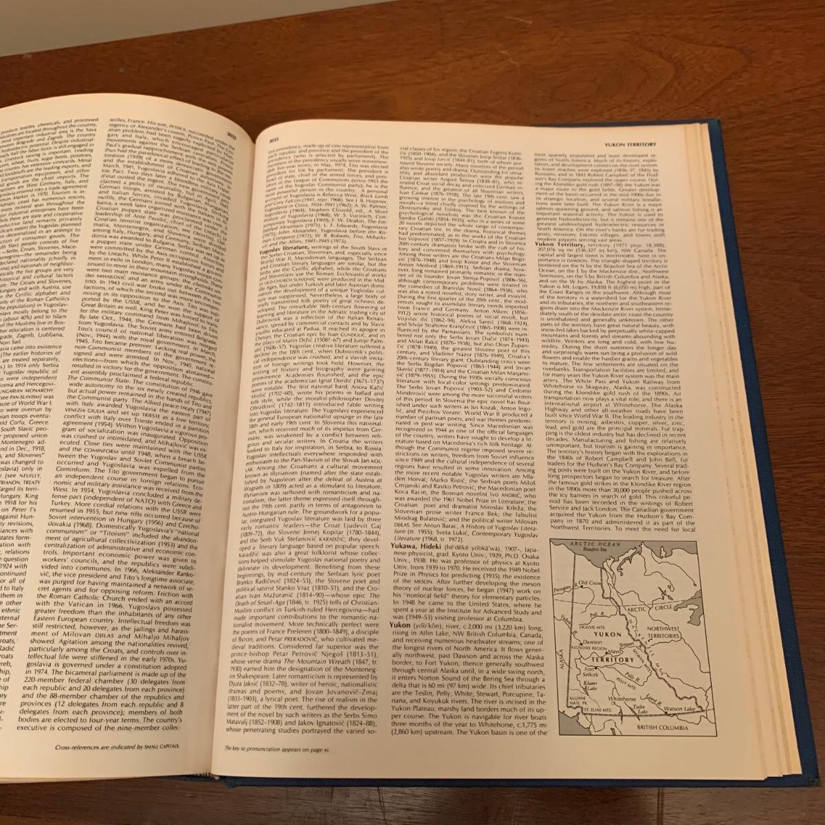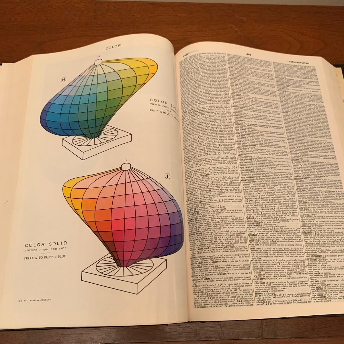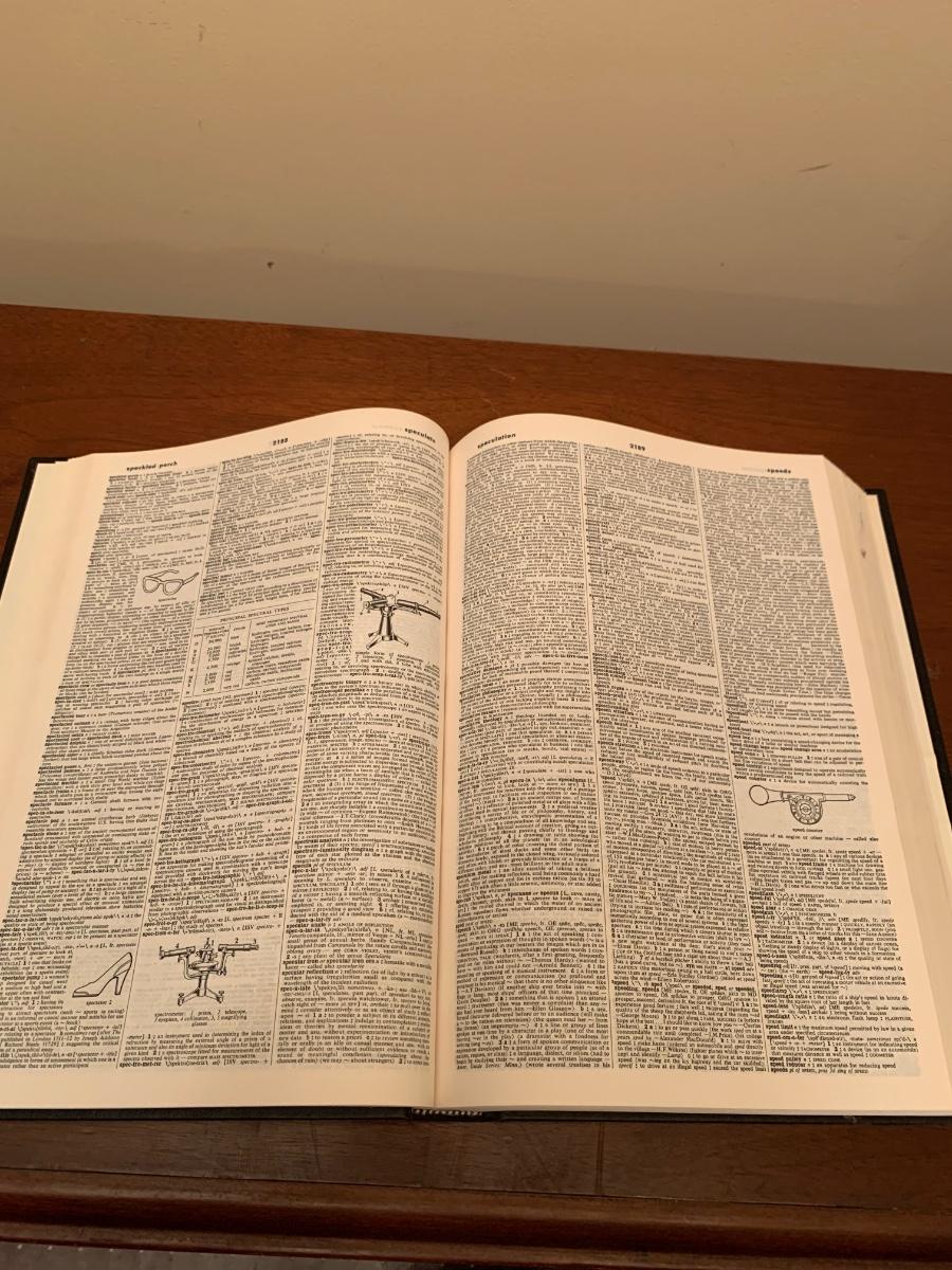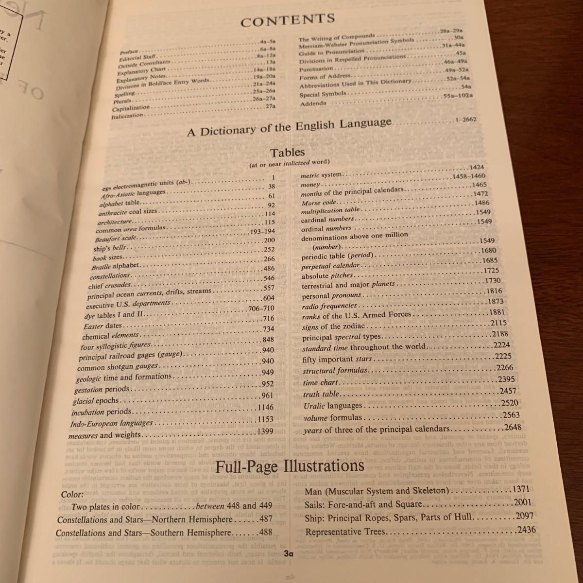 Five hardcover reference books in this collection, including The New Columbia Encyclopedia, Webster’s Third New International Dictionary three volume set, and The New York Public Library Book of Chronologies. The set of Webster’s dictionaries are in very good condition with covers that look like new. The Book of Chronologies has a bit of wear mostly shown on its dust cover. The cover of the encyclopedia feels worn but is intact. The binding is a bit loose. All books have dust on the tops of their pages. The encyclopedia is quite large and heavy. It measures 9.5” x 3.5” x 12.25”.