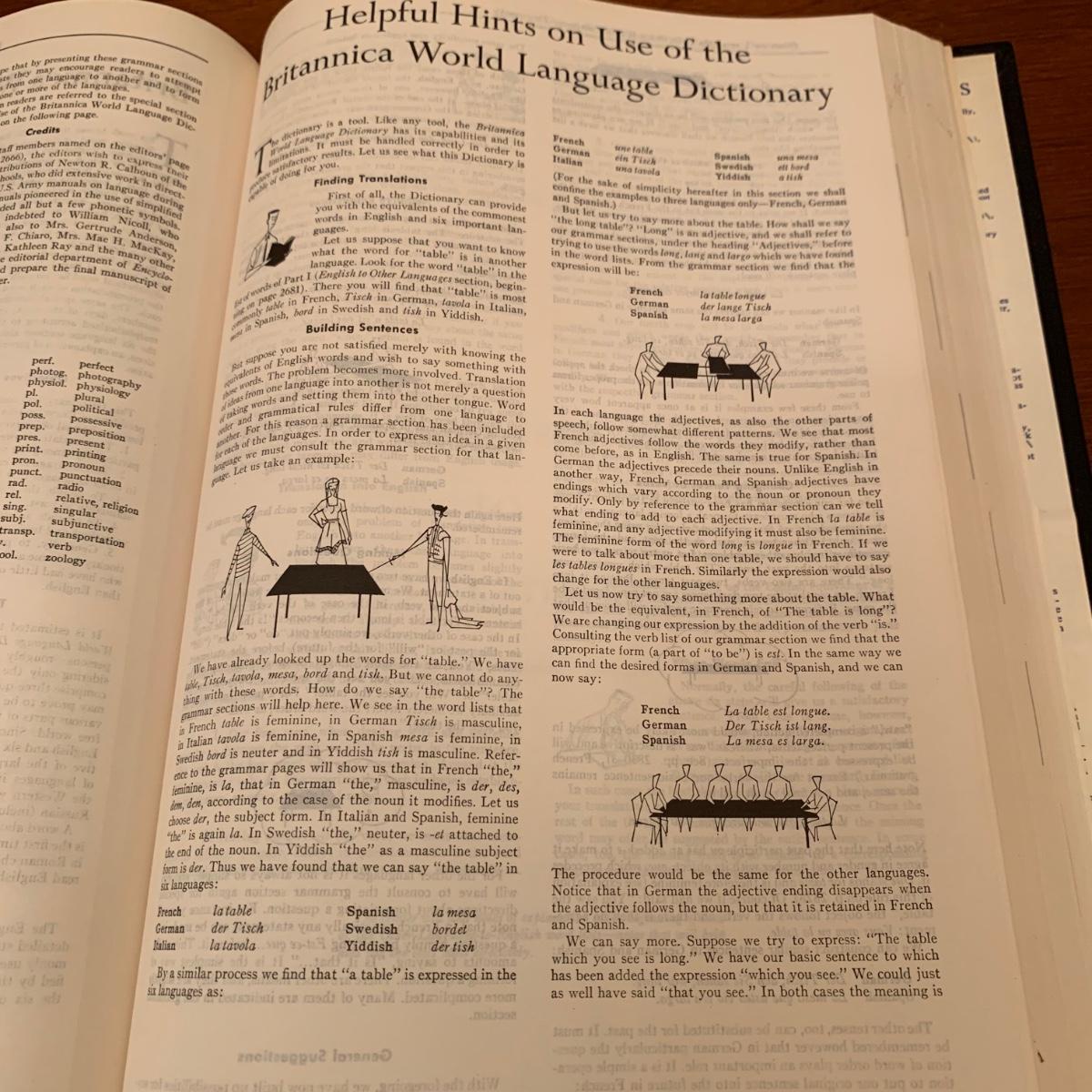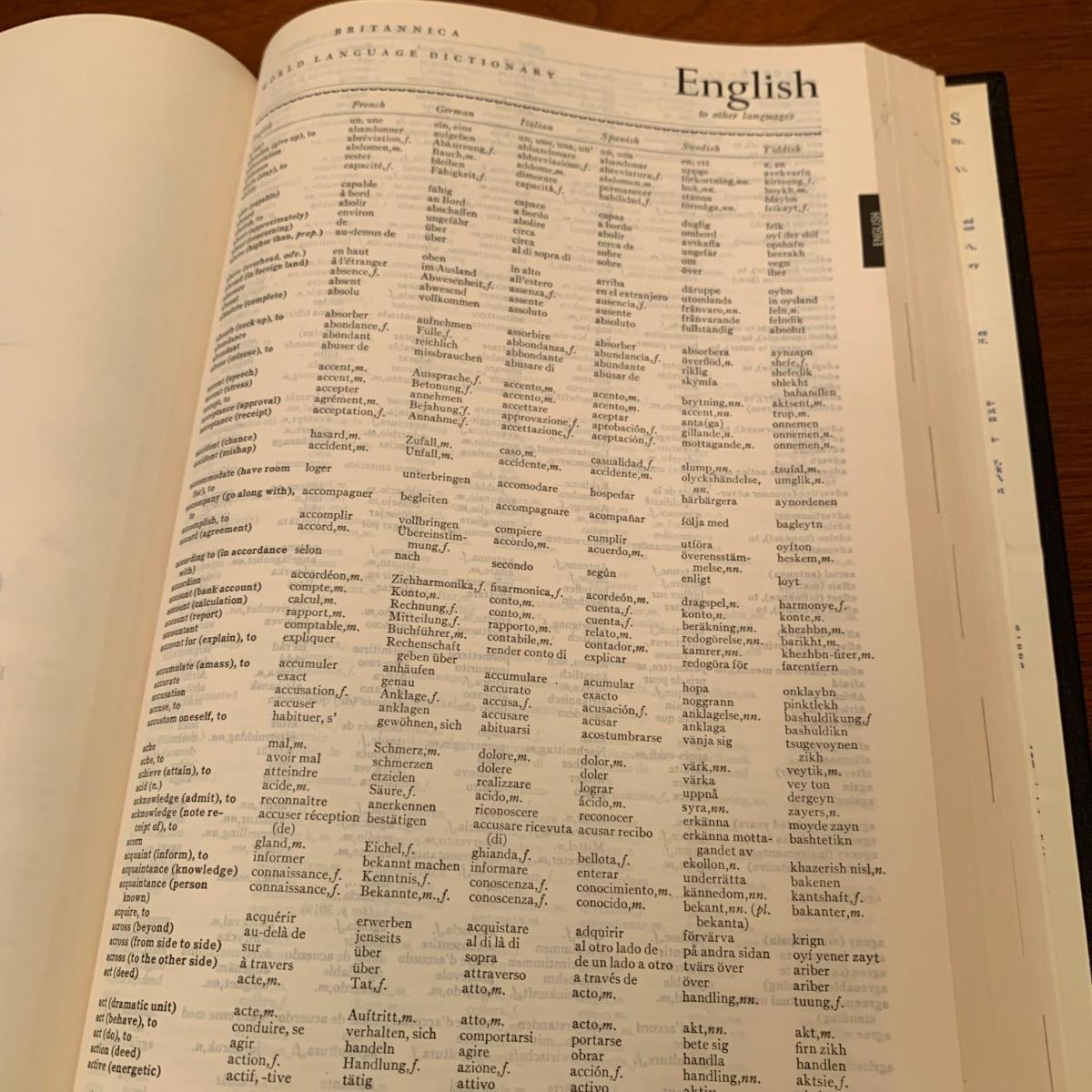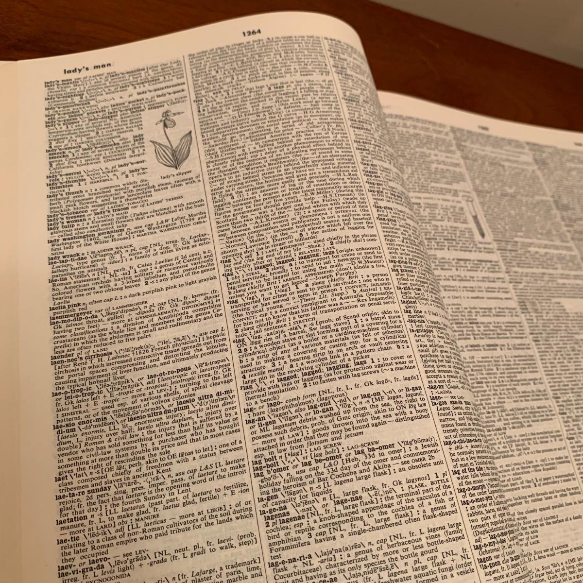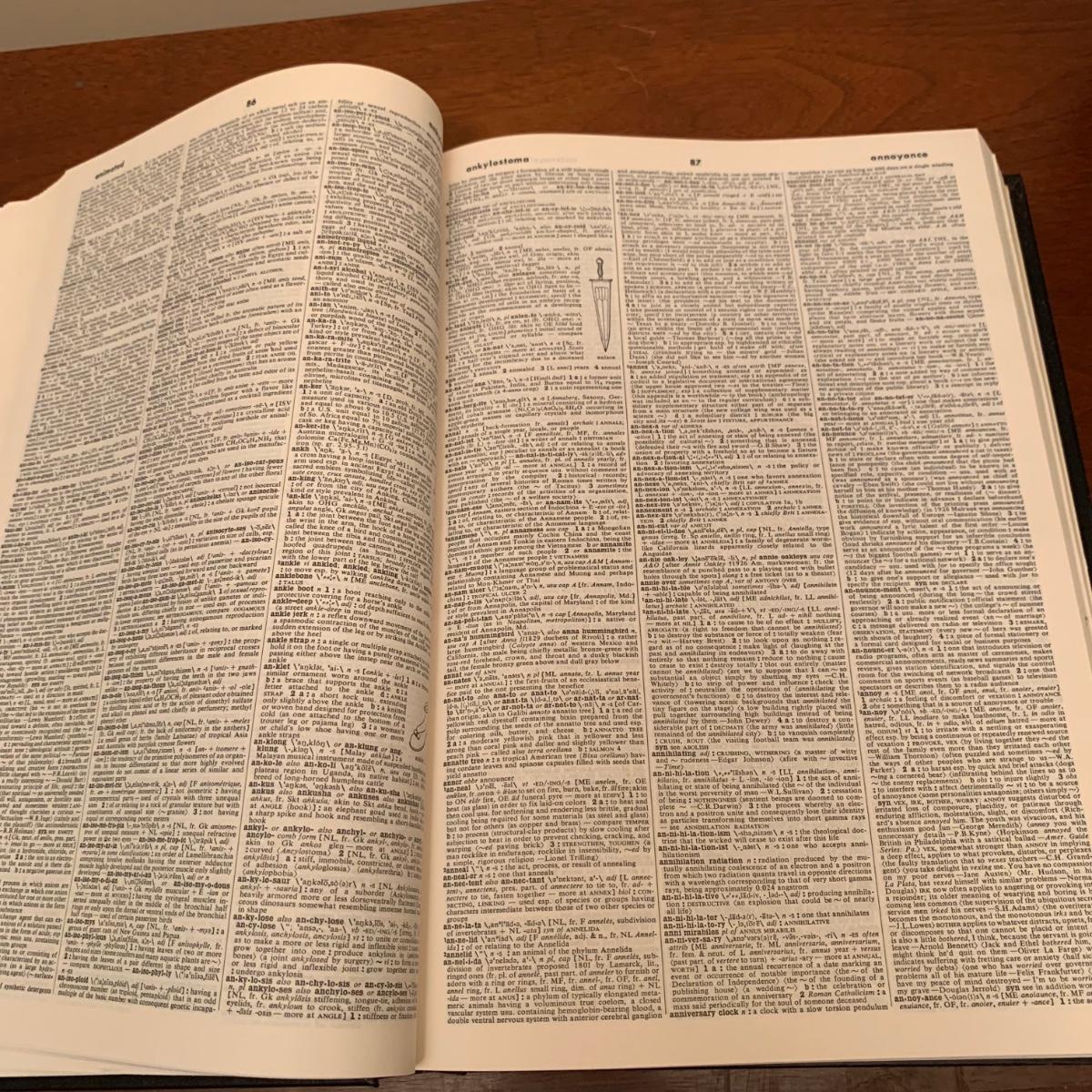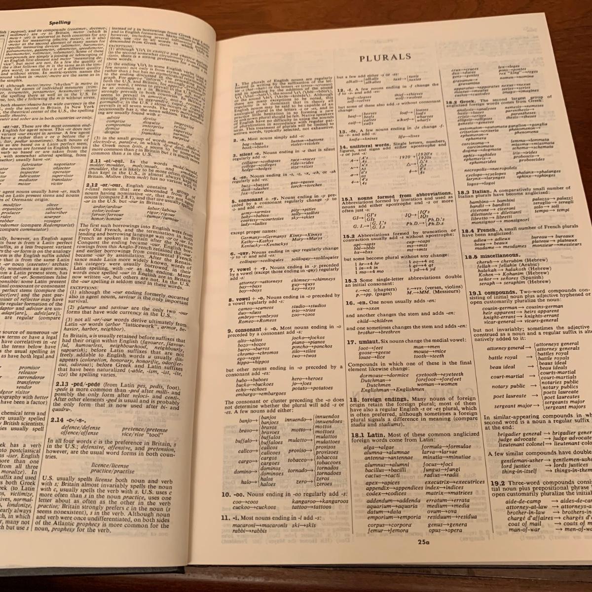 Five hardcover reference books in this collection, including The New Columbia Encyclopedia, Webster’s Third New International Dictionary three volume set, and The New York Public Library Book of Chronologies. The set of Webster’s dictionaries are in very good condition with covers that look like new. The Book of Chronologies has a bit of wear mostly shown on its dust cover. The cover of the encyclopedia feels worn but is intact. The binding is a bit loose. All books have dust on the tops of their pages. The encyclopedia is quite large and heavy. It measures 9.5” x 3.5” x 12.25”.
