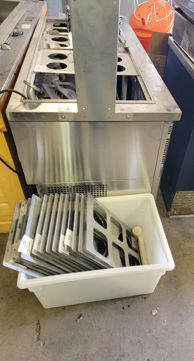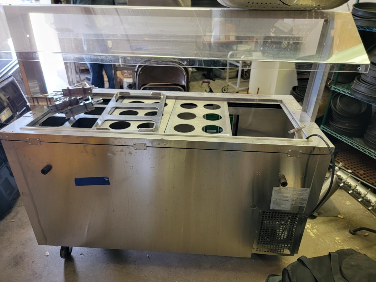 Refrigerated Salad Bar on wheels. 59" x 27.5" x 54"T, with extra Stainless steel inserts