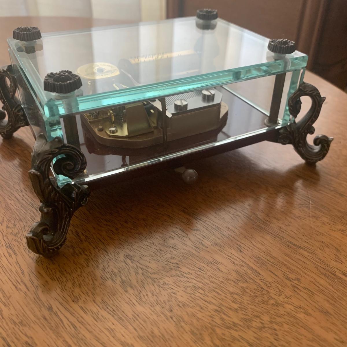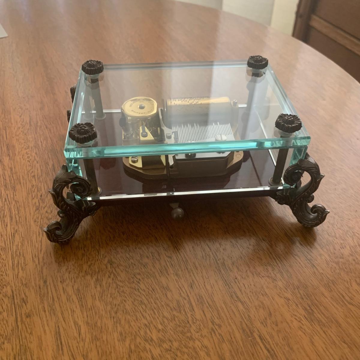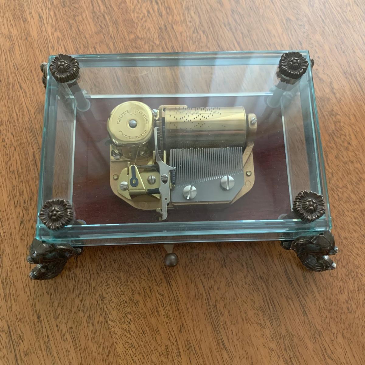 Lovely glass and metal on wood base Reuge music box that plays “I had the time of my life”. Lever move red to play but was slow to start and stalled out a bit. Likely just needs to be lined up as is in great condition otherwise. Piece measures 7” x5” x3”. Shipping available