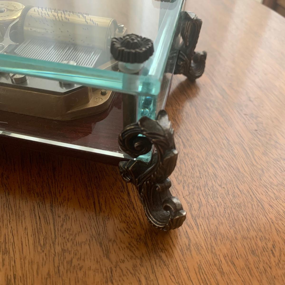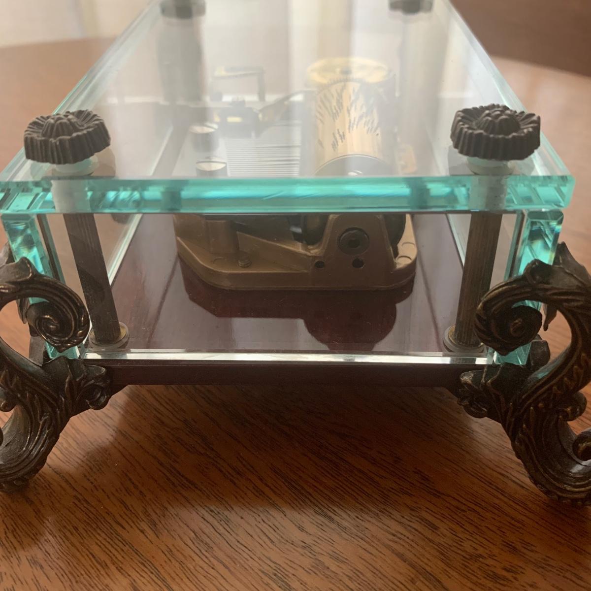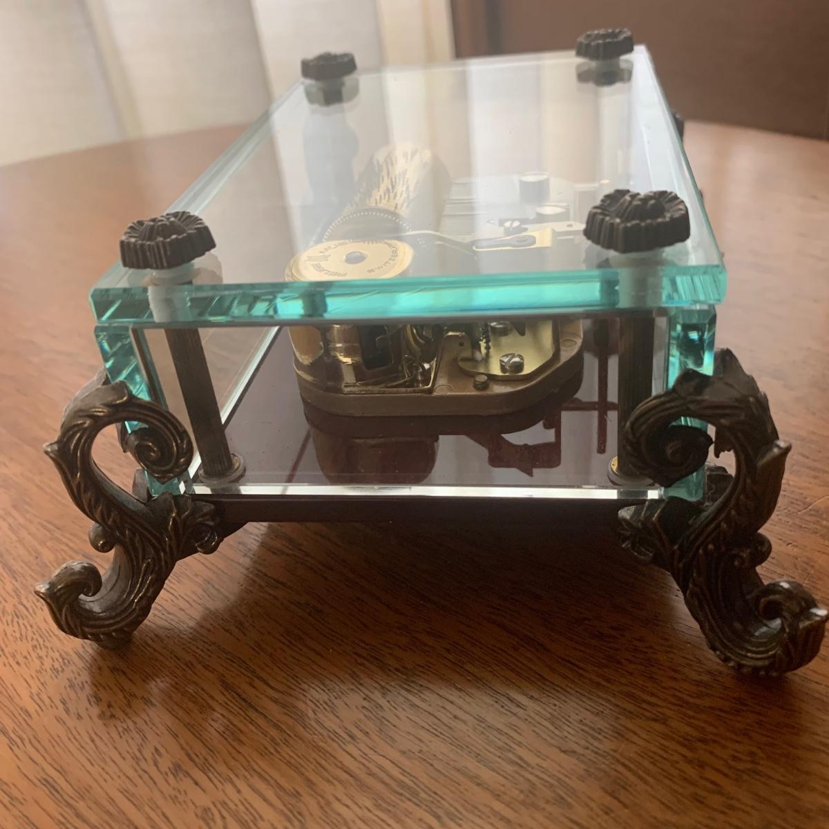 Lovely glass and metal on wood base Reuge music box that plays “I had the time of my life”. Lever move red to play but was slow to start and stalled out a bit. Likely just needs to be lined up as is in great condition otherwise. Piece measures 7” x5” x3”. Shipping available