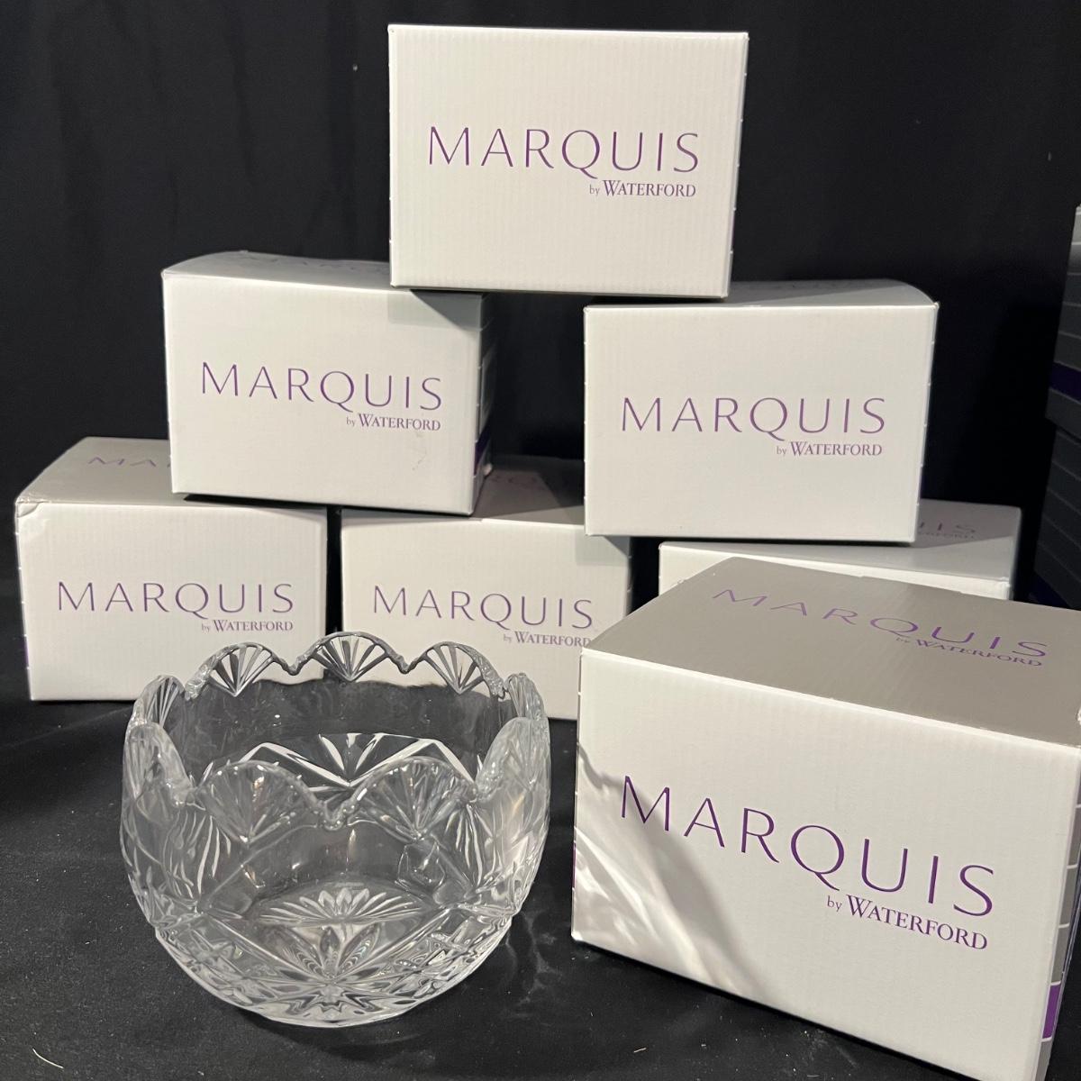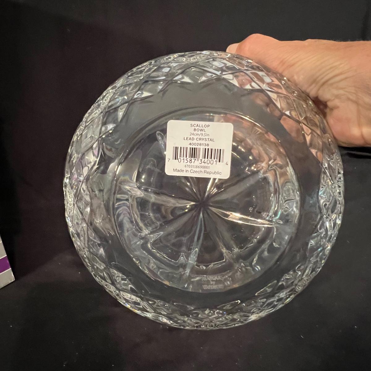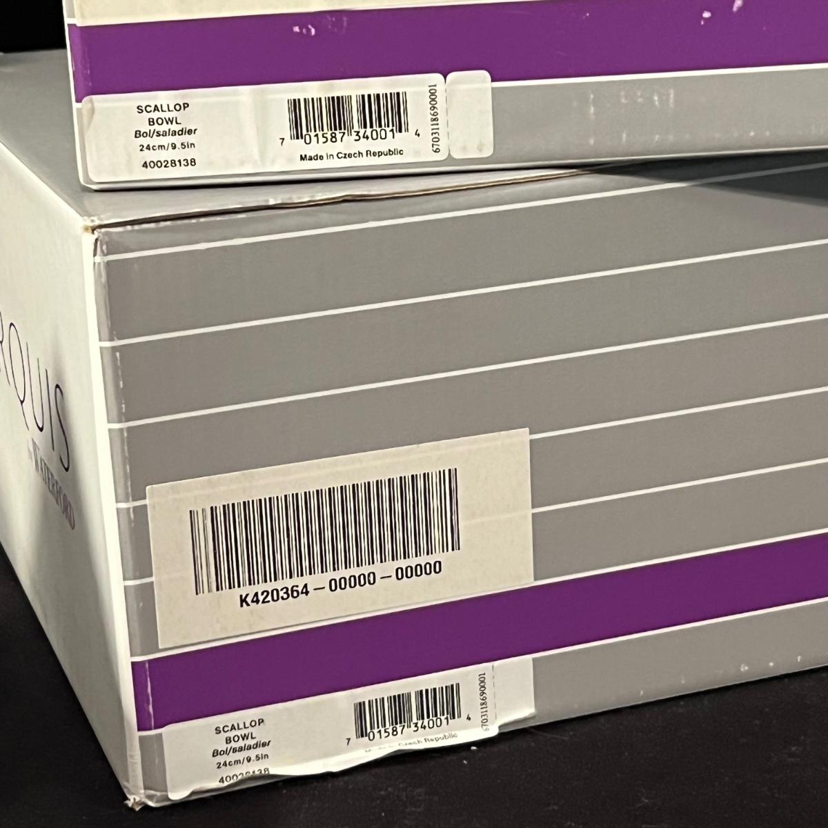 This lot of Waterford Crystal contains seven smaller and two large Scallop bowls. All but one smaller bowl comes with its box and most items appear to have not been unpacked. Note that some items were not unboxed to photograph. See images of labels for measurements.