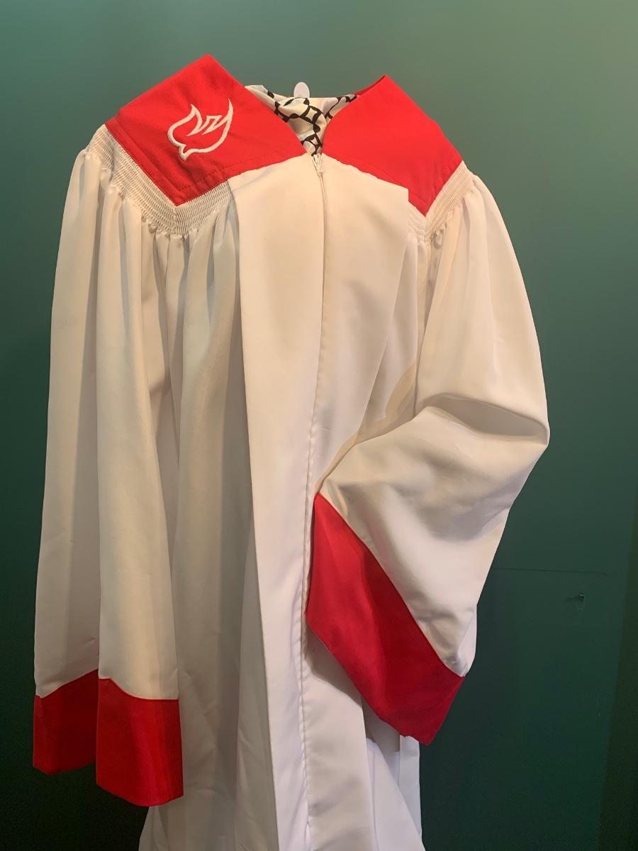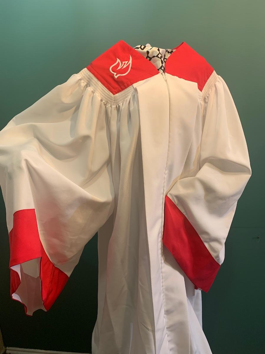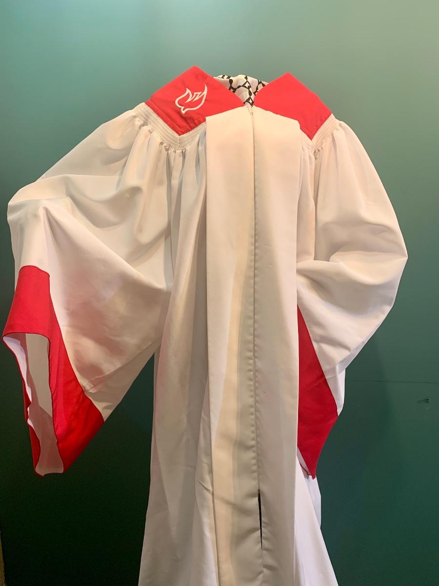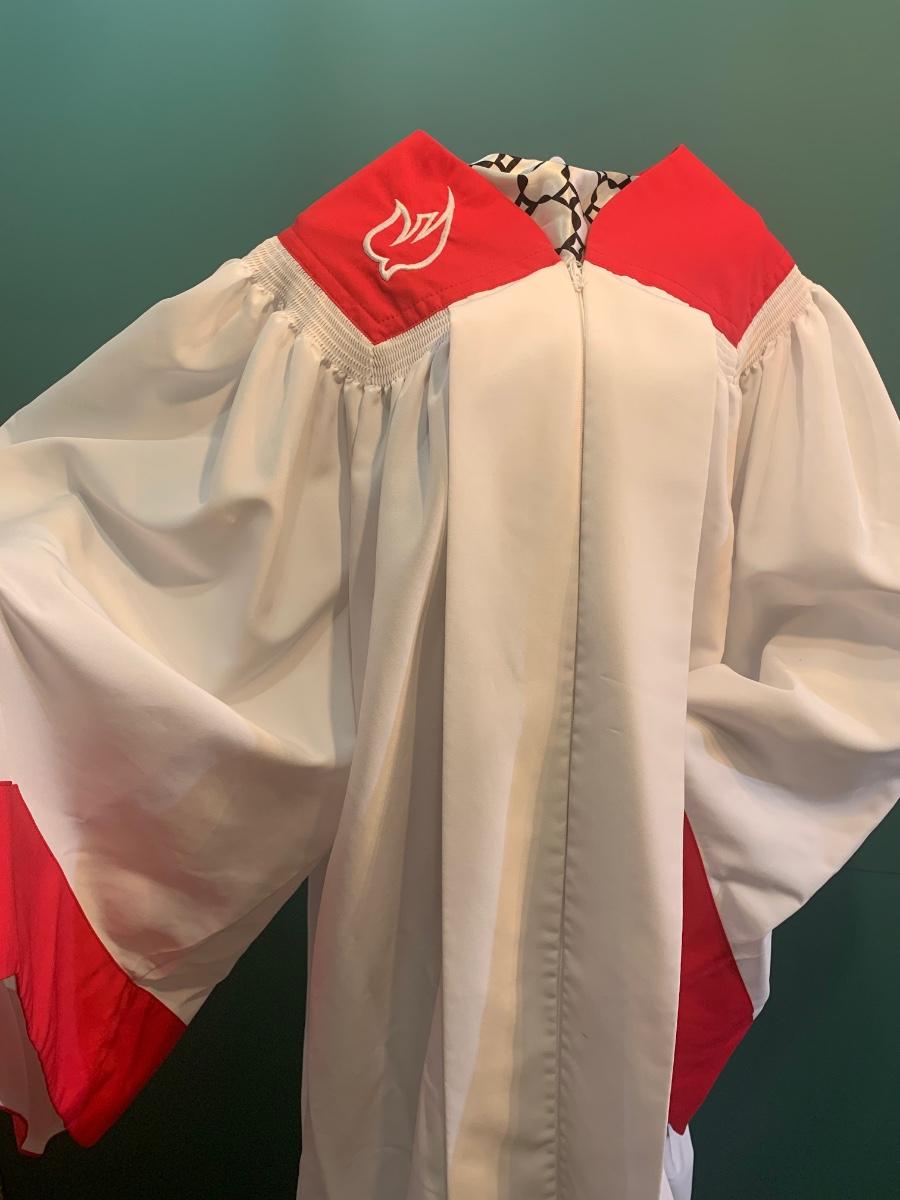 Embrace the spirit of harmony and grace with this American-made Regency choir robe in a striking red and white color combination. This size Large robe is not only a symbol of unity but also showcases an exquisite embroidered dove of peace on the bodice. Whether for choir performances, religious ceremonies, or special events, this robe is a beautiful testament to the message of peace and serenity. Make a statement and elevate your choir's presence with this elegant and meaningful garment. Accessories not included.