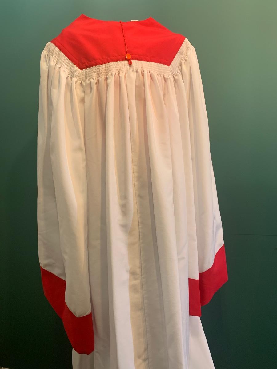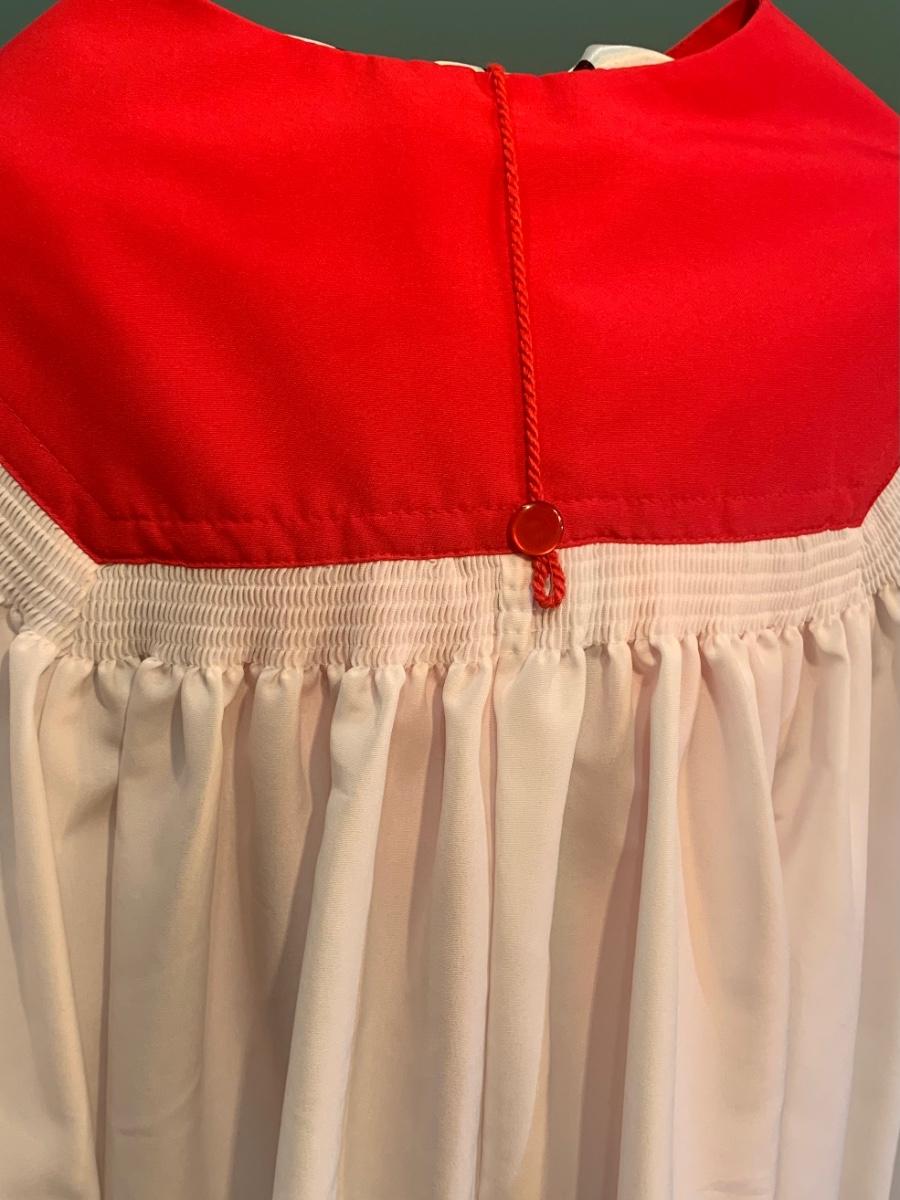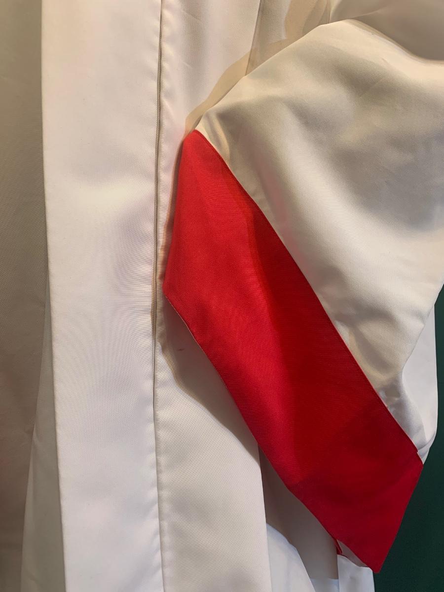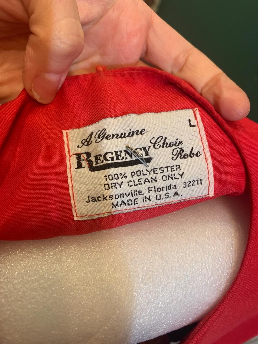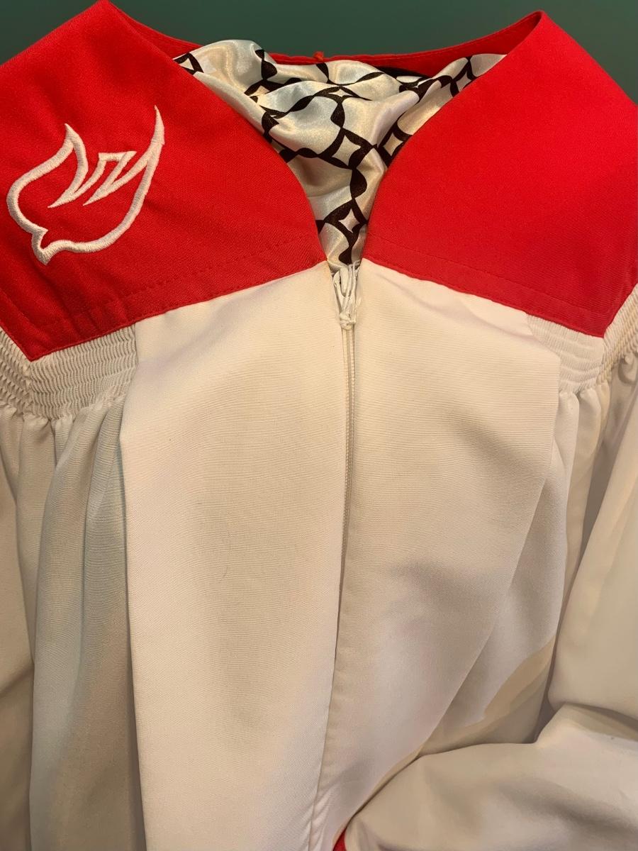 Embrace the spirit of harmony and grace with this American-made Regency choir robe in a striking red and white color combination. This size Large robe is not only a symbol of unity but also showcases an exquisite embroidered dove of peace on the bodice. Whether for choir performances, religious ceremonies, or special events, this robe is a beautiful testament to the message of peace and serenity. Make a statement and elevate your choir's presence with this elegant and meaningful garment. Accessories not included.