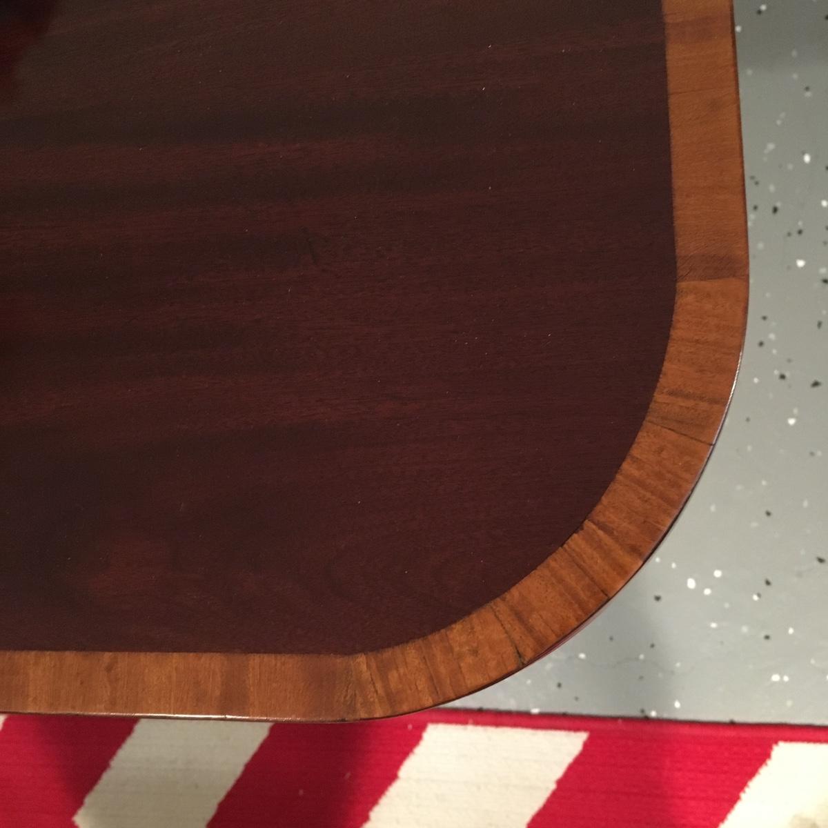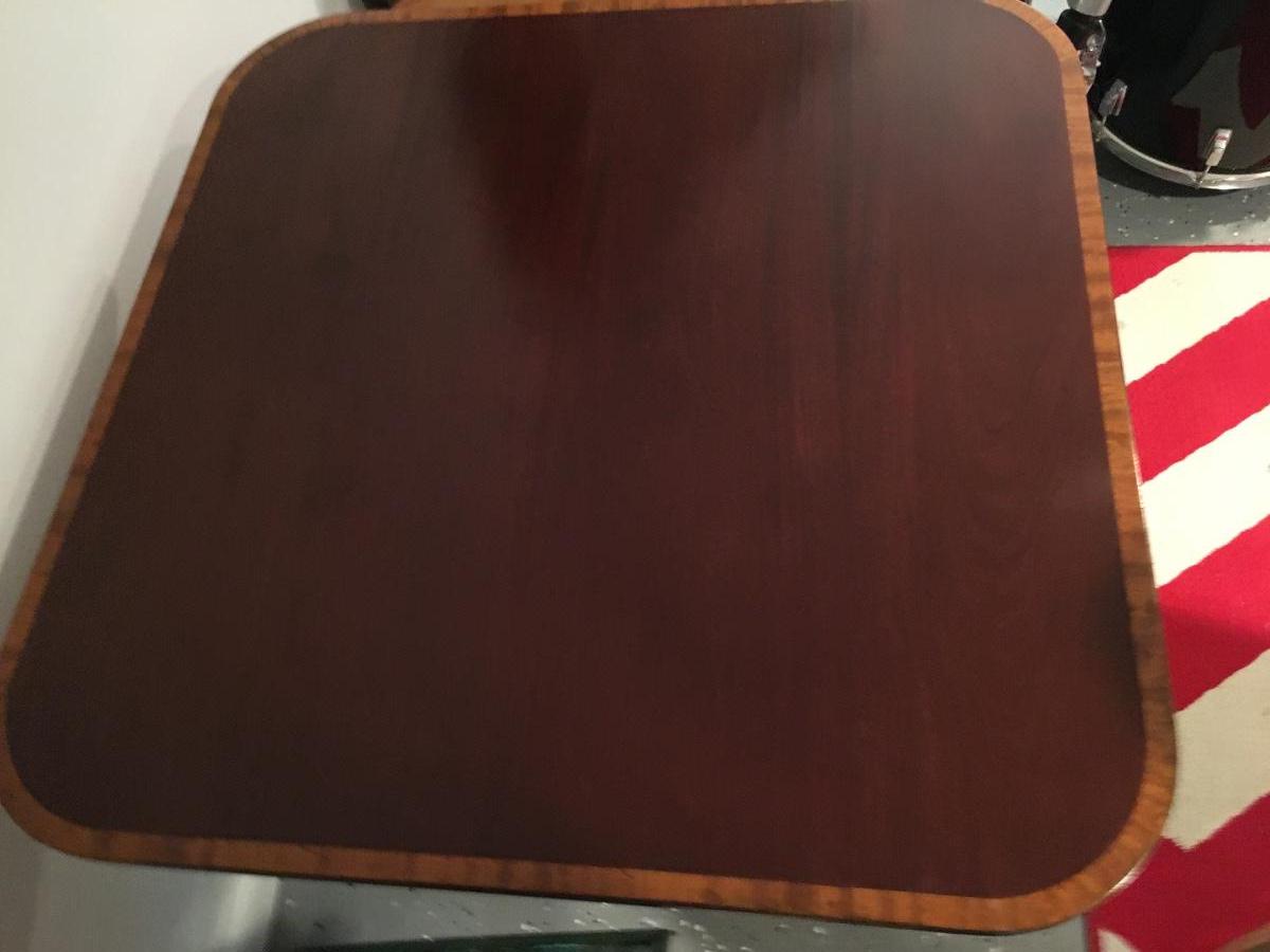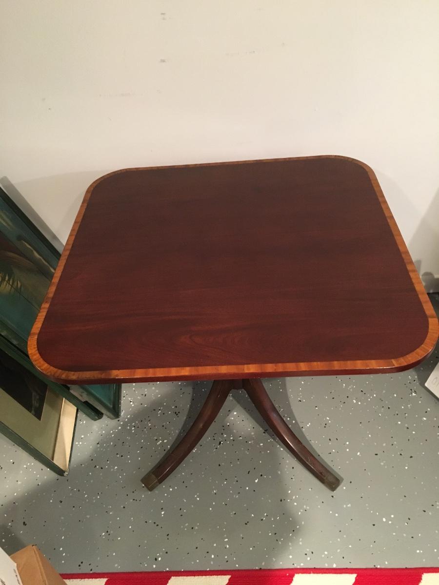 Regency Style mahogany breakfast table, standing on swept legs with Box Brass tips and a turned column. Circa 1920 The top having wonderful grains to the timbers and also features a triple cross band of Rosewood, Satinwood and ebony and boxwood lines. In mostly excellent condition with slight signs of wear commesurate with age. Comes with table pad.