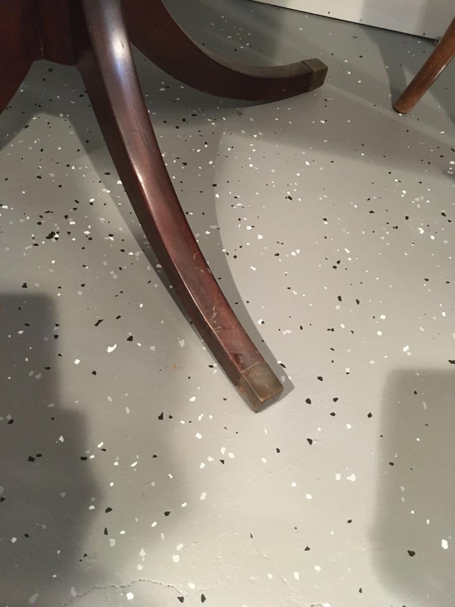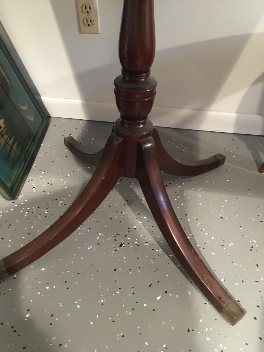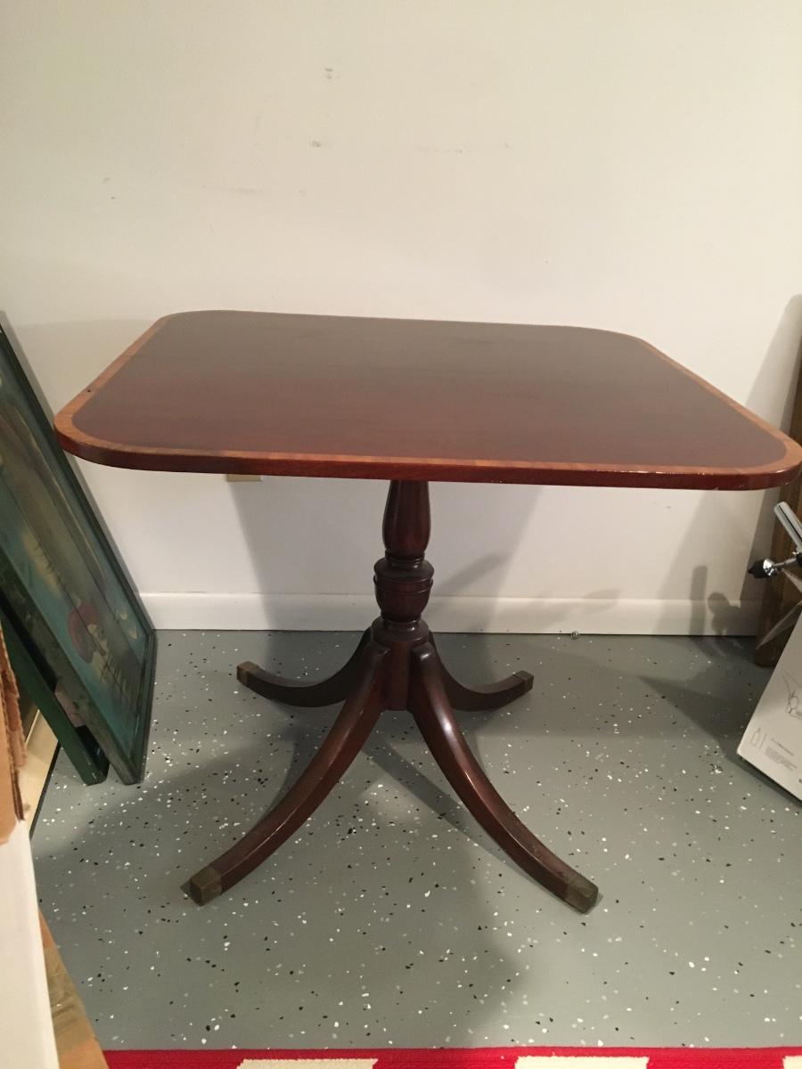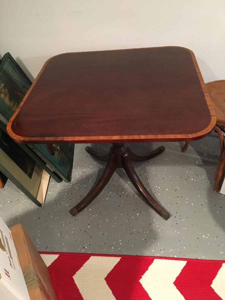 Regency Style mahogany breakfast table, standing on swept legs with Box Brass tips and a turned column. Circa 1920 The top having wonderful grains to the timbers and also features a triple cross band of Rosewood, Satinwood and ebony and boxwood lines. In mostly excellent condition with slight signs of wear commesurate with age. Comes with table pad.