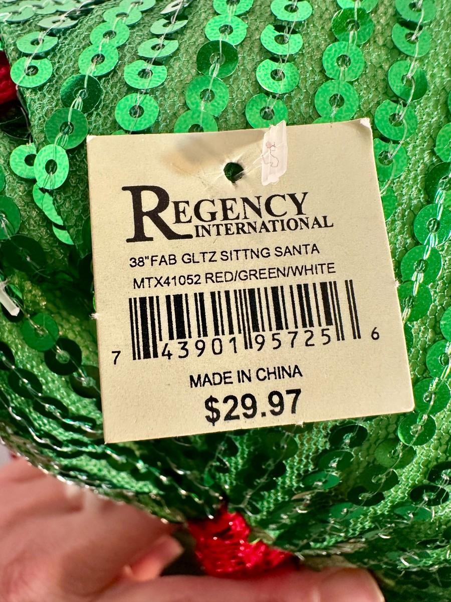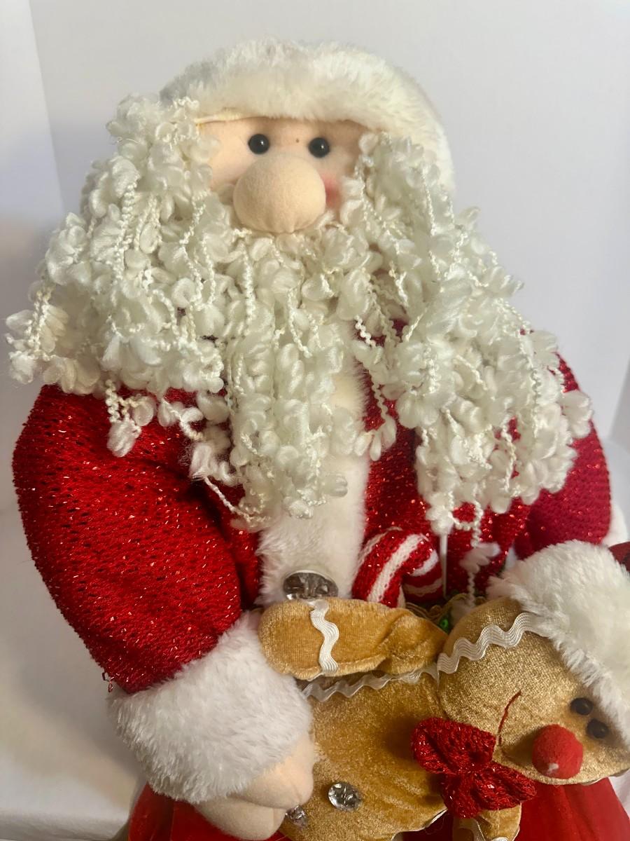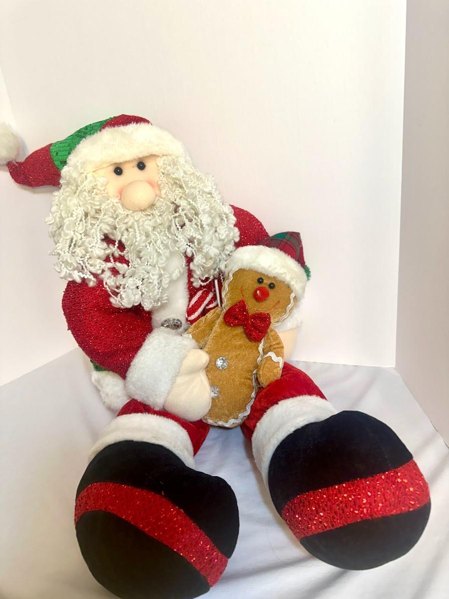 Has original tag. Has flat bottom so can sit on edge of fireplace mantle, table, chair, etc. Holds gingerbread on his lap but left hand stitch is not connected.