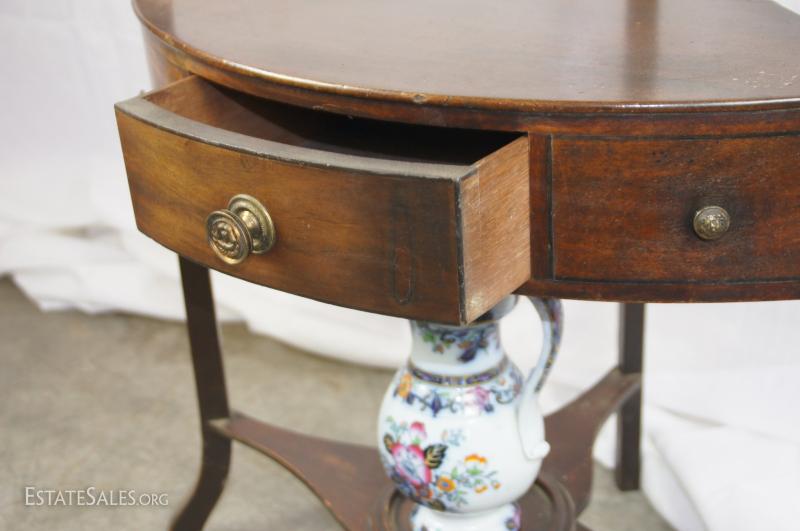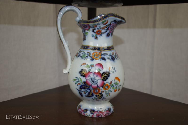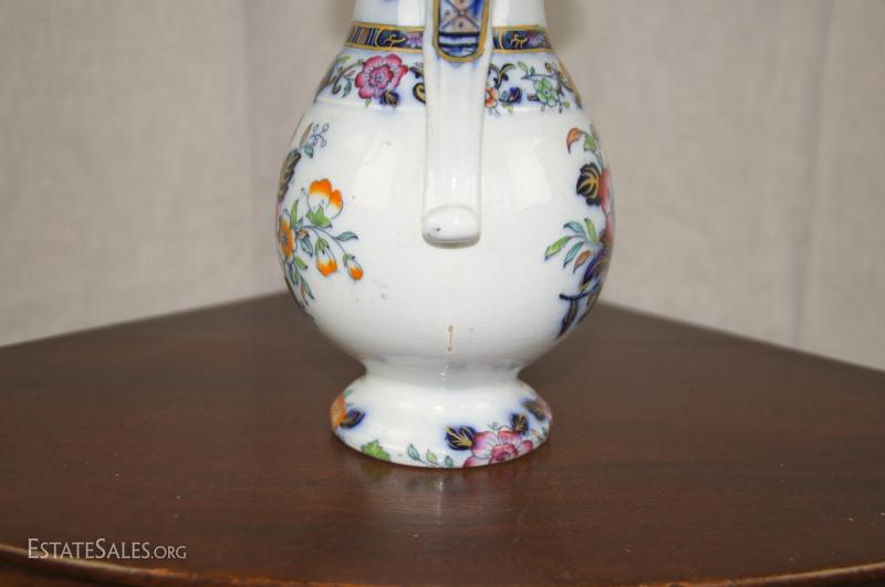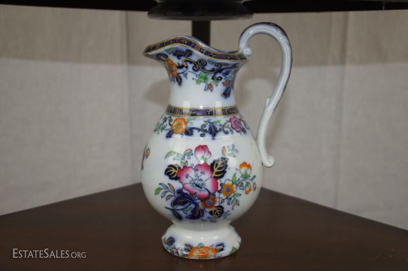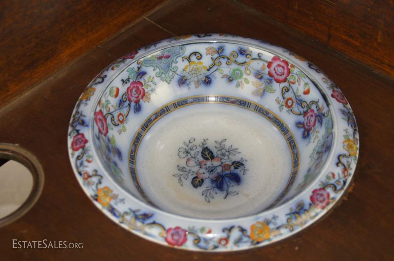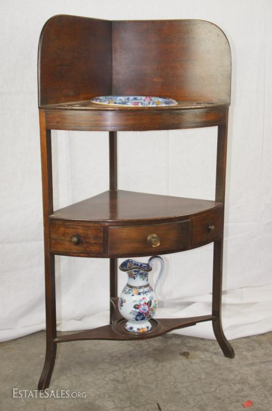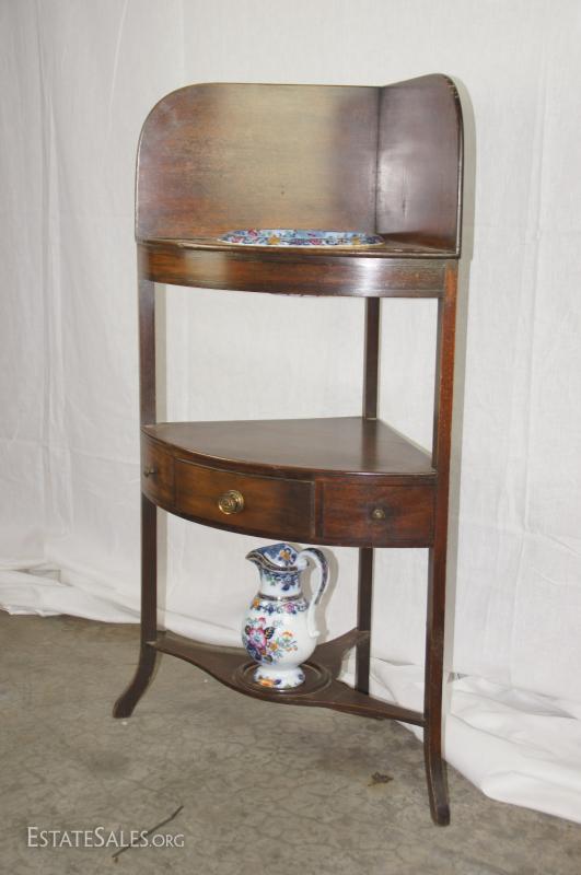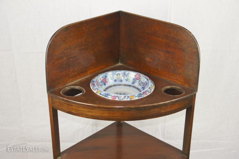 Regency mahogany corner washstand with later English ceramic wash basin/bowl and ewer/pitcher, early 19th century