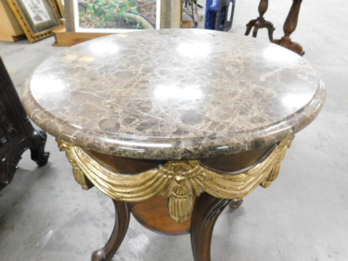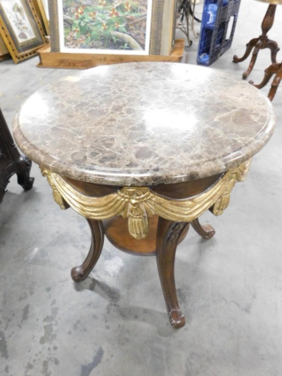 Regency Marble Top Mahogany Finish Side Table with Gilt Drape Accent and Stretcher Shelf Choice #2 of 2 Expect some wear or scratches to finish. Shipping option available via freight or local mover at Buyer's expense. Buyer must have all shipping scheduled within the stated dates and times of pickup. Recommended local mover is Beaty Bros. Moving 828-201-2982