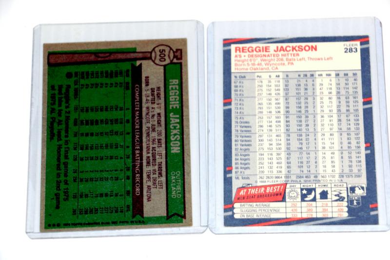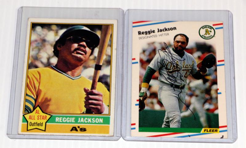 Reggie Jackson Signed Fleer #283 (1988) baseball card plus Reggie Jackson Topps 500 (1976) baseball card, nice condition.
