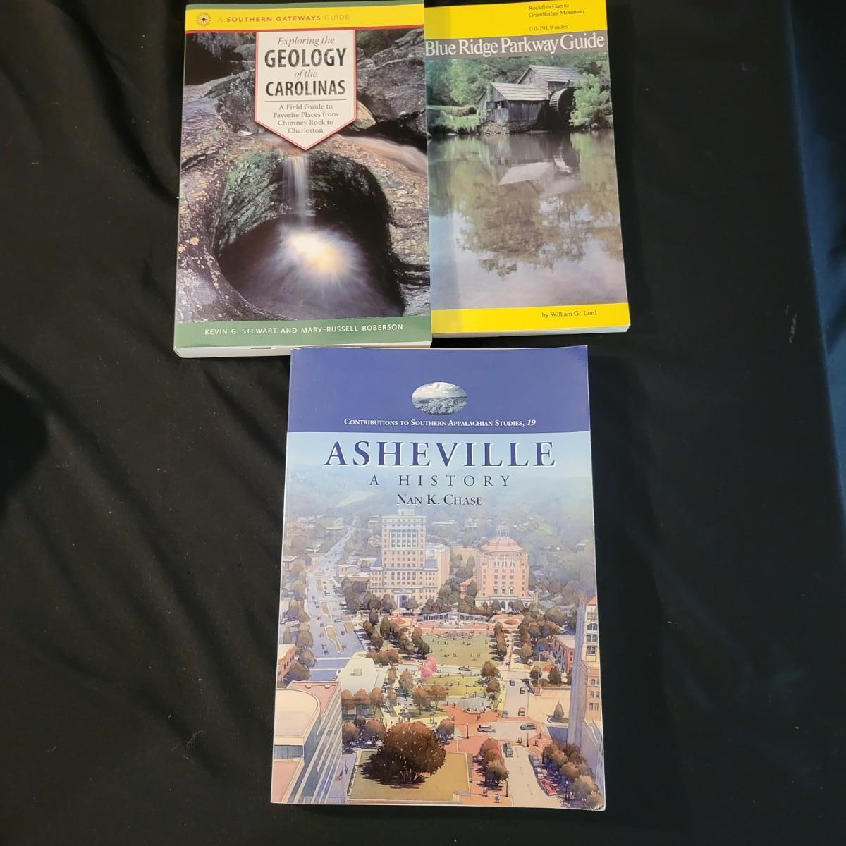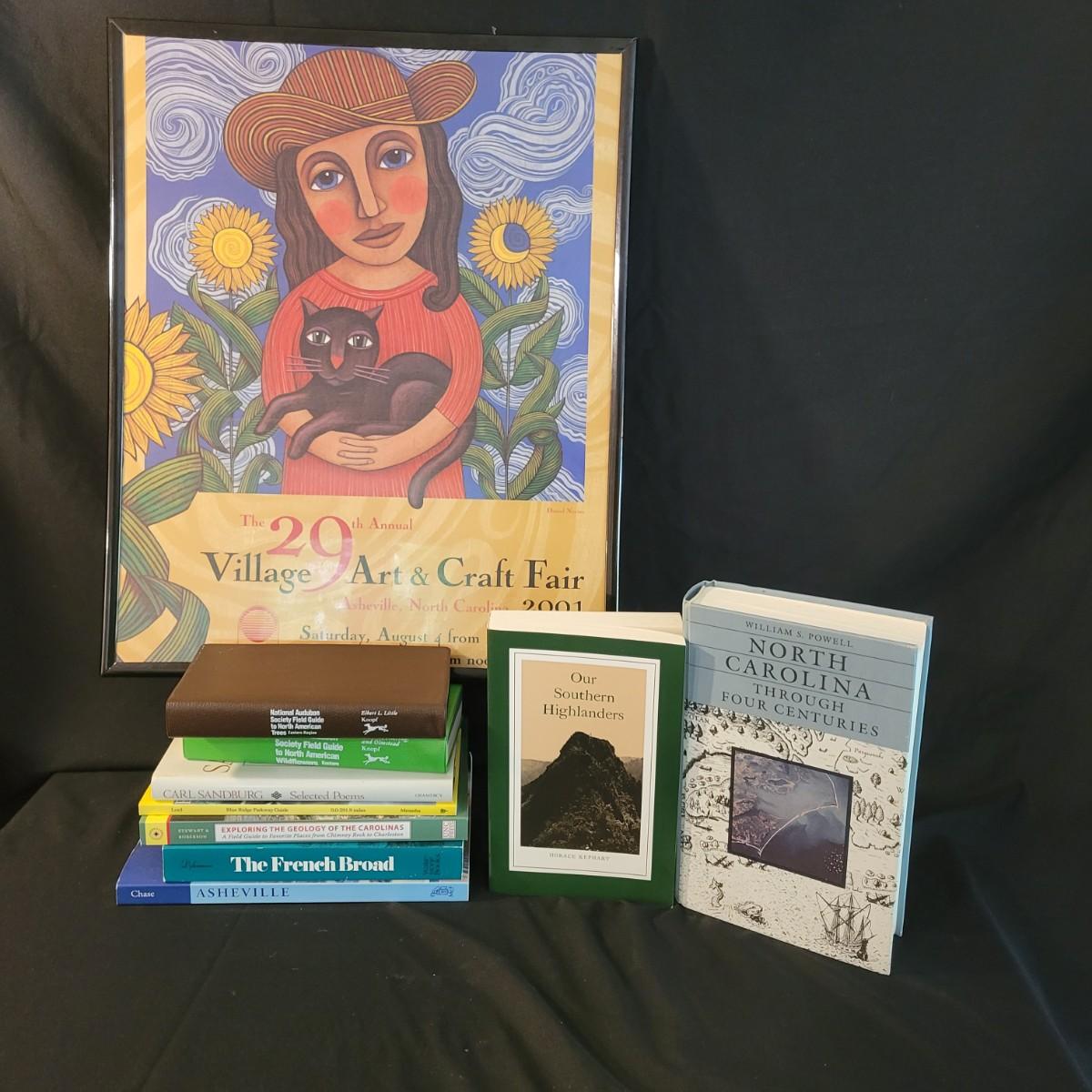 An assortment of nine books with regional authors and subjects about North Carolina. Authors include Horace Kephart, Carl Sandburg, and Wilma Dykeman. There are also books about NC geology, the Blue Ridge Parkway and more. This lot also includes a Village Art & Craft Fair poster from 2001 in a frame that measures 16" x 20"H. Shipping available. Shipping can be costly. We suggest contacting our preferred local shipping provider, Postage Express, with dimensions and getting an estimate before bidding: (828) 670-5501 or postageexpress@yahoo.com.