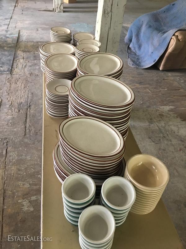 Auction is for entire table full of restaurant ware dishes platters saucers plates bowls and some odds and ends. Tan bowls are plastic, all other dishes are restaurant grade ceramic stoneware.