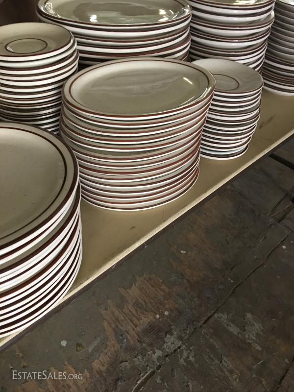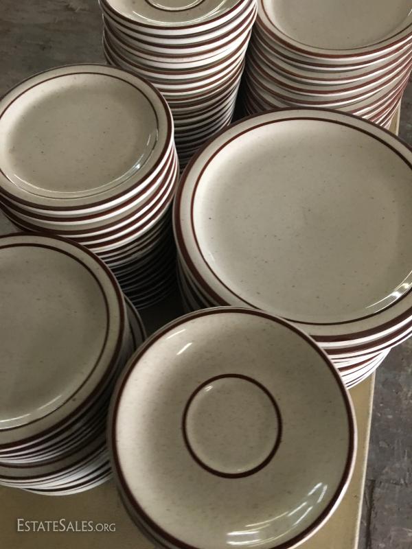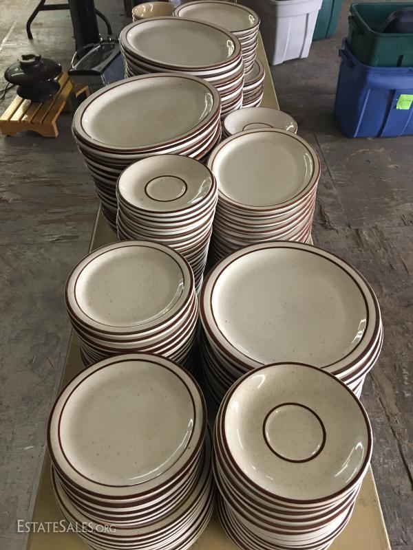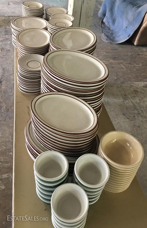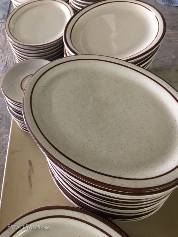 Auction is for entire table full of restaurant ware dishes platters saucers plates bowls and some odds and ends. Tan bowls are plastic, all other dishes are restaurant grade ceramic stoneware.