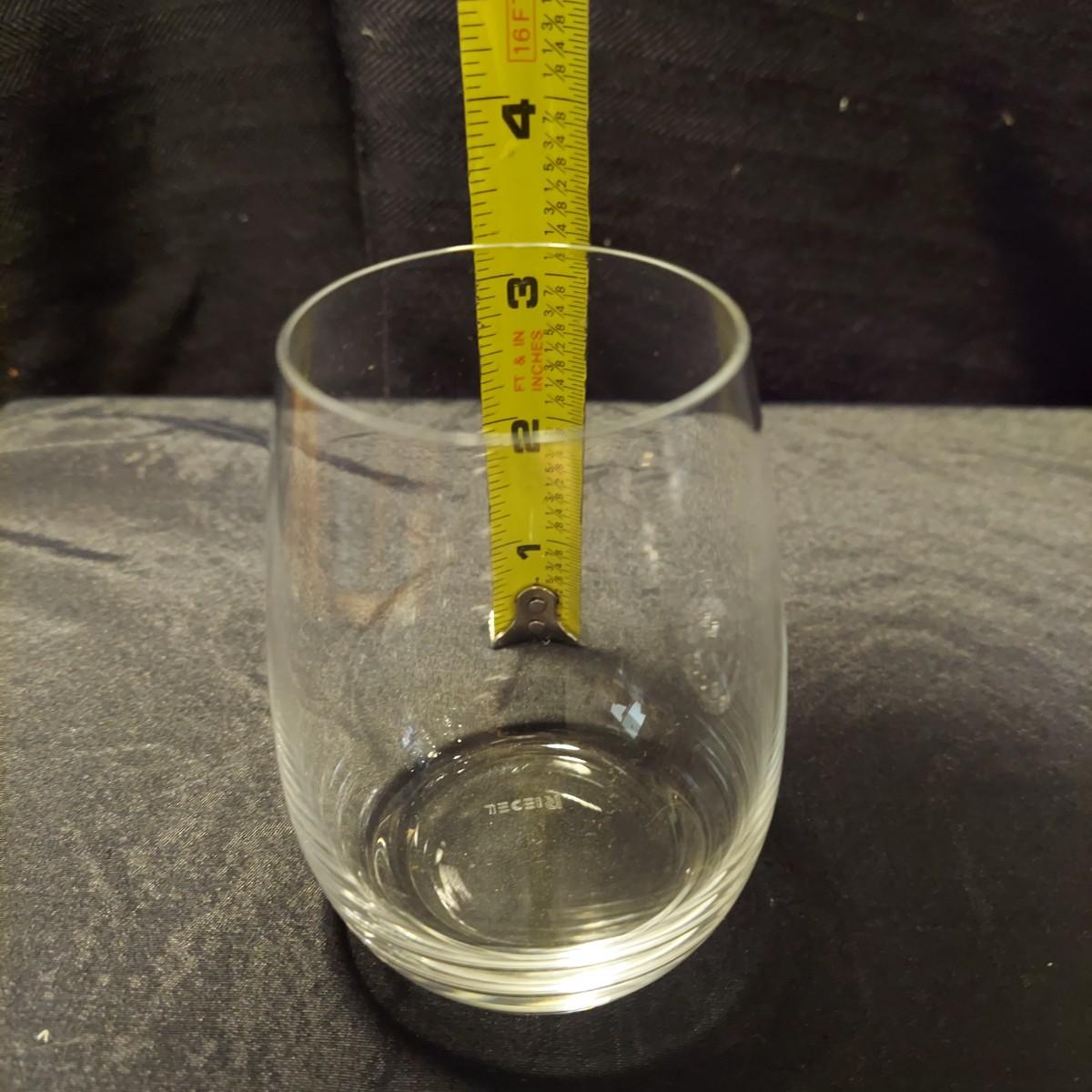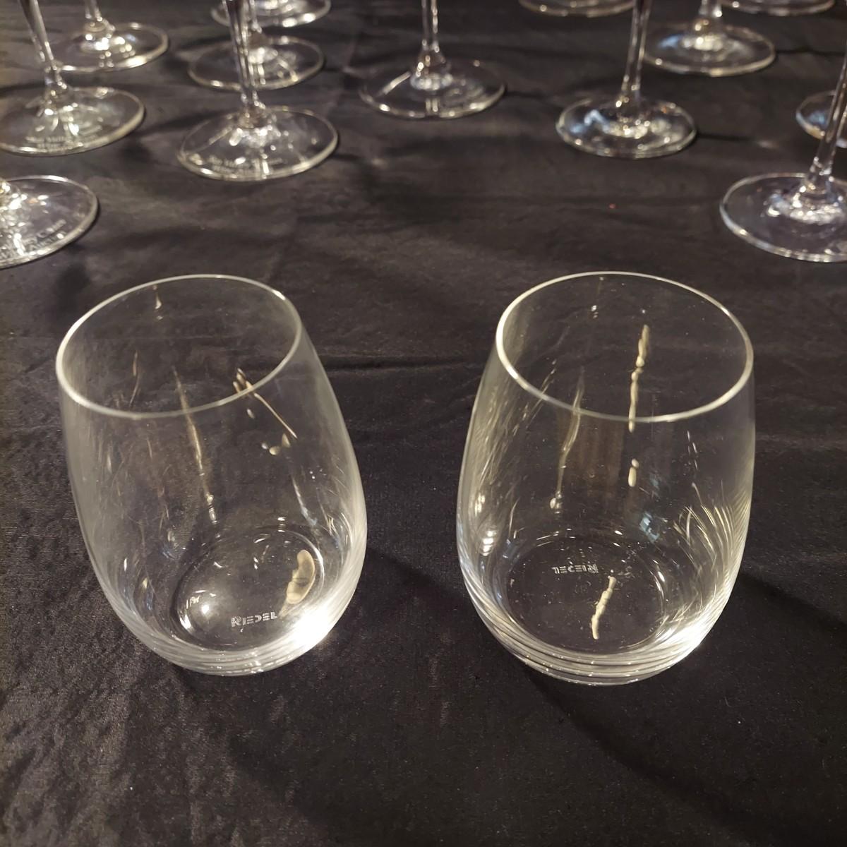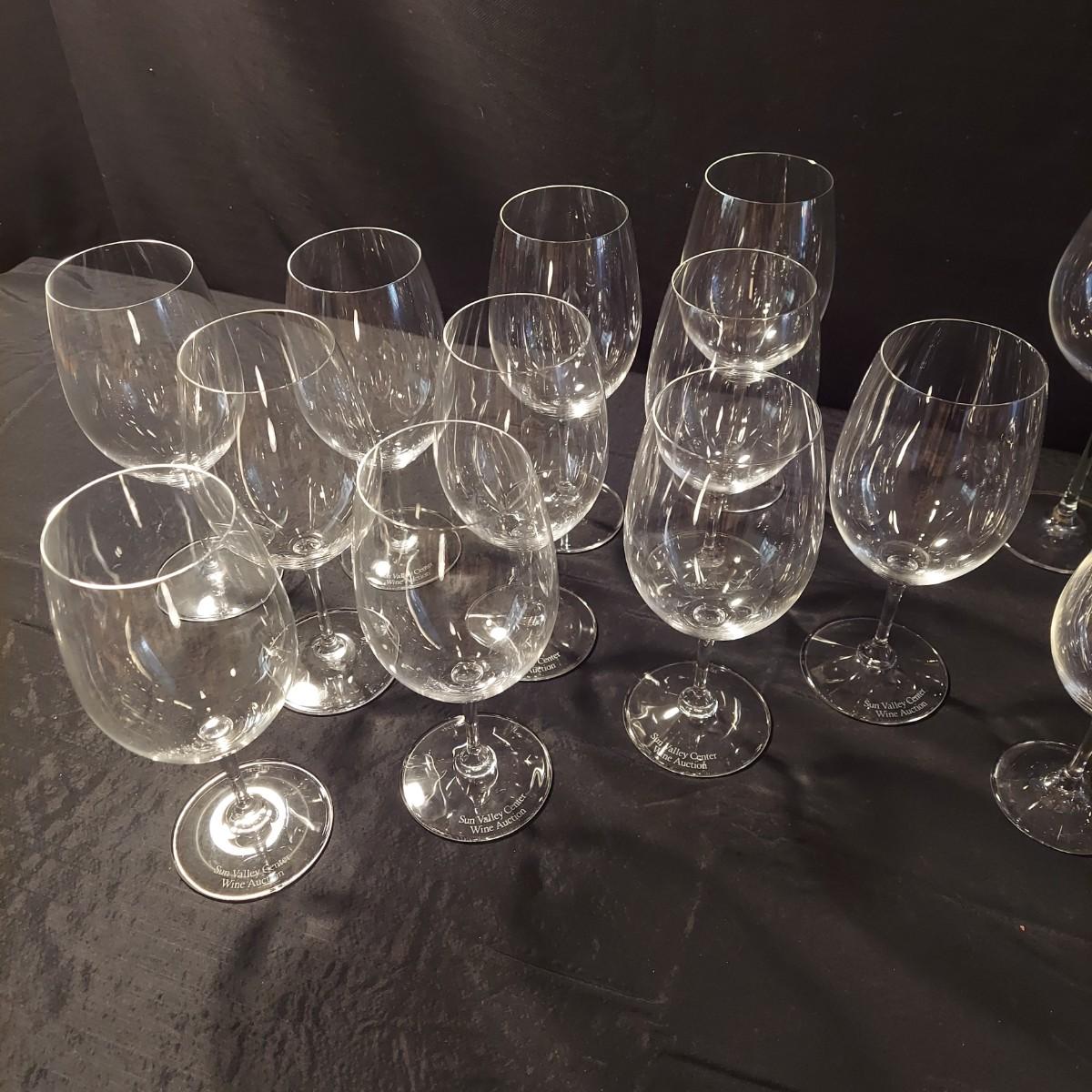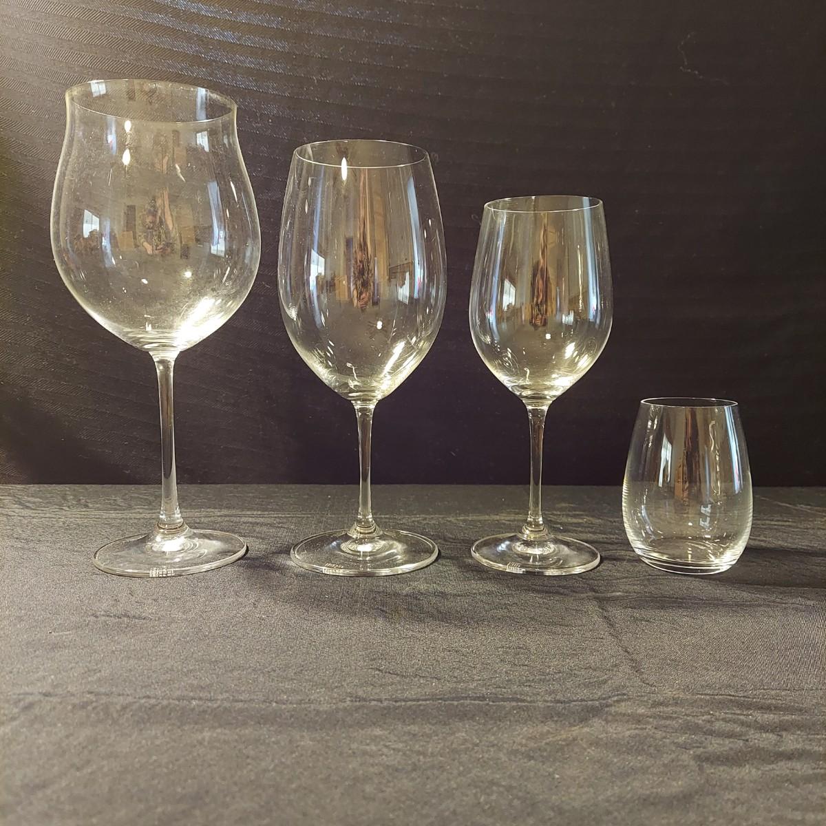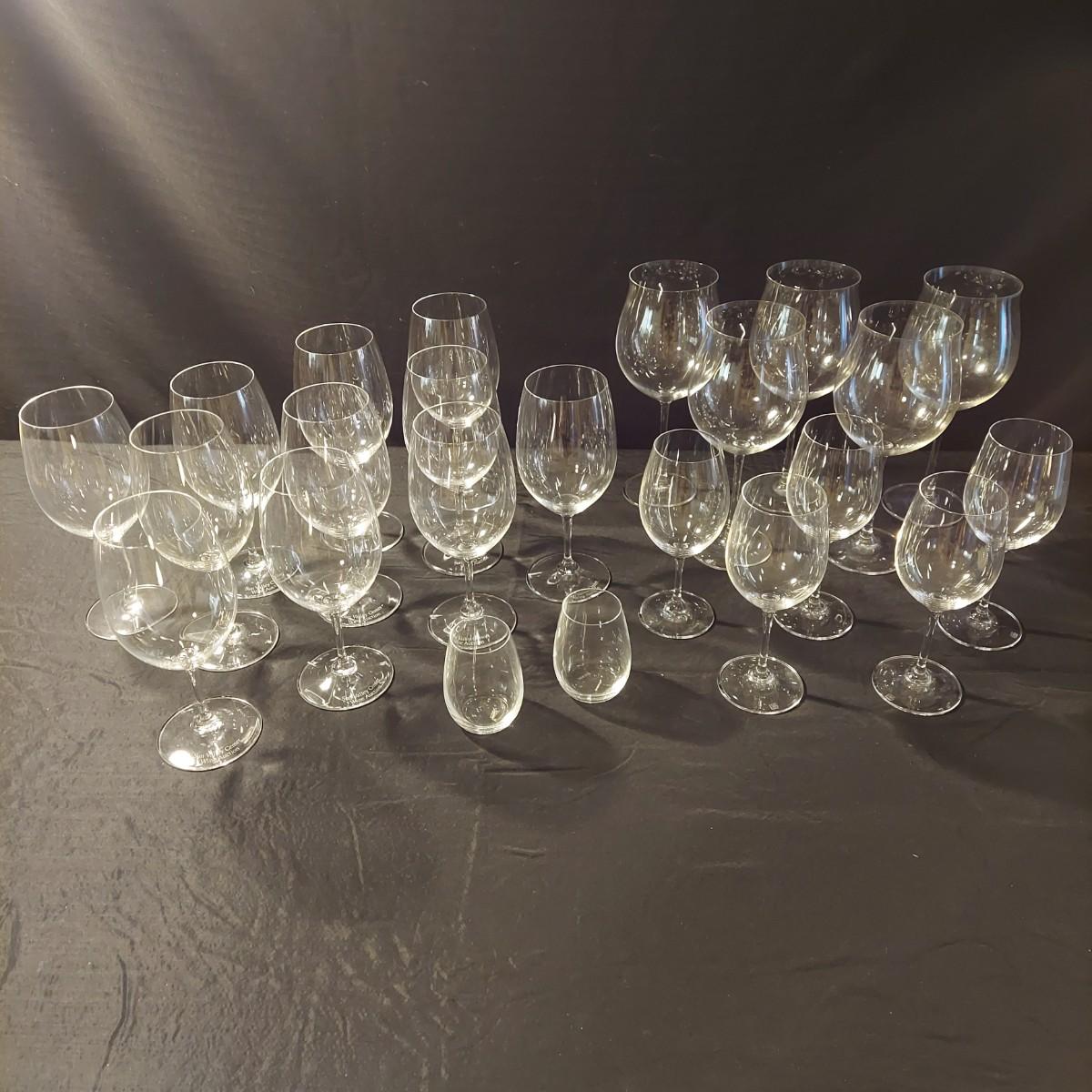 Lot includes several Reidel glasses in four different sizes that appear to be crystal. The two stemless glasses are approximately 3"H. There are five stemmed glasses that are approximately 8"H. There are 11 stemmed glasses that are approximately 9"H. These have a winery stamped on the base of about half of them. There are five stemmed glasses that are approximately 10"H. Please see photos for details. Local Pickup Only