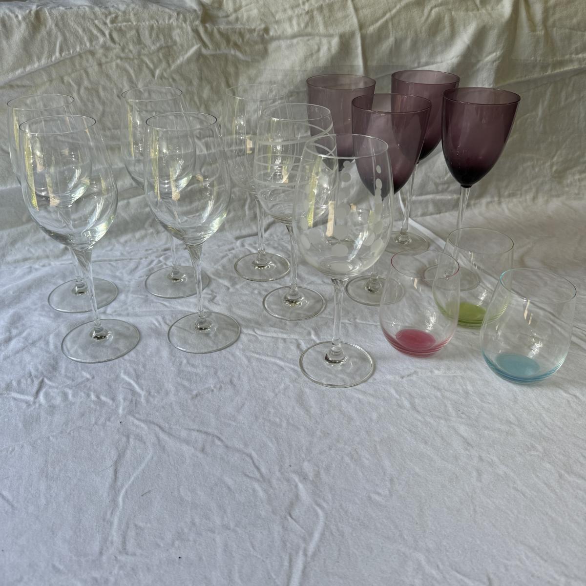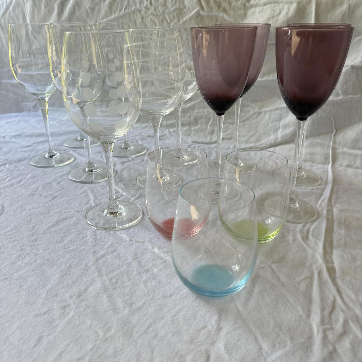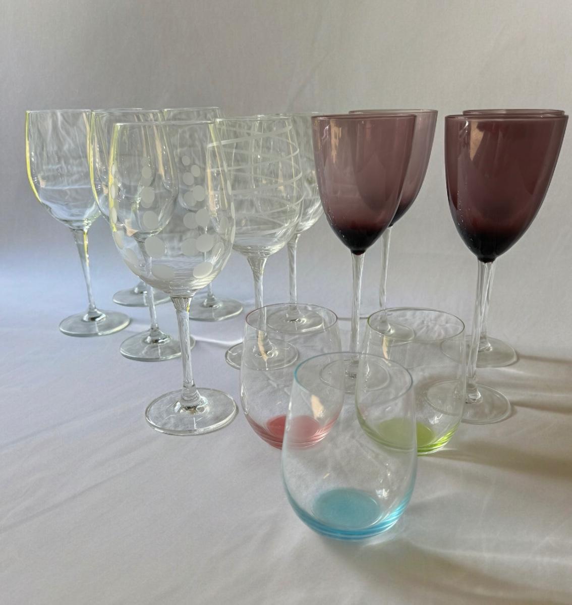 Nice quality sets of wine glasses. Four purple colored Lenox, three multi colored Reidel, three Mikasa with different fun patterns, and four plain glasses by Bormioli. Wine glasses are 9” tall. Stemless are 4” tall. Shipping available. Shipping can be costly. We suggest contacting our preferred local shipping provider, Postage Express, with dimensions and getting an estimate before bidding: (828) 255-9250 or shipping@postageexpressnc.com.
