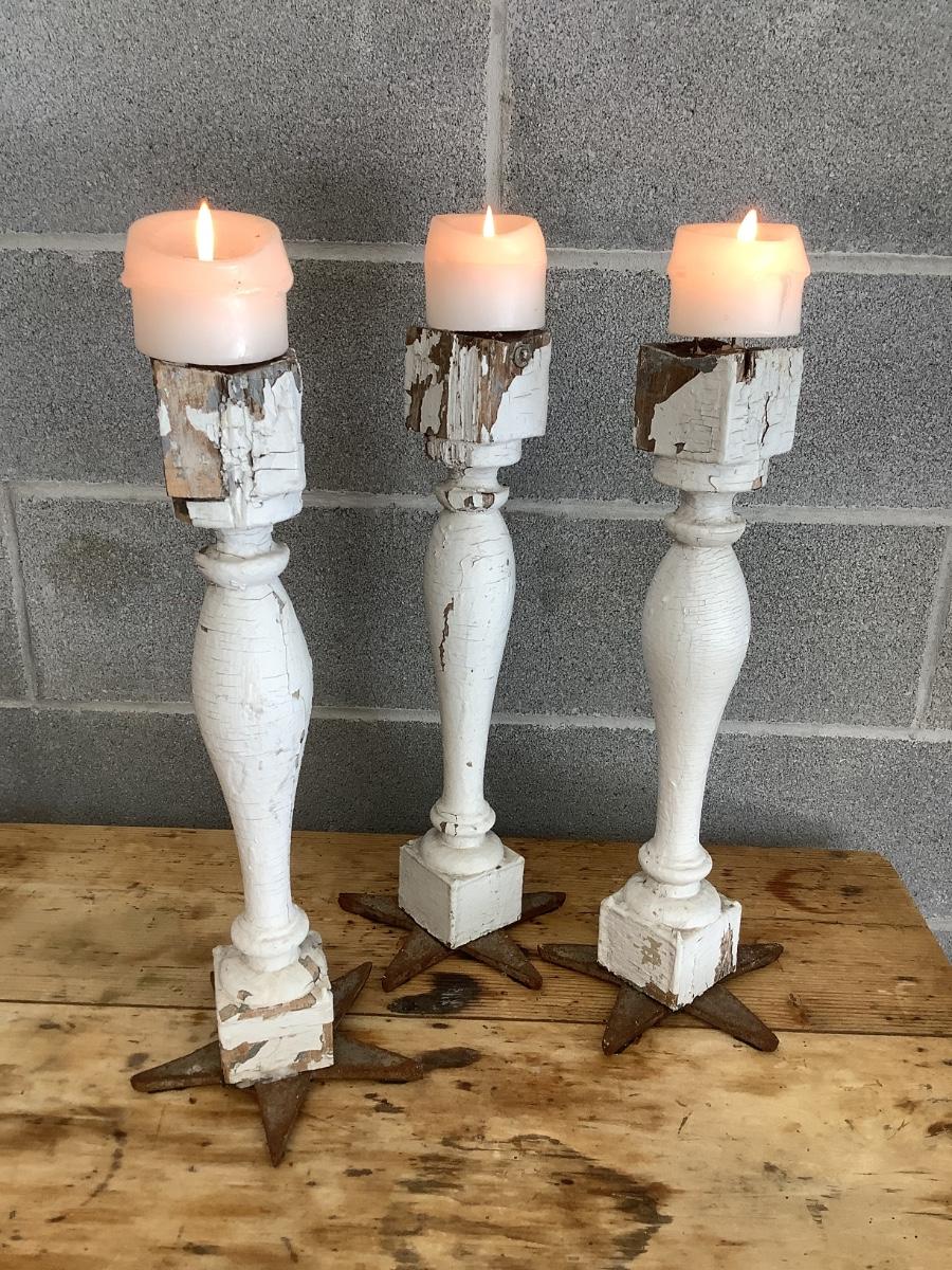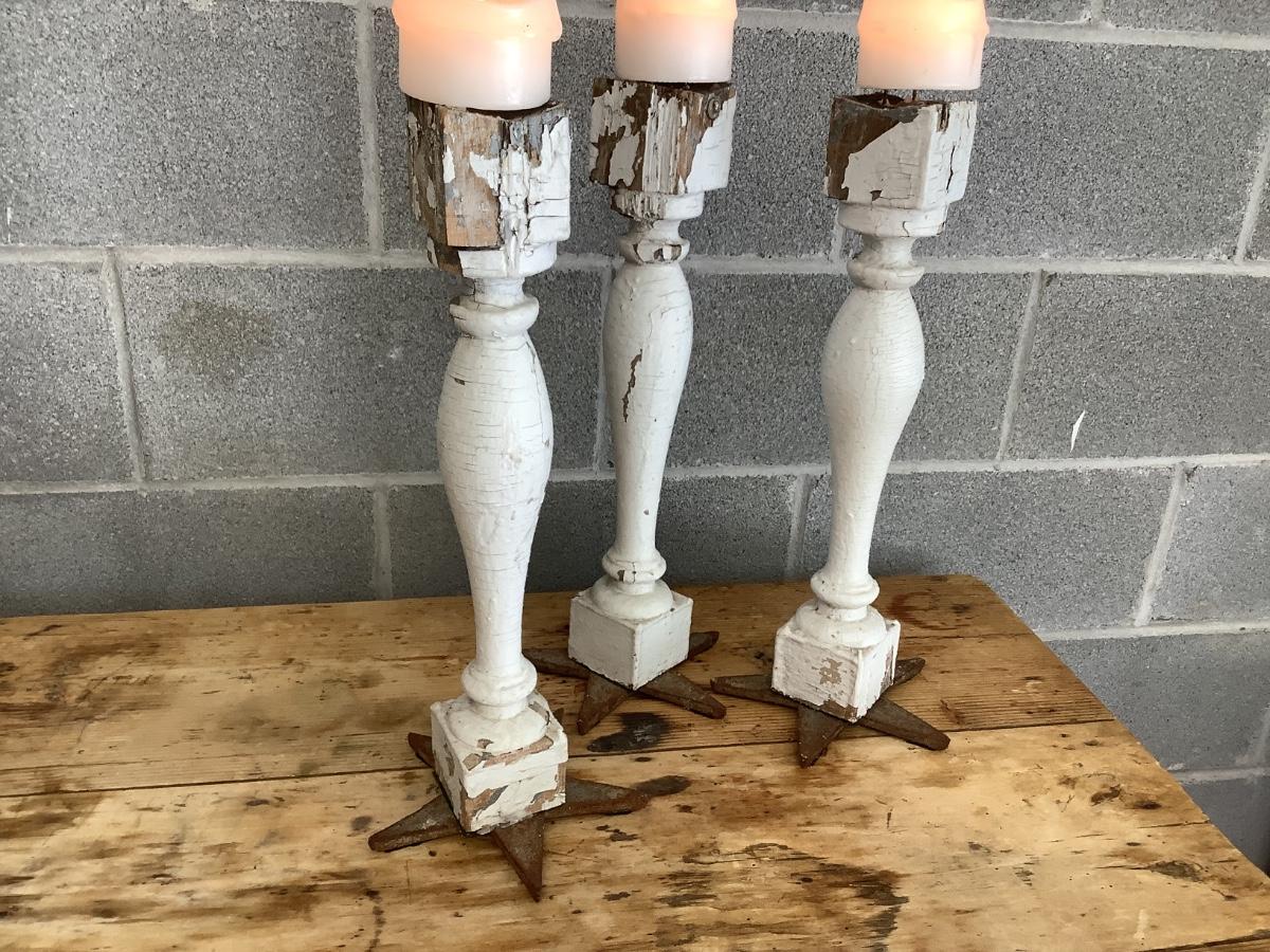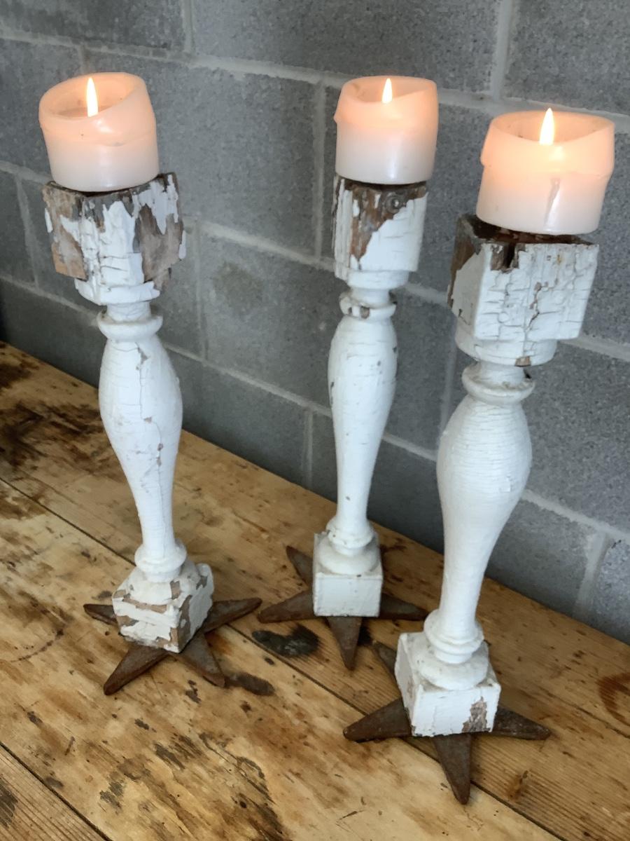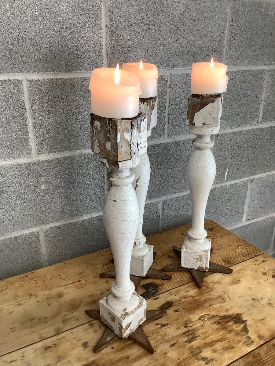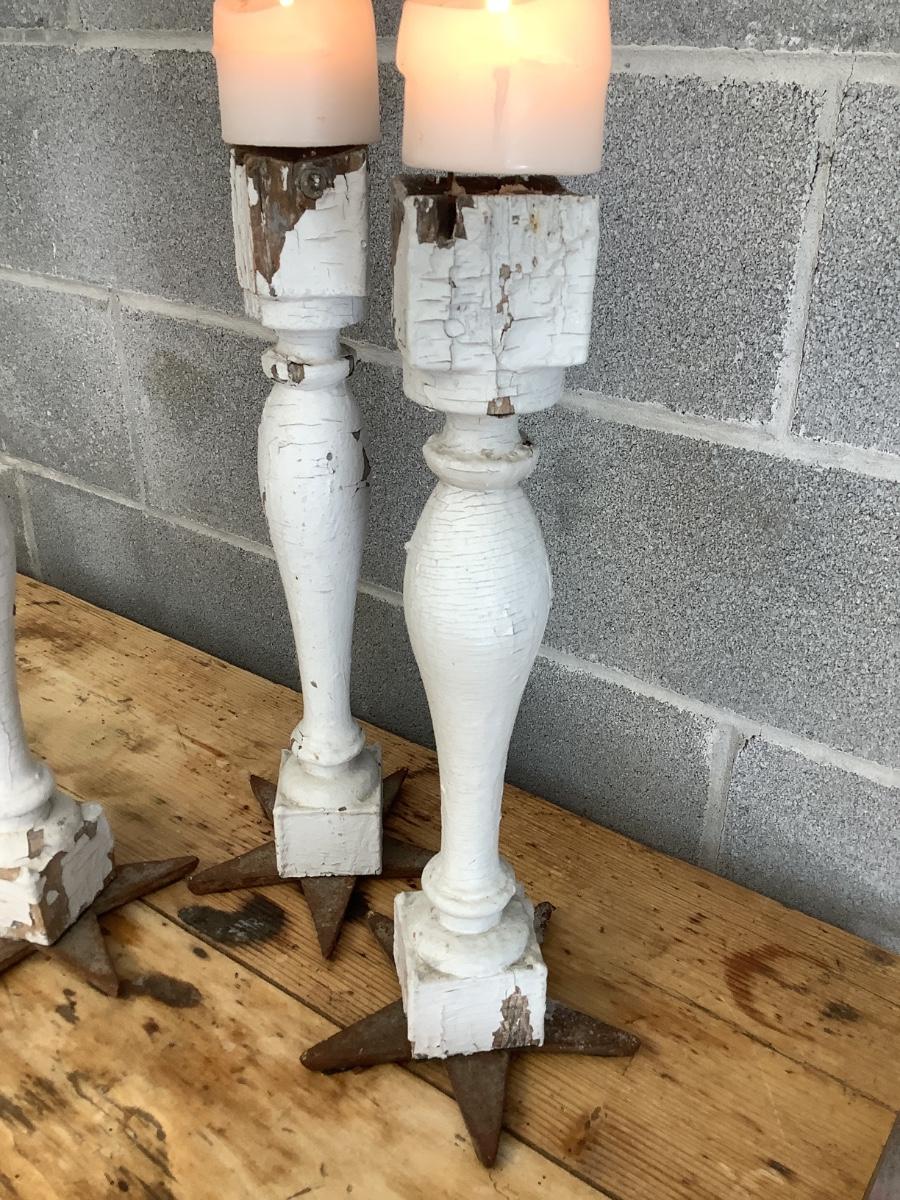 Reimagined candlesticks with wooden posts, metal stars from hurricane rods as the base -3
