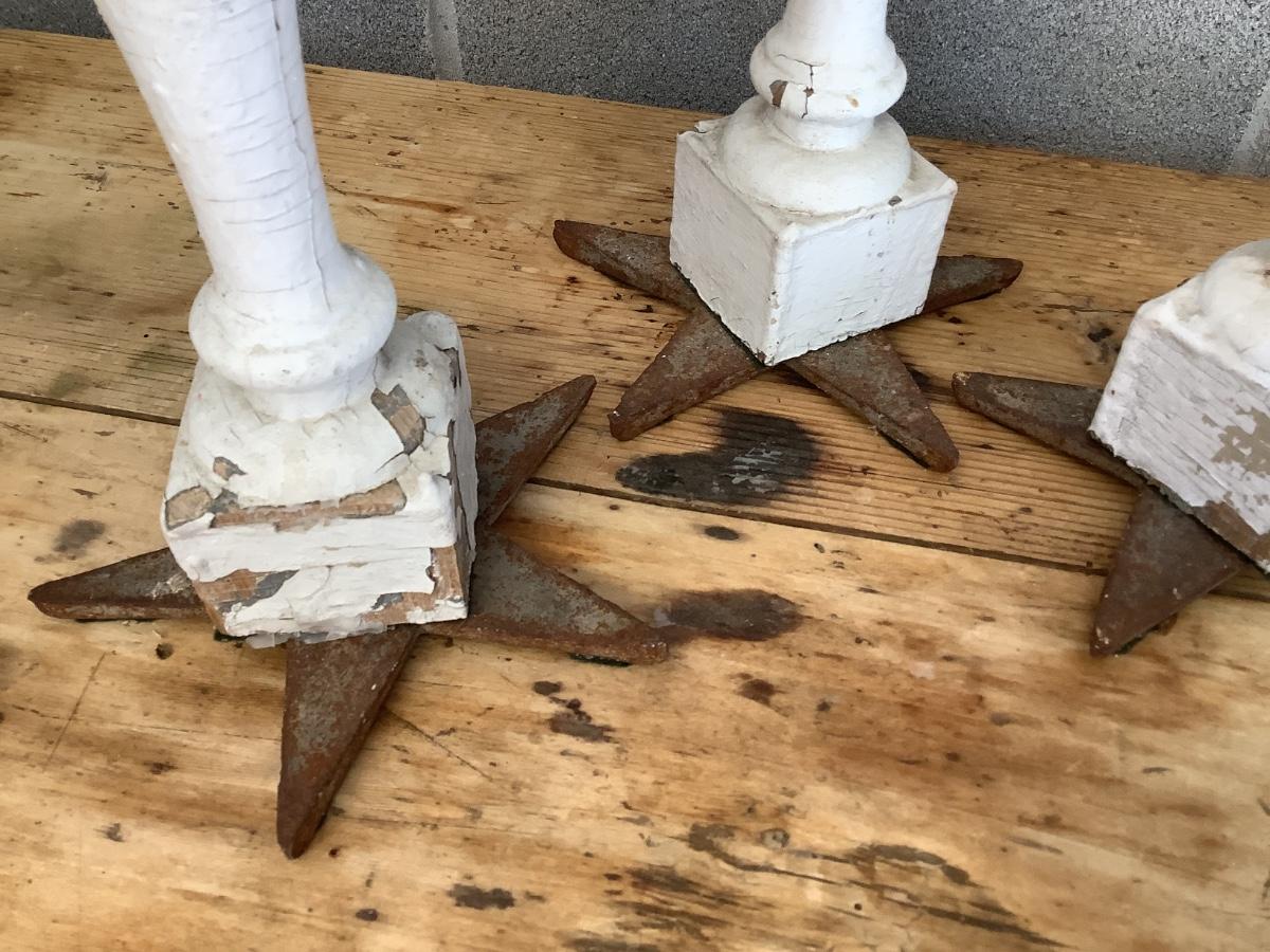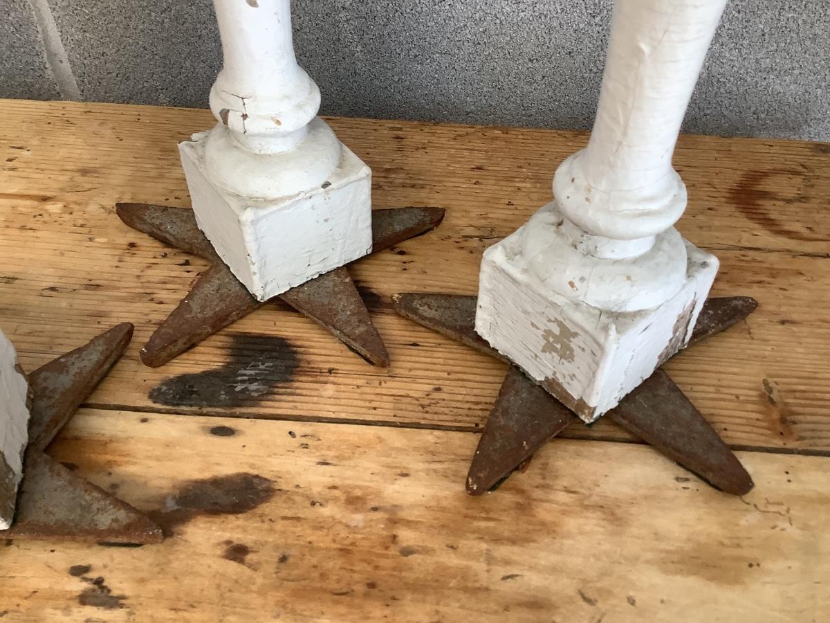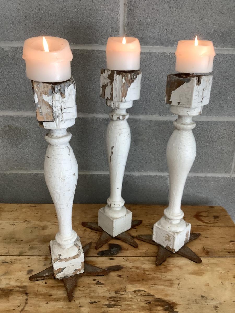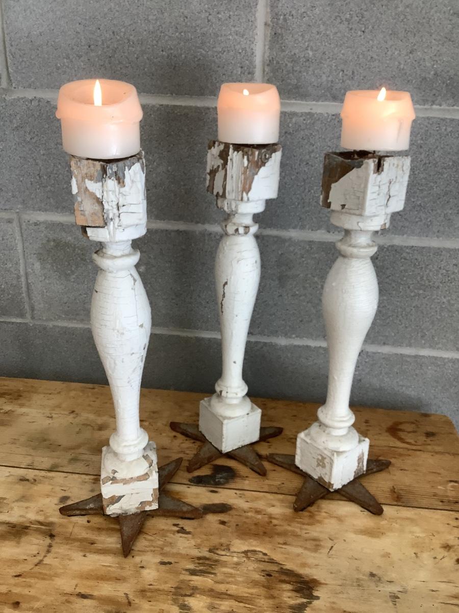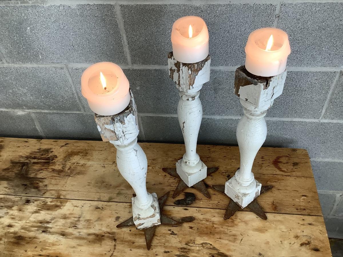 Reimagined candlesticks with wooden posts, metal stars from hurricane rods as the base -3