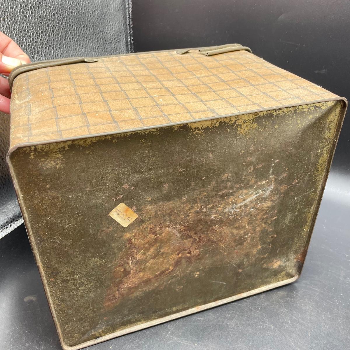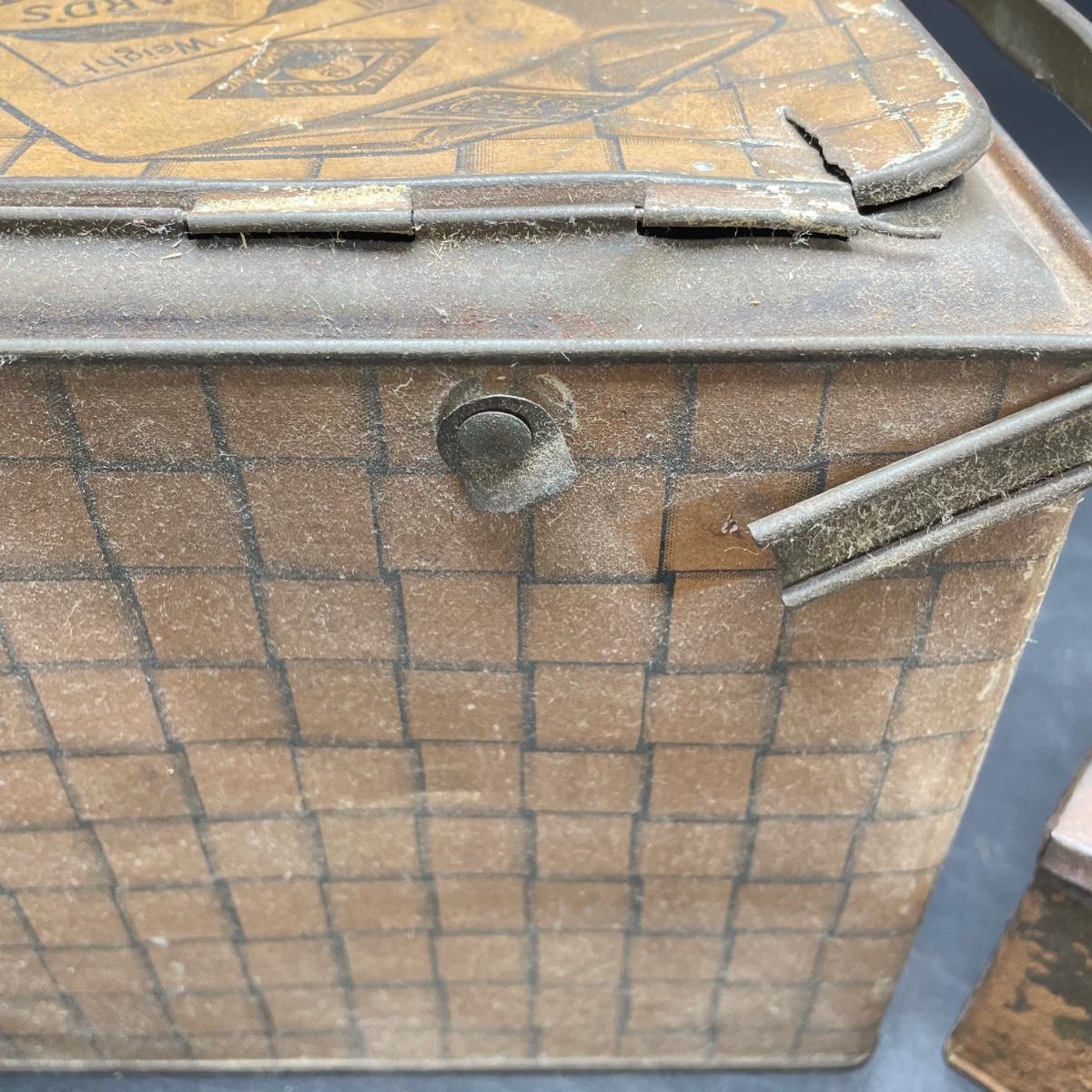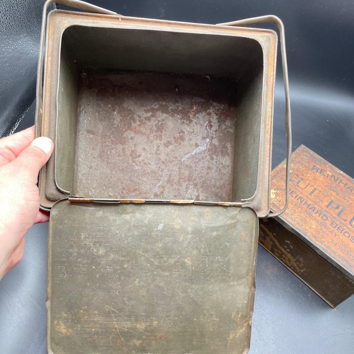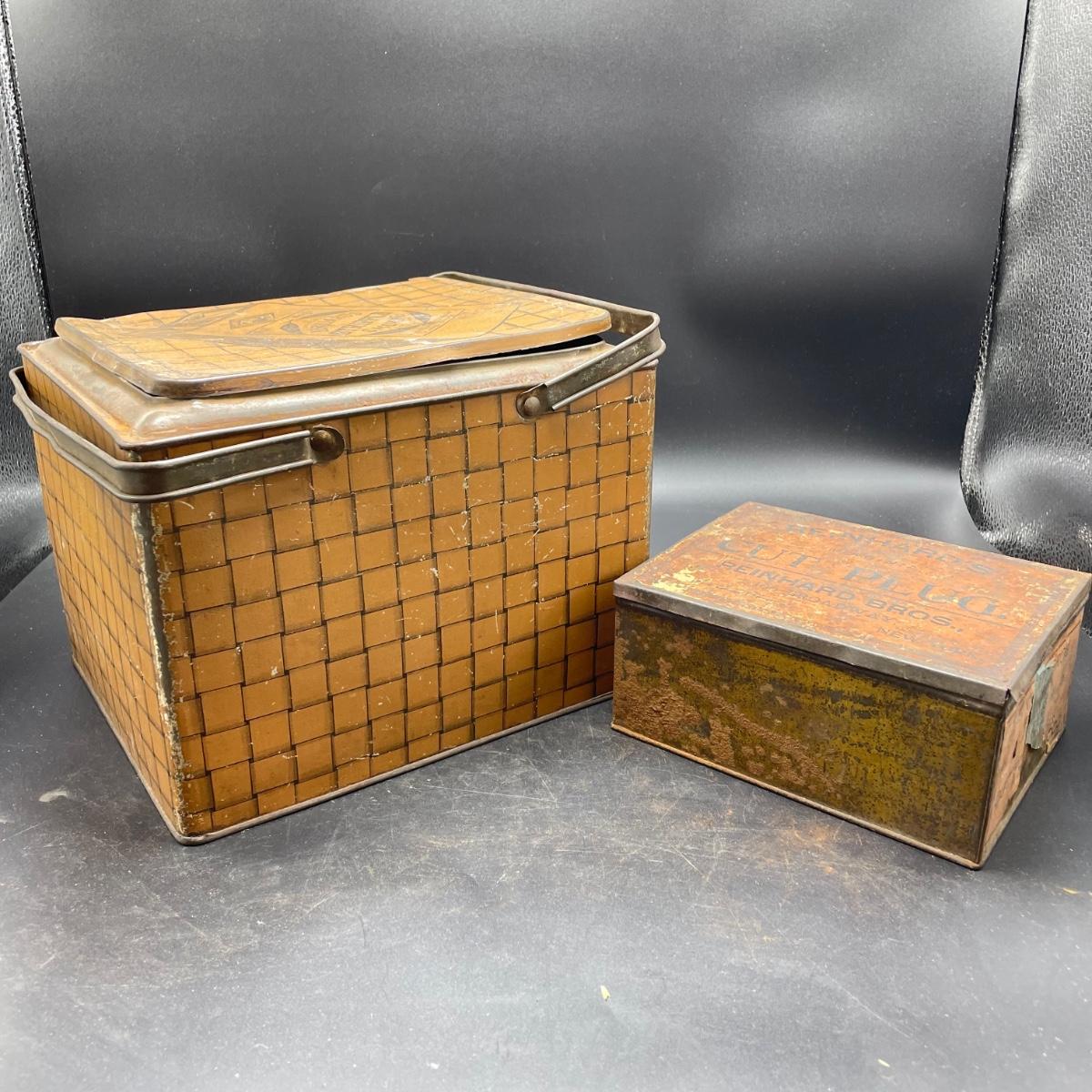 Picnic basket style advertising tin by Lorillard’s with hinged lid. The other advertising tin by Reinhard Bros with some paper having been removed. The basket has one handle broken on the back side, this one measured 9” x 7.25” x 7.5”. See images. Shipping available.