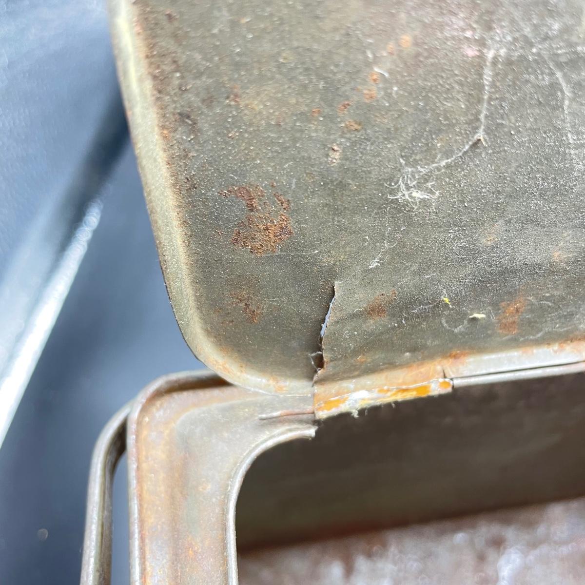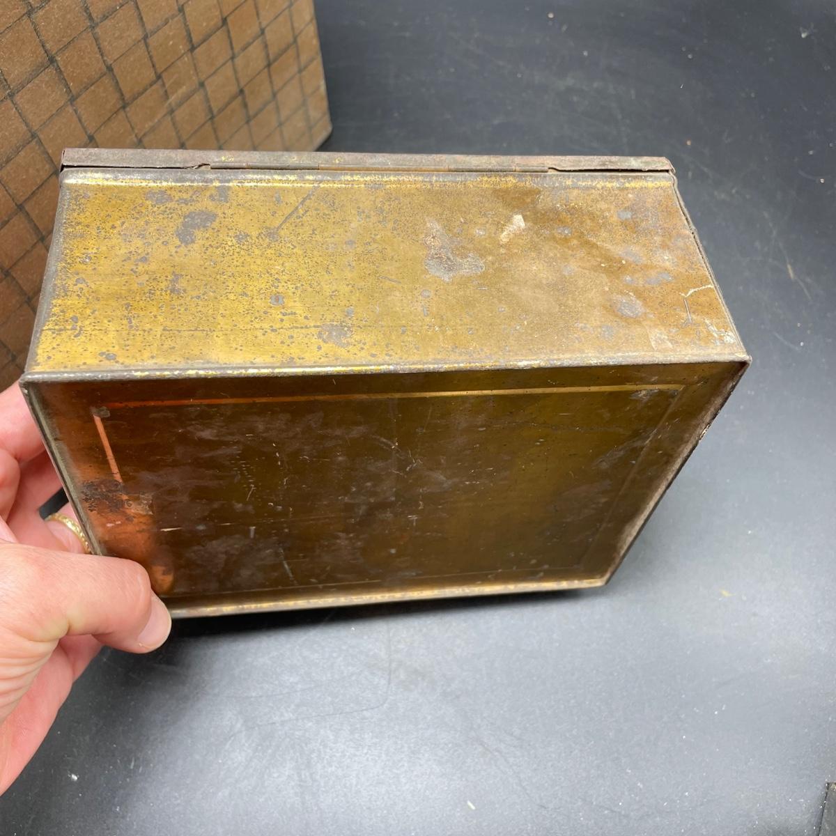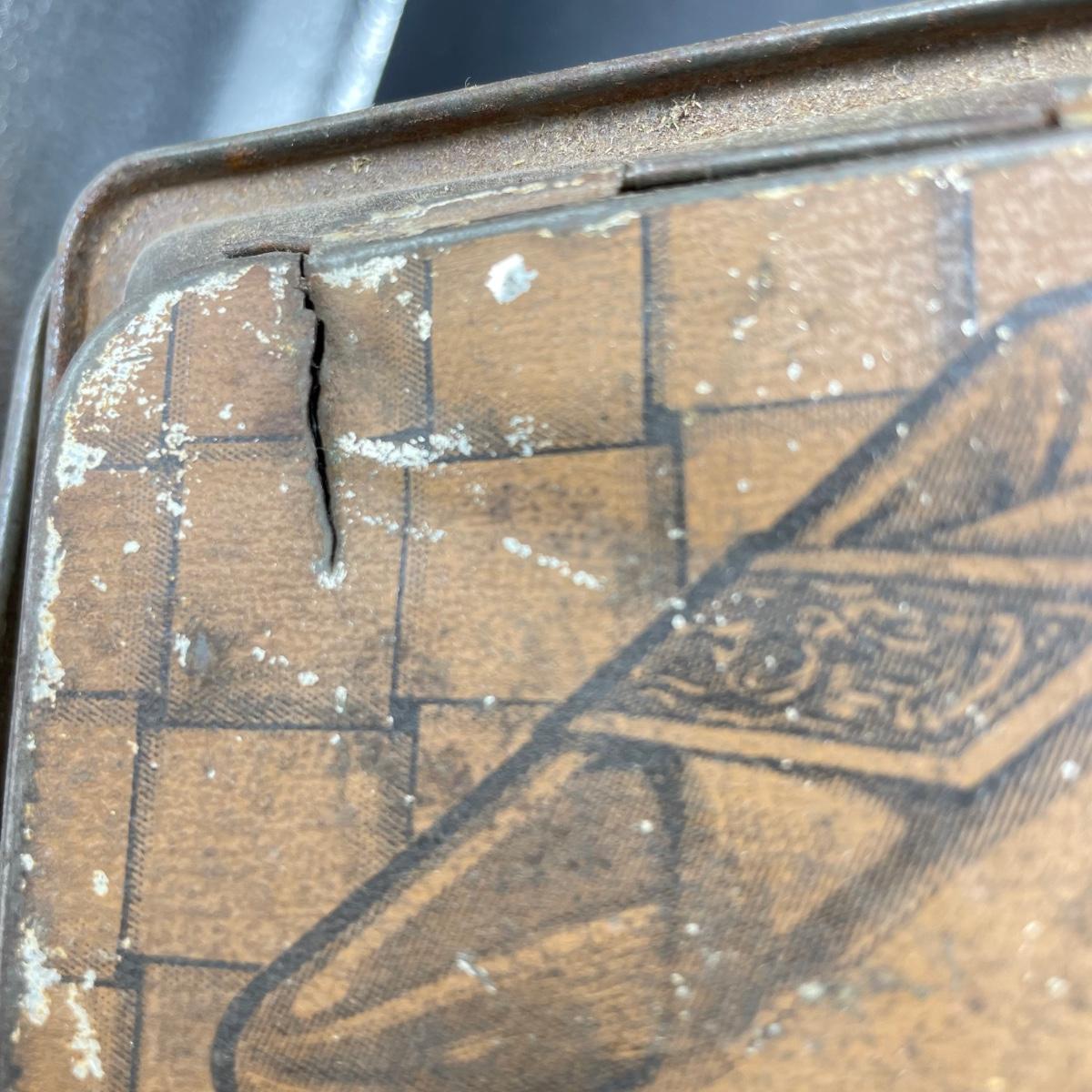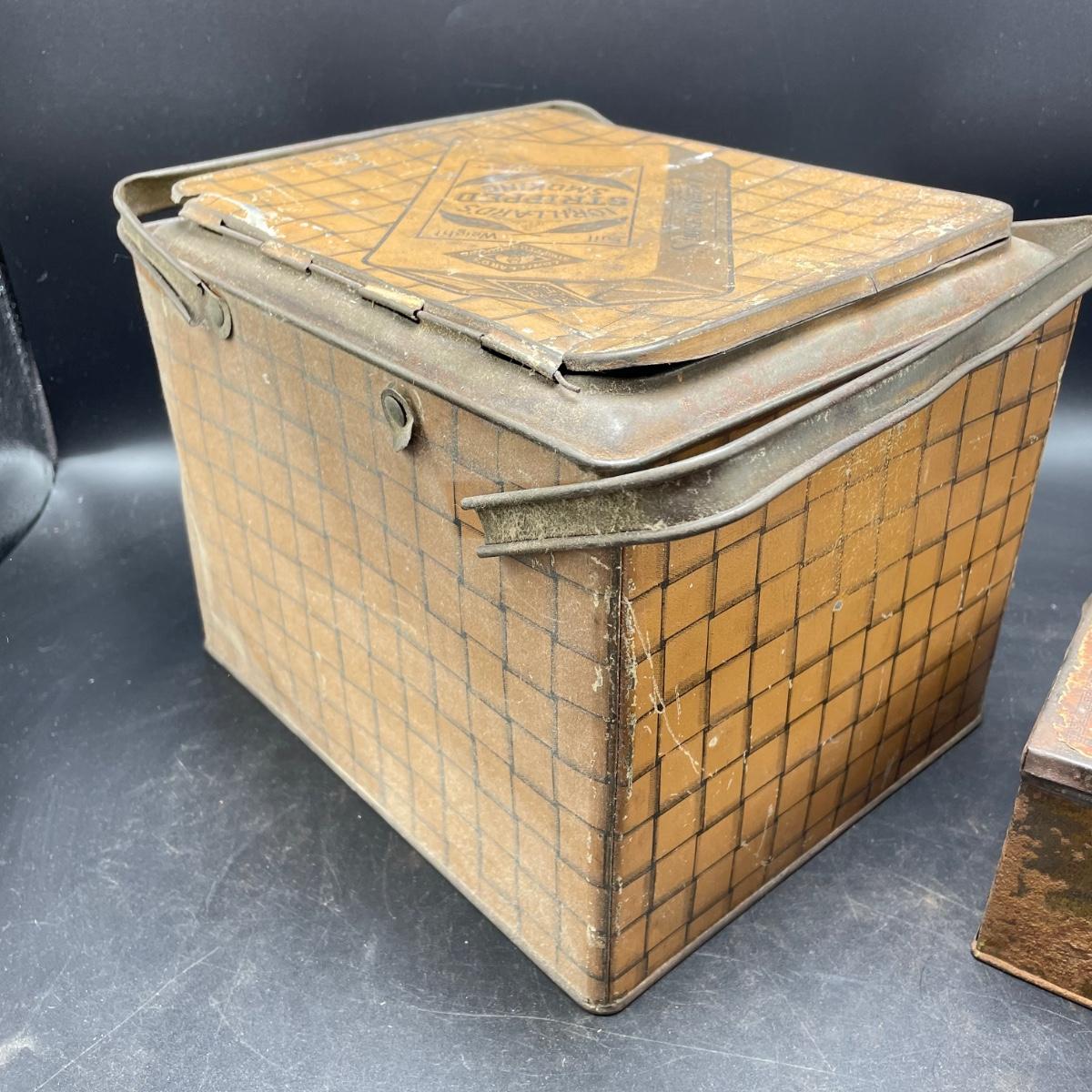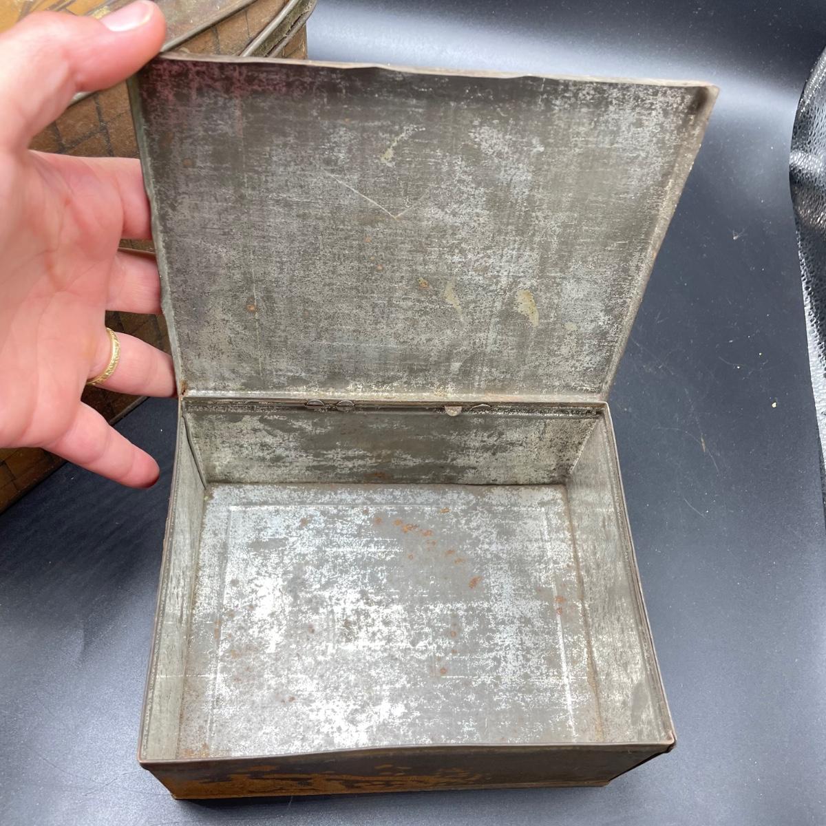 Picnic basket style advertising tin by Lorillard’s with hinged lid. The other advertising tin by Reinhard Bros with some paper having been removed. The basket has one handle broken on the back side, this one measured 9” x 7.25” x 7.5”. See images. Shipping available.
