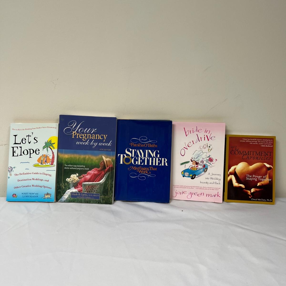Lot includes five books about relationships with these titles Staying Together in hardcover Let’s Elope, Bride in Overdrive, The Commitment Chronicles and Your Pregnancy Week by Week all in paperback.
