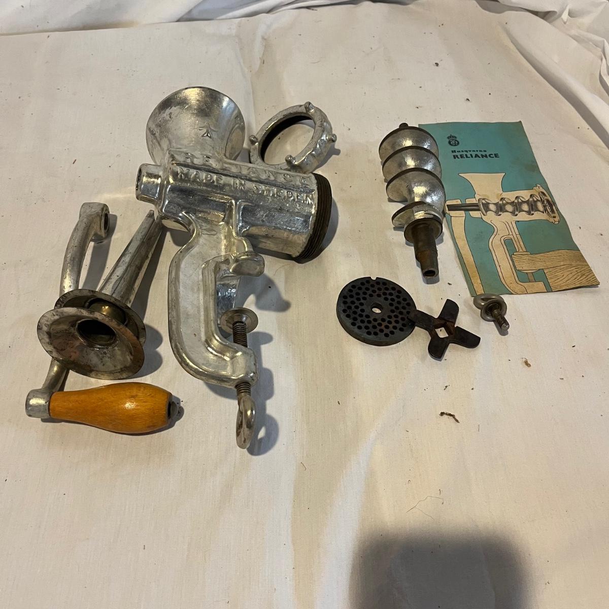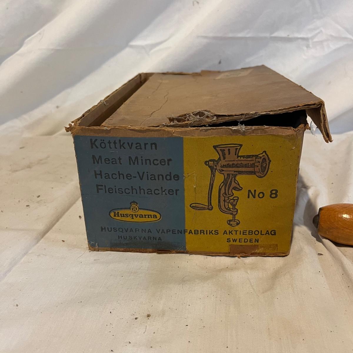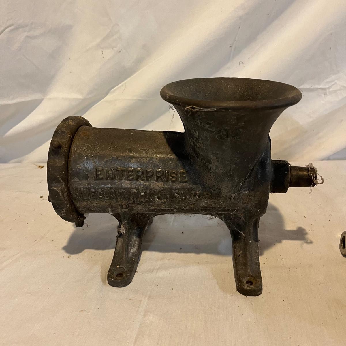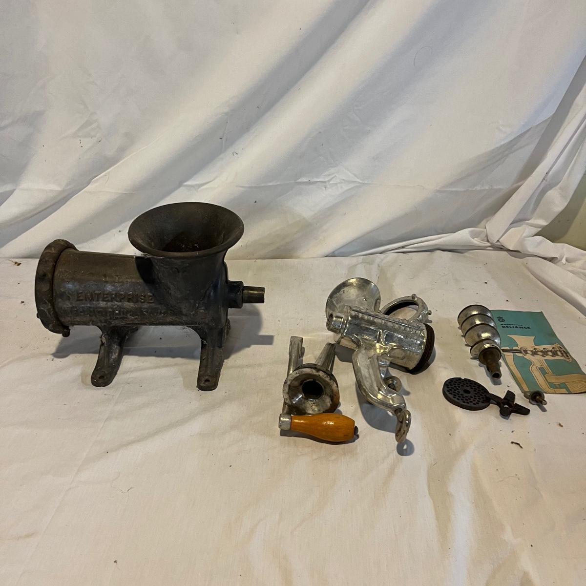 Lot includes a Husqvarna Reliance meat grinder that is in original box and a larger Enterprise meat grinder that is missing handle and measures 7” x 12” x 8”.