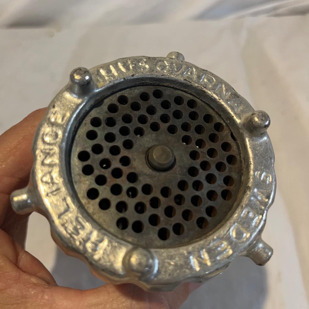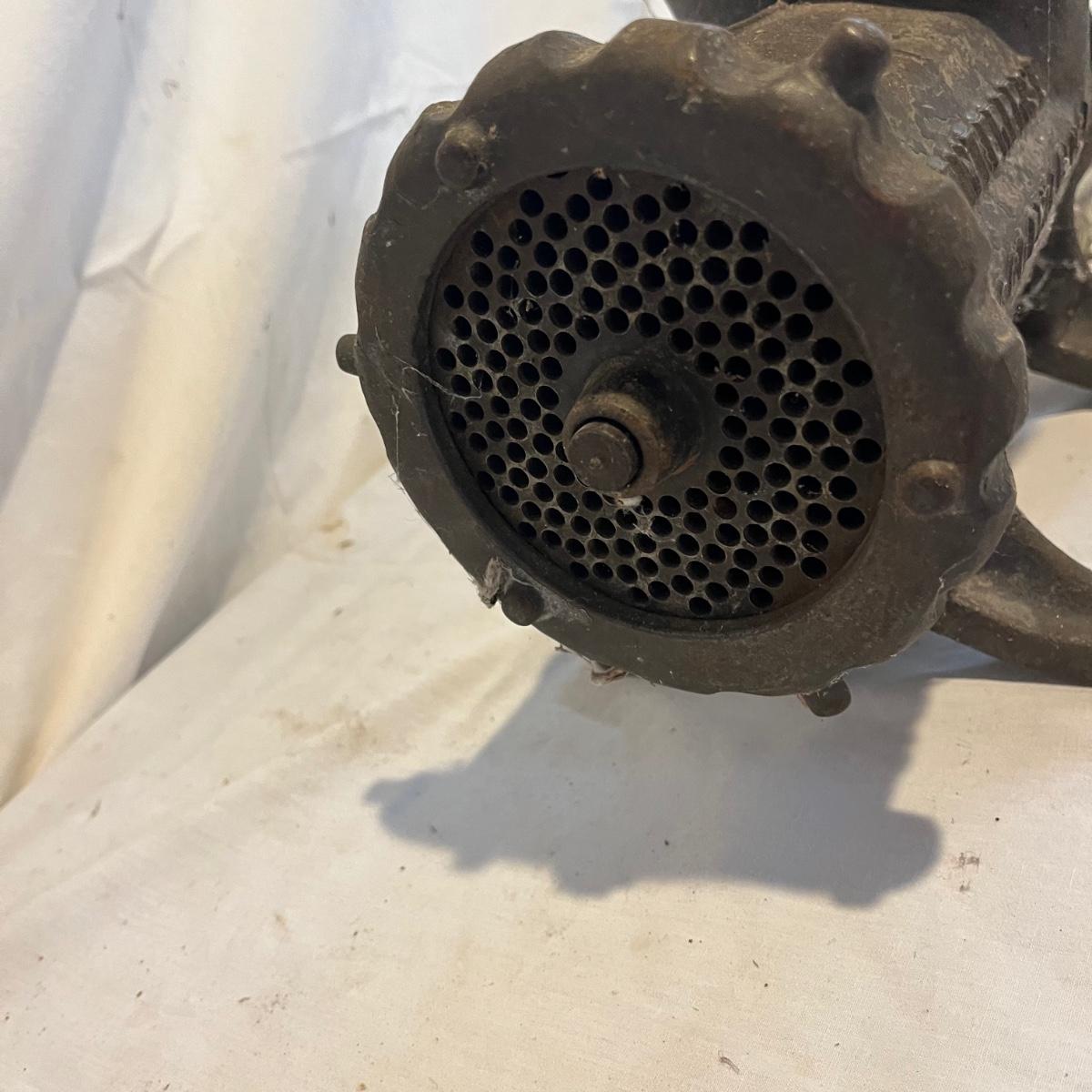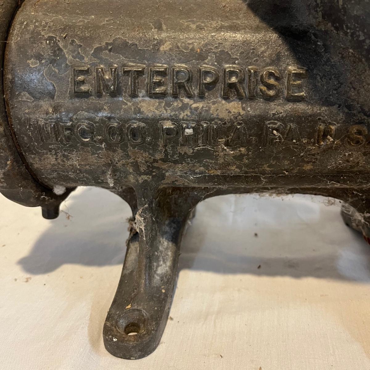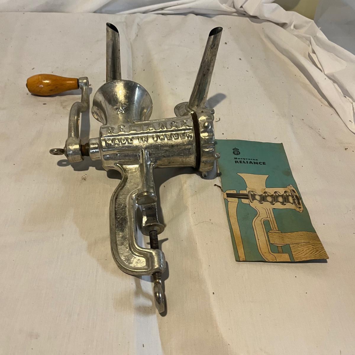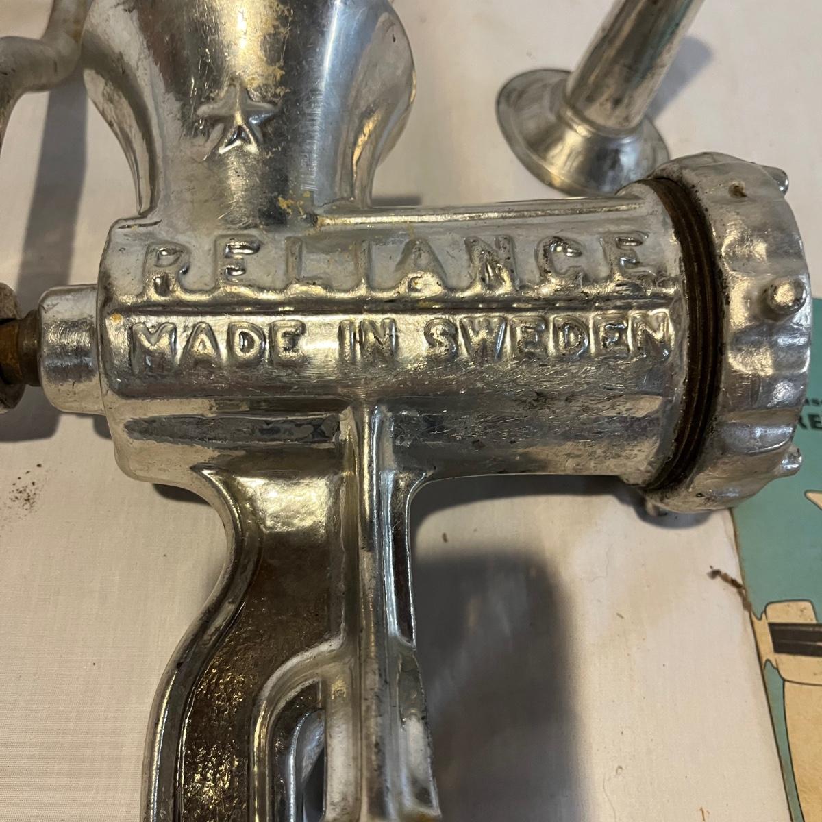 Lot includes a Husqvarna Reliance meat grinder that is in original box and a larger Enterprise meat grinder that is missing handle and measures 7” x 12” x 8”.