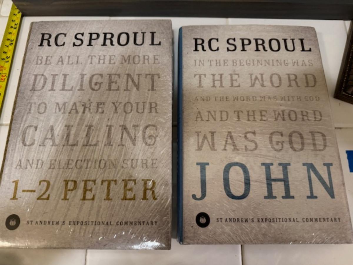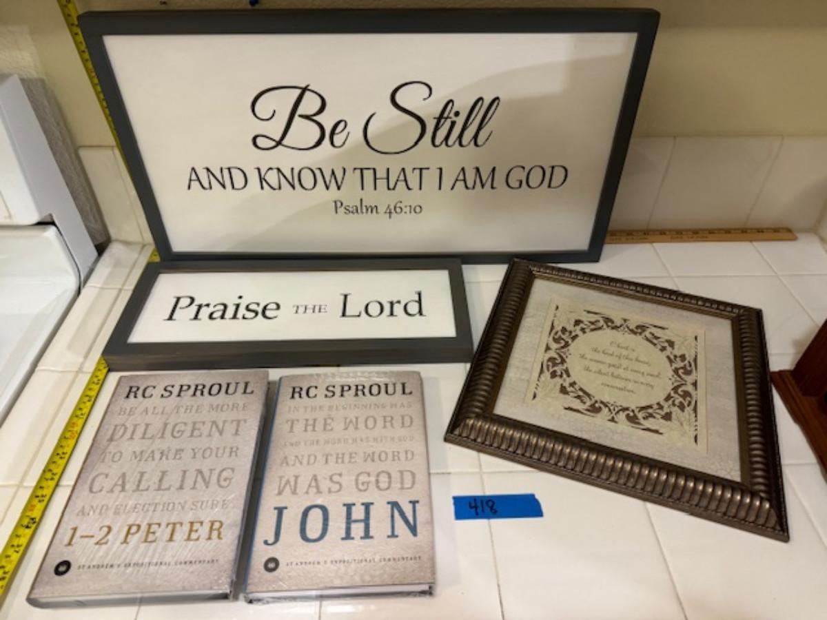 Keep sake signs made in America 7" x 1" x 17", Keep sake sign 13" x 1" x 25", books RC sproul (2 bk set) and RC Sproul, framed pic Christ is the heart of this house.