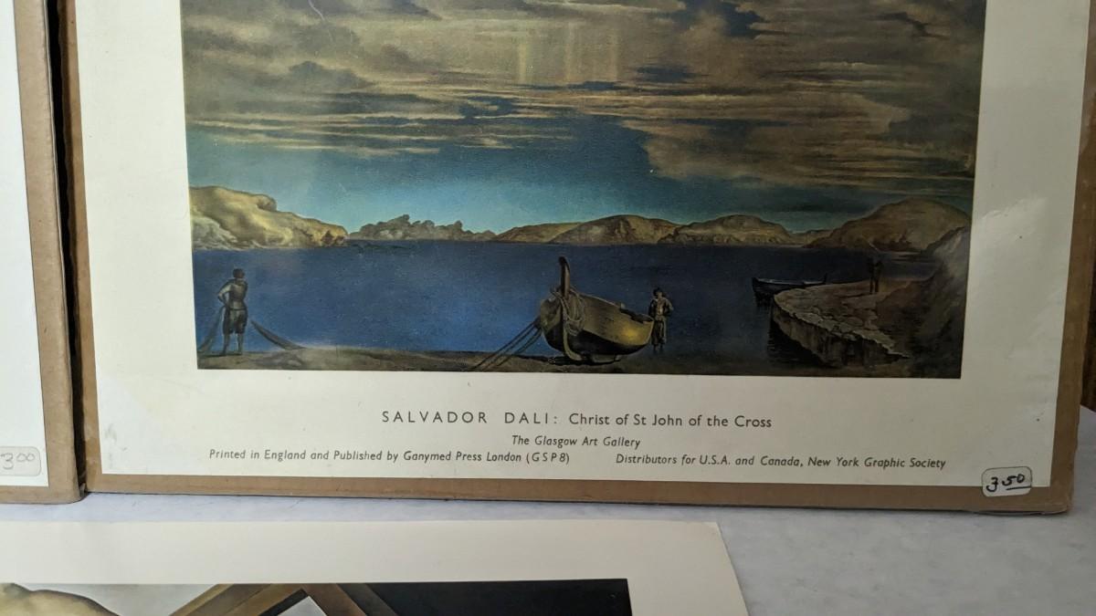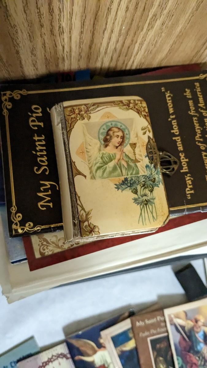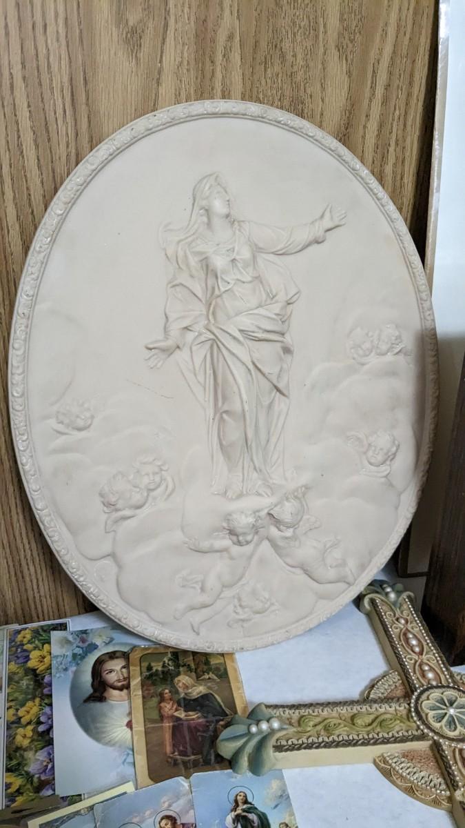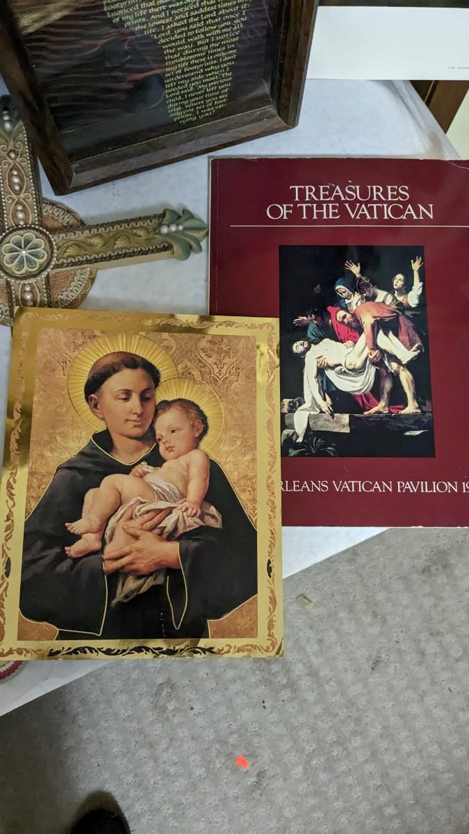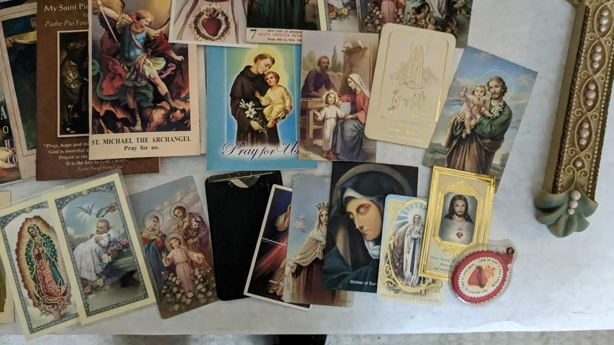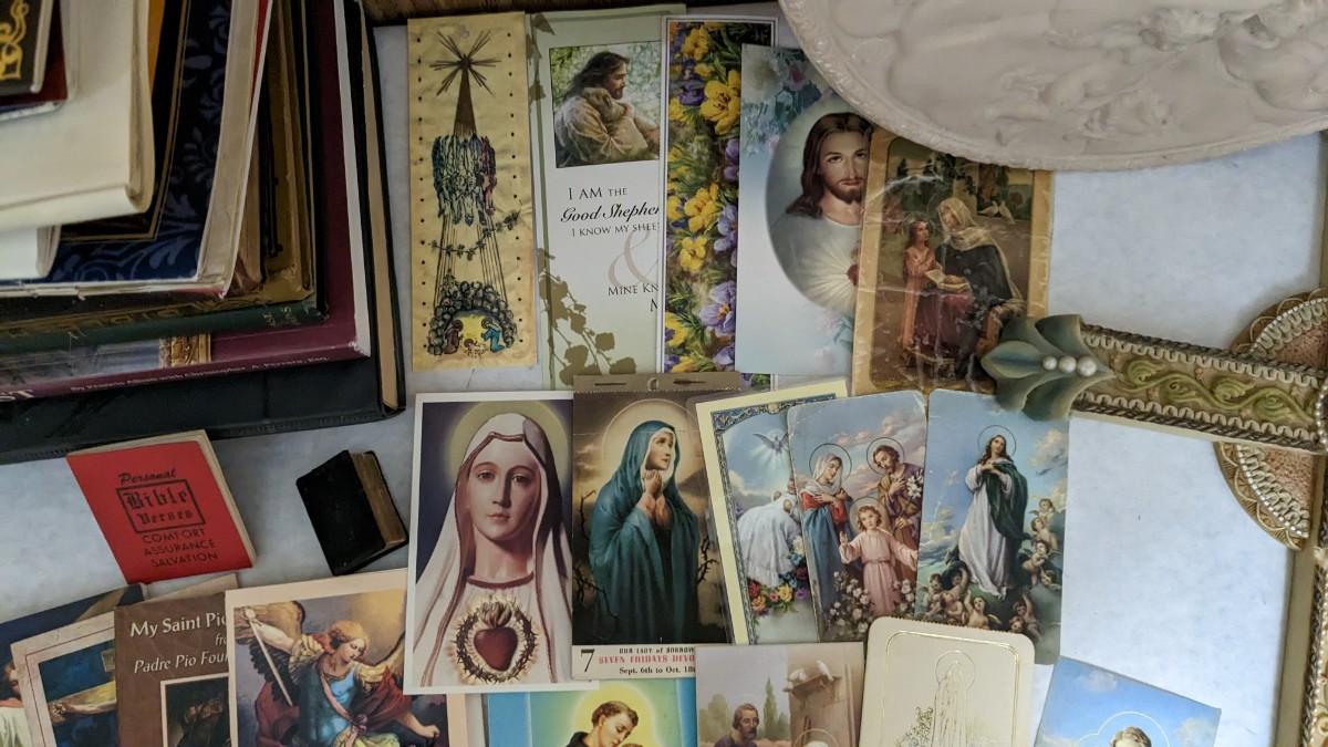 a large assortment of never framed religious prints, books, bibles, saint cards, and more! varied decades on this starting in the 40s. A very lovely assortment to behold in this one. livingroom