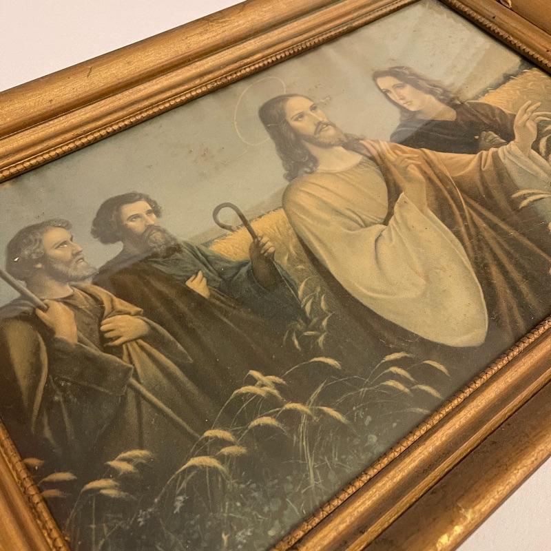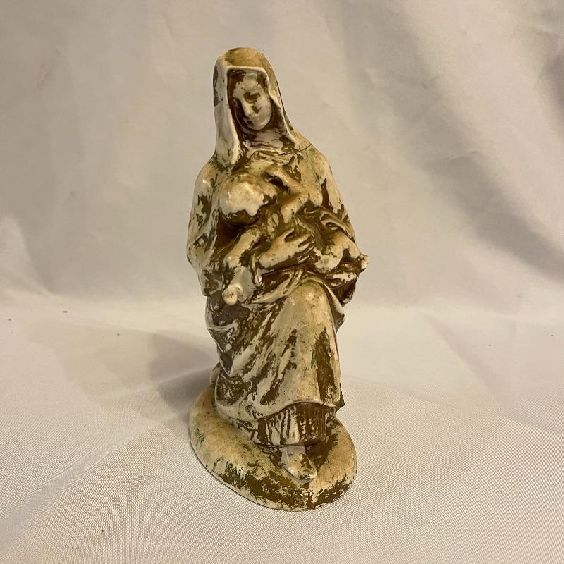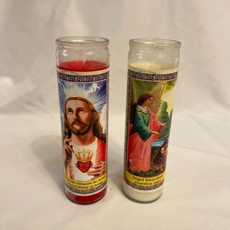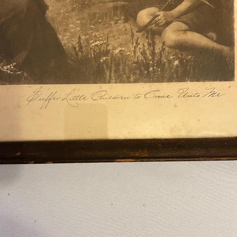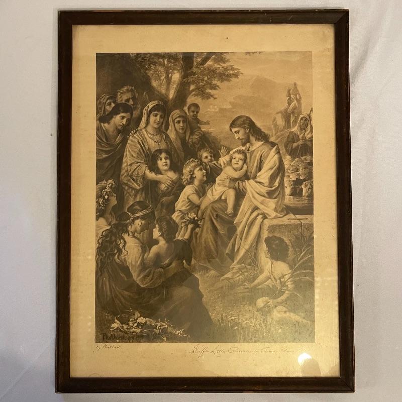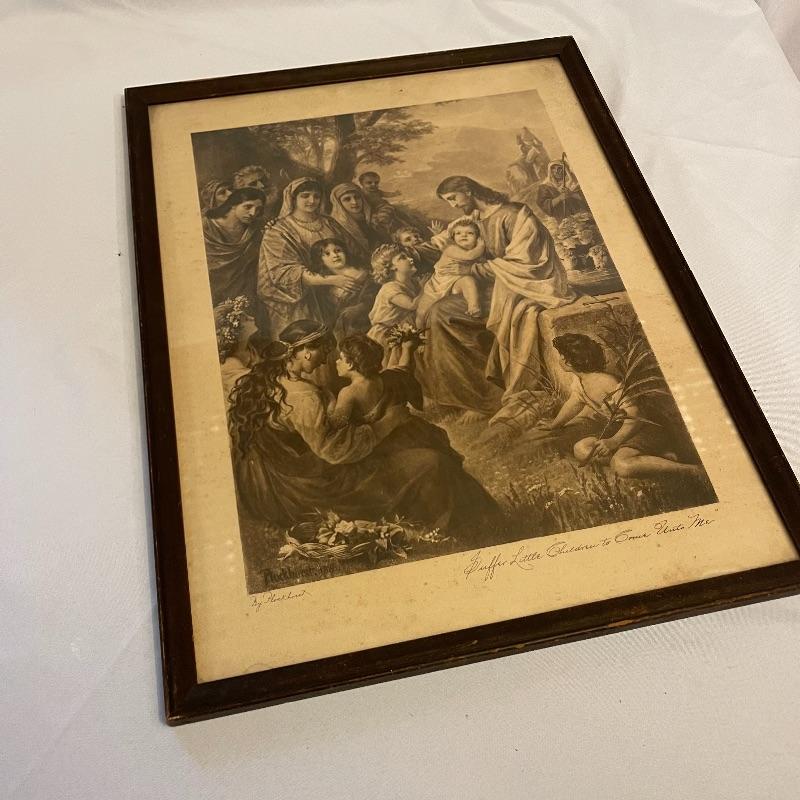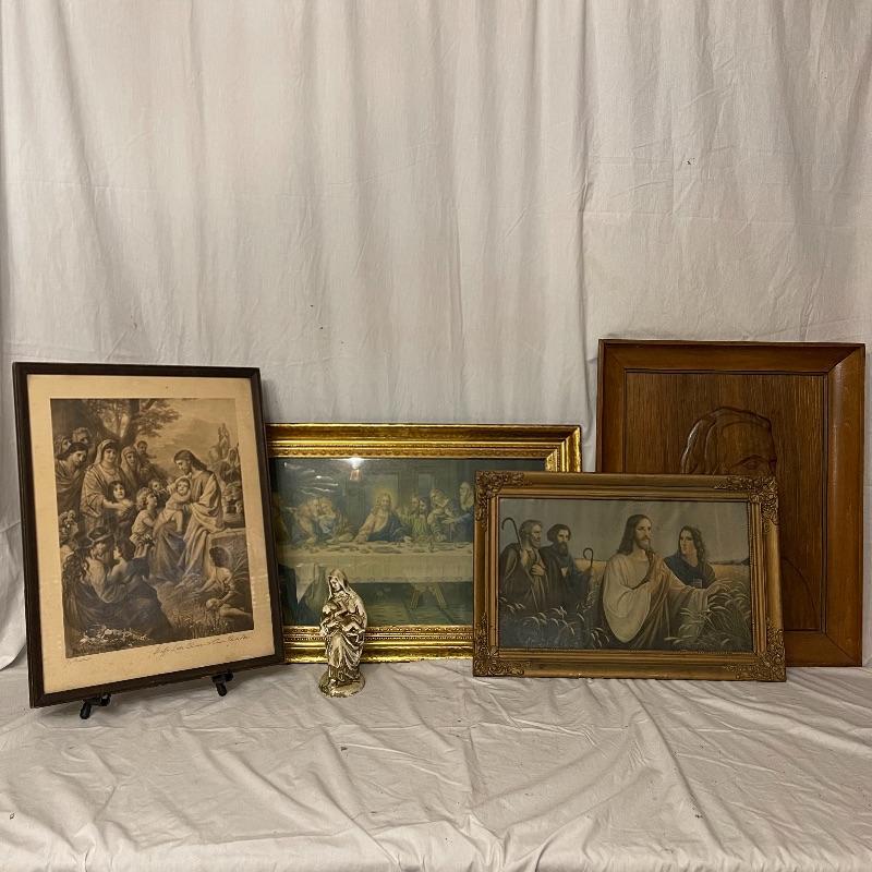 Collection of religious items includes 4 artworks, 2 candles, and 1 small statue. There is a beautiful wooden relief picture of Jesus that measures 21” x 25.5” and is 2.5” deep. There is also a print by Plockhorst called "Suffer Little Children to Come Unto Me" that measures approx 17” x 22.5" Both candles are 8” tall and the statue of Mary with baby Jesus is just under 9” tall.