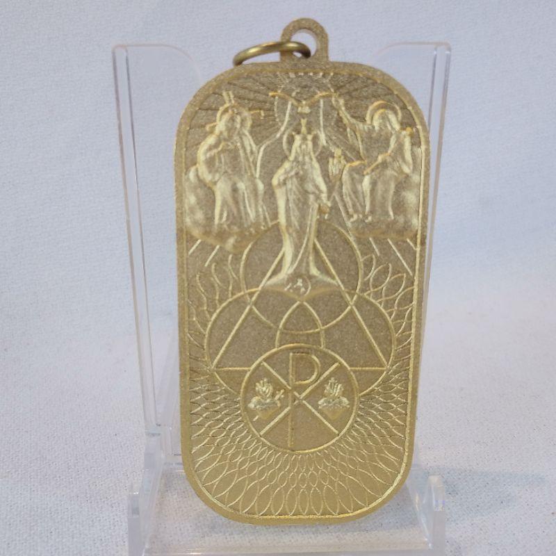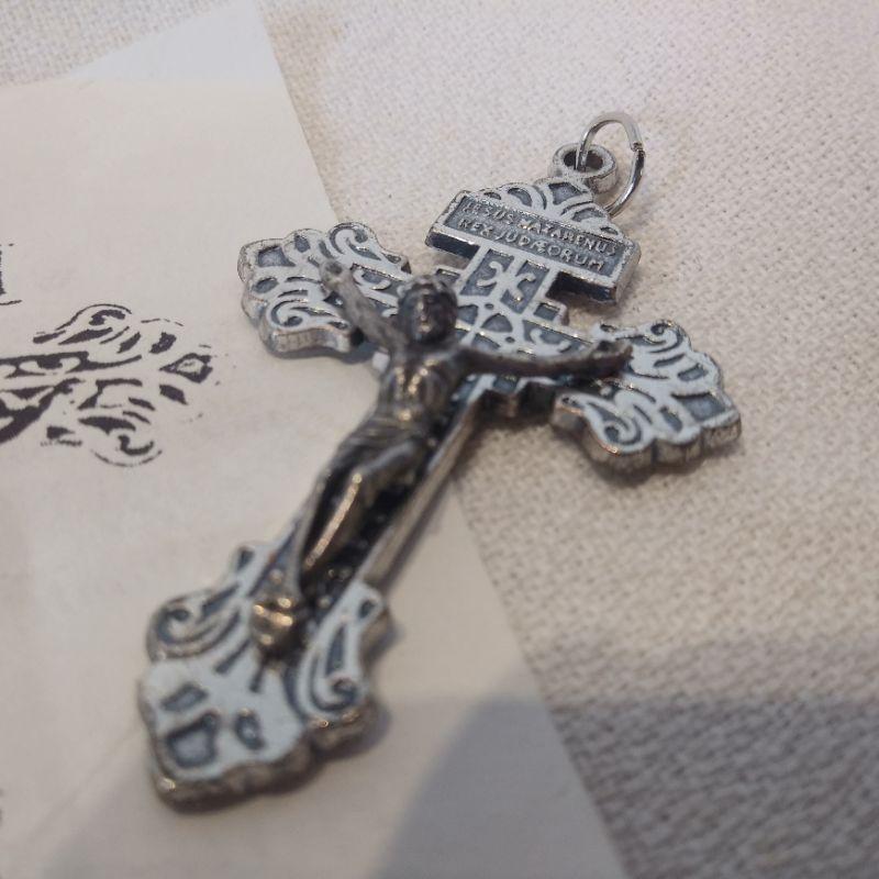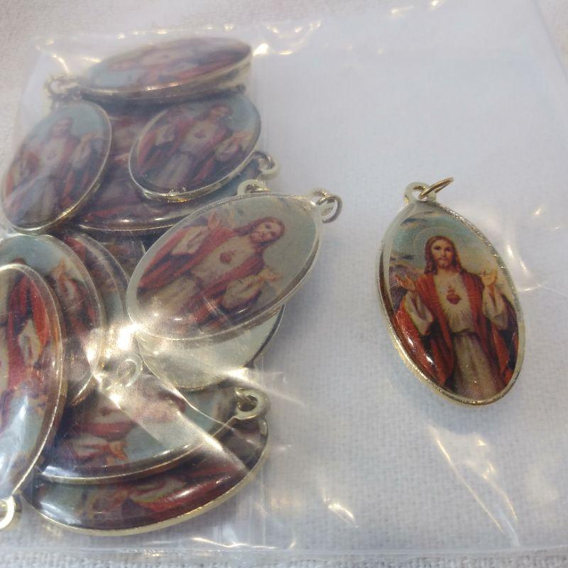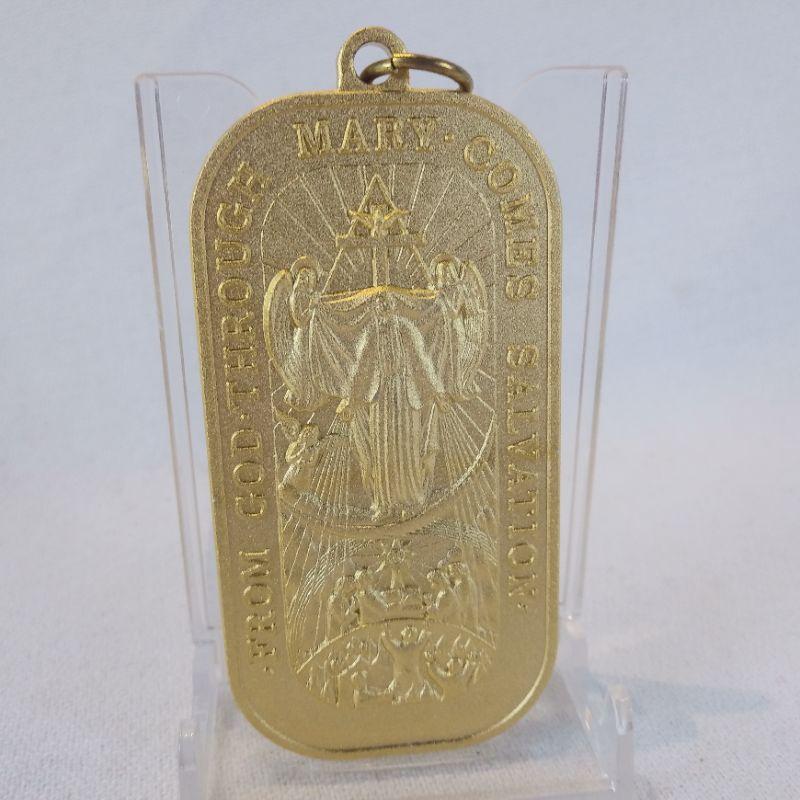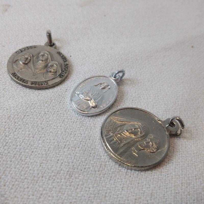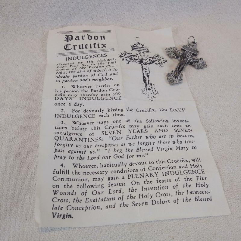 This collection of religious items includes a "Pardon Crucifix", golden medal key fob, various silver toned metals and a bag of Sacred Heart metals. All are in very good condition. The key fob is particularly nice.