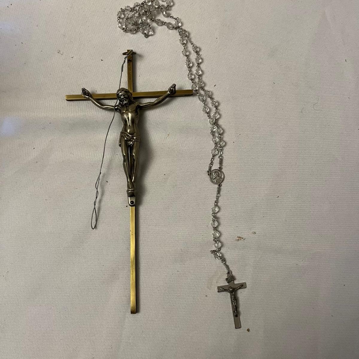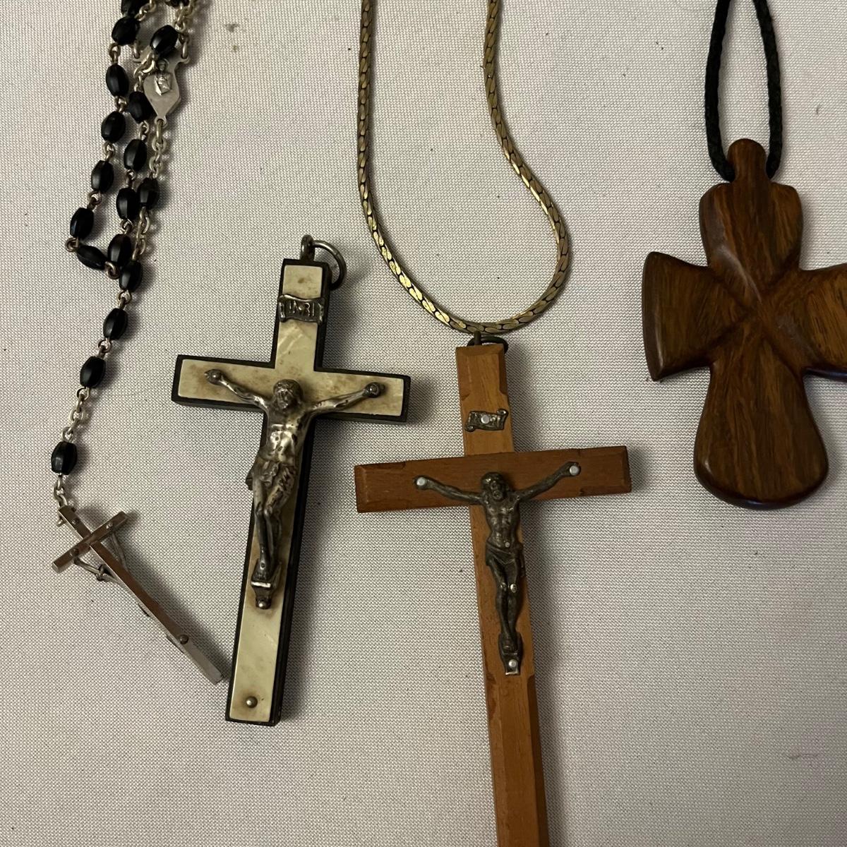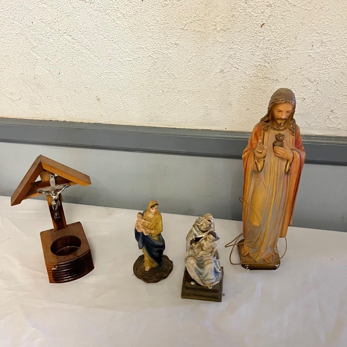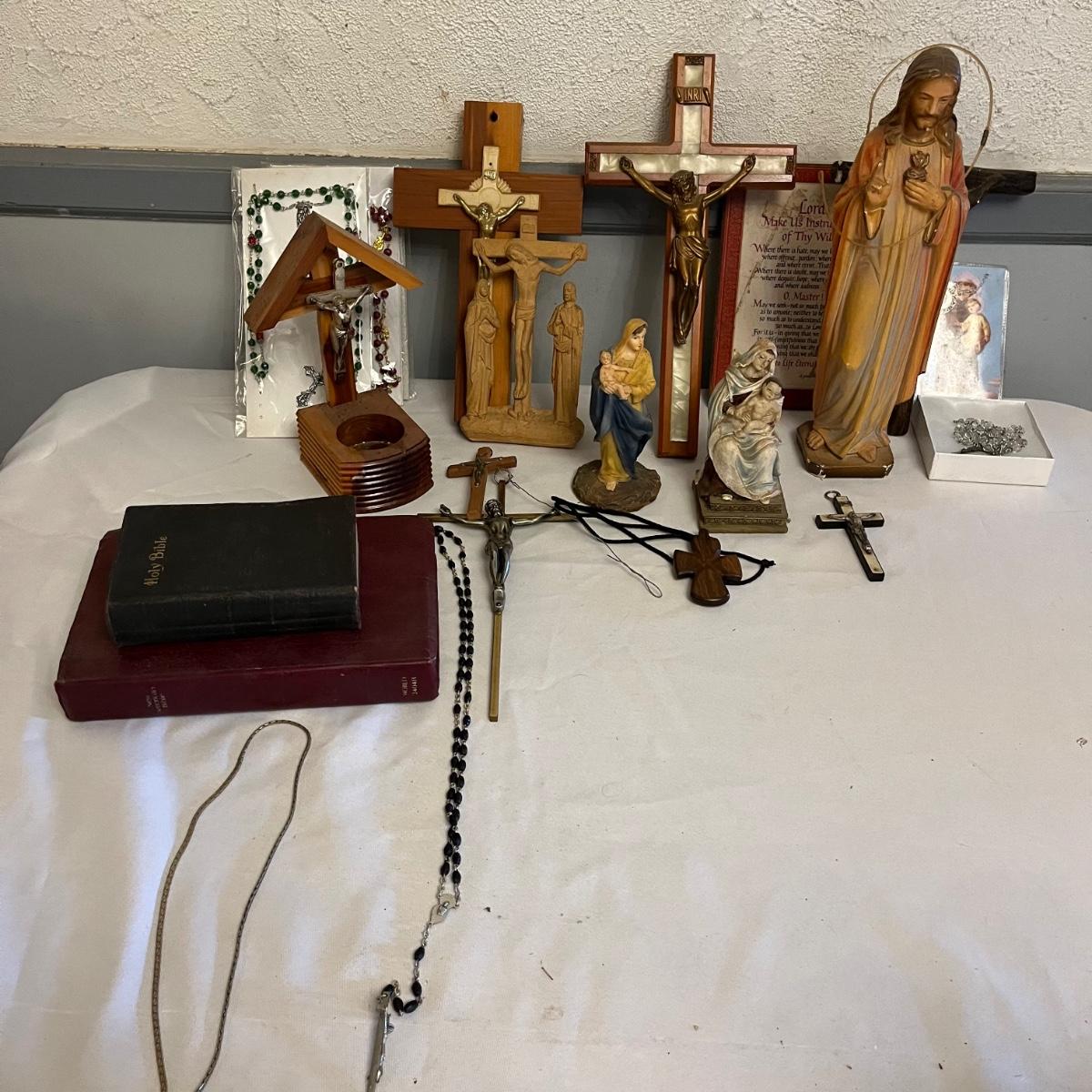 Lot includes wooden and metal crucifixes, Bible, figurines, beads, two ceramics angel figurines, two ceramic angel bells and more.