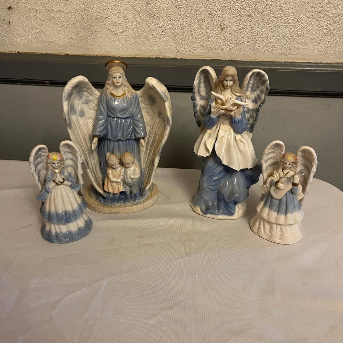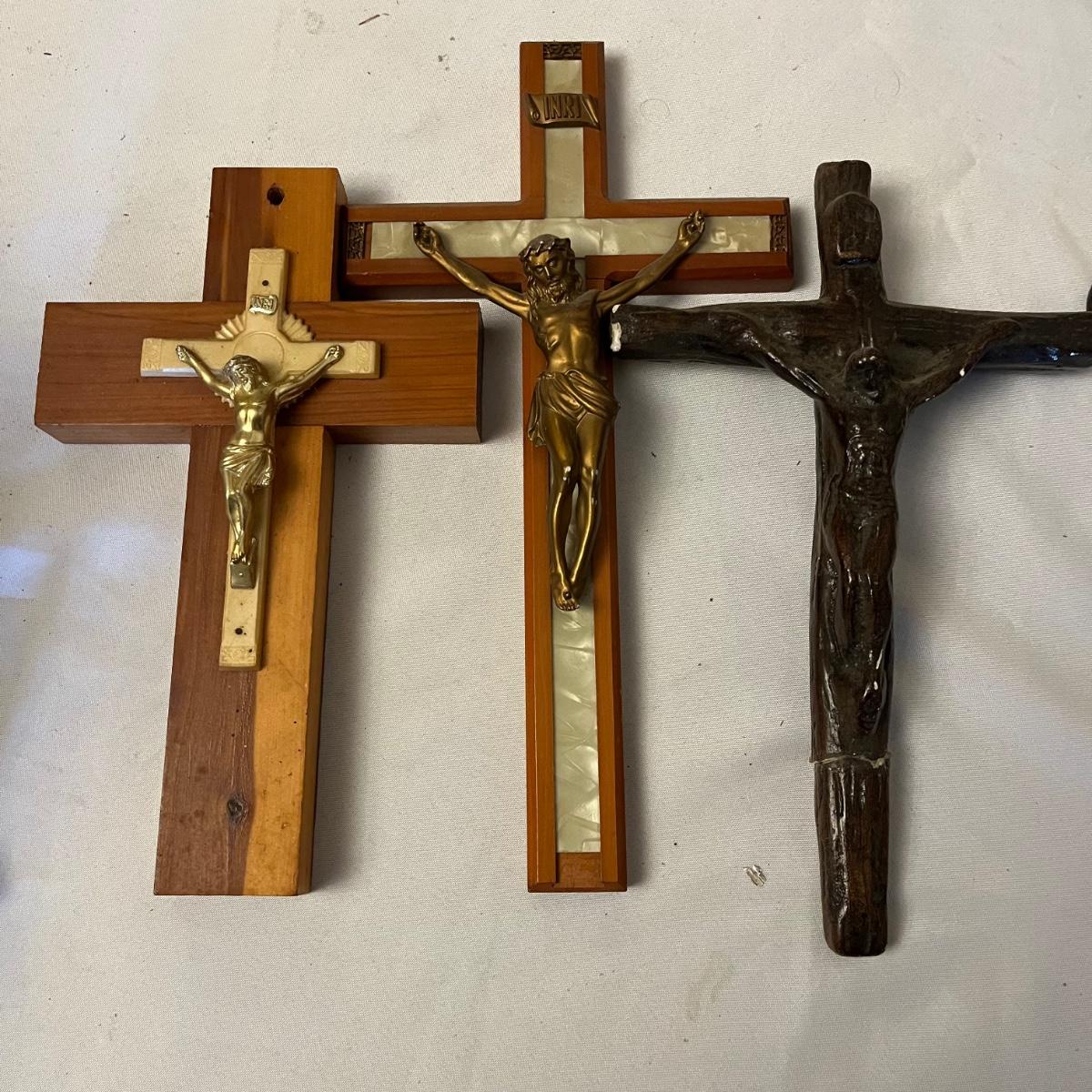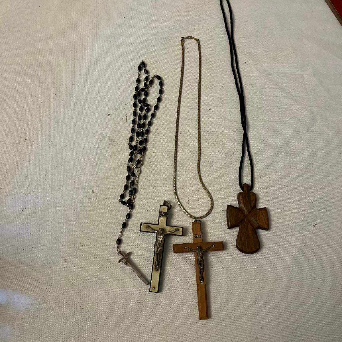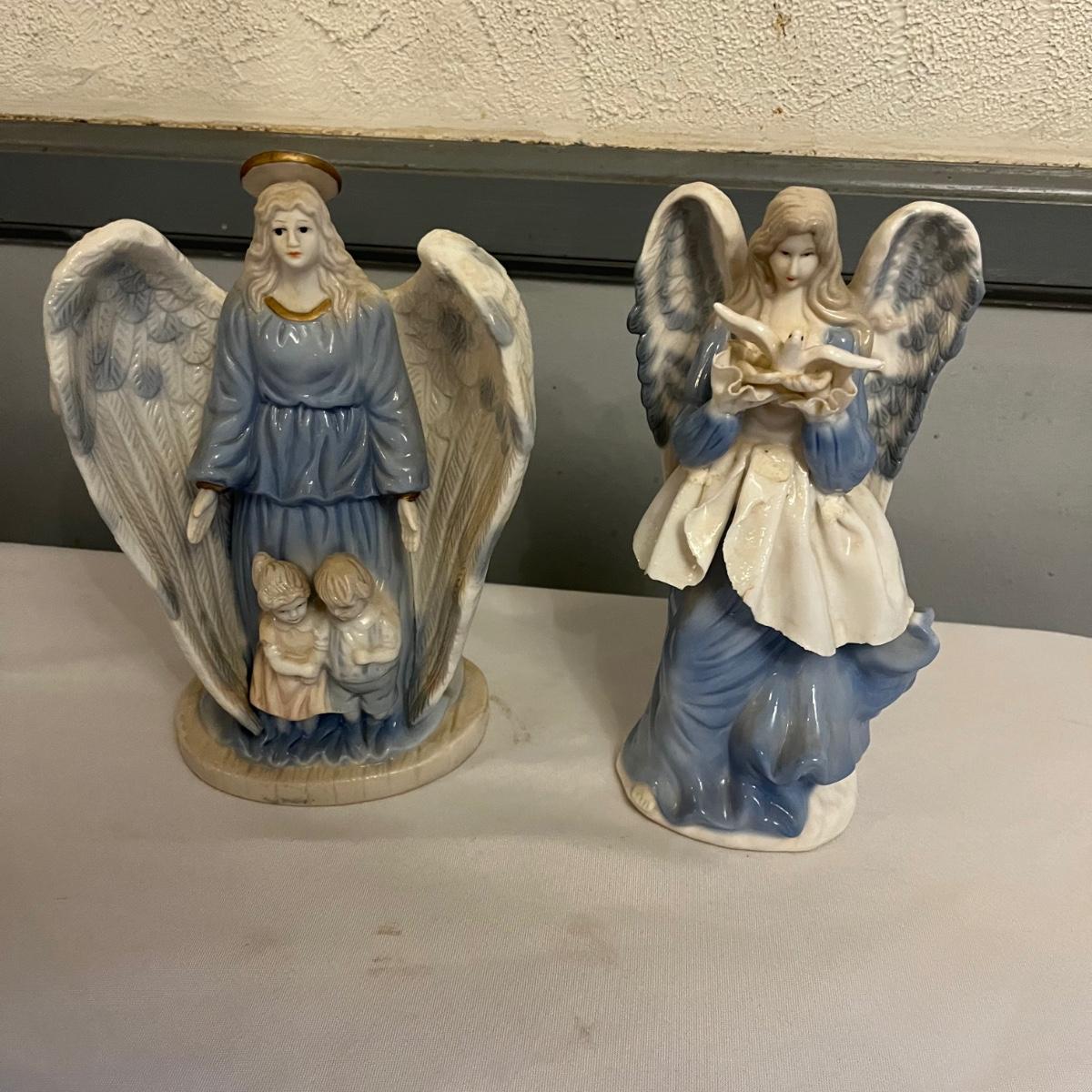 Lot includes wooden and metal crucifixes, Bible, figurines, beads, two ceramics angel figurines, two ceramic angel bells and more.
