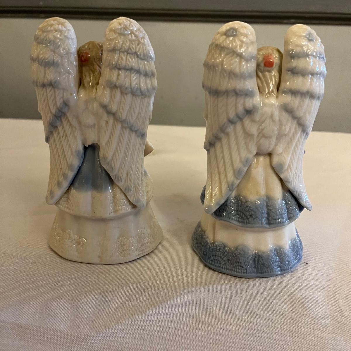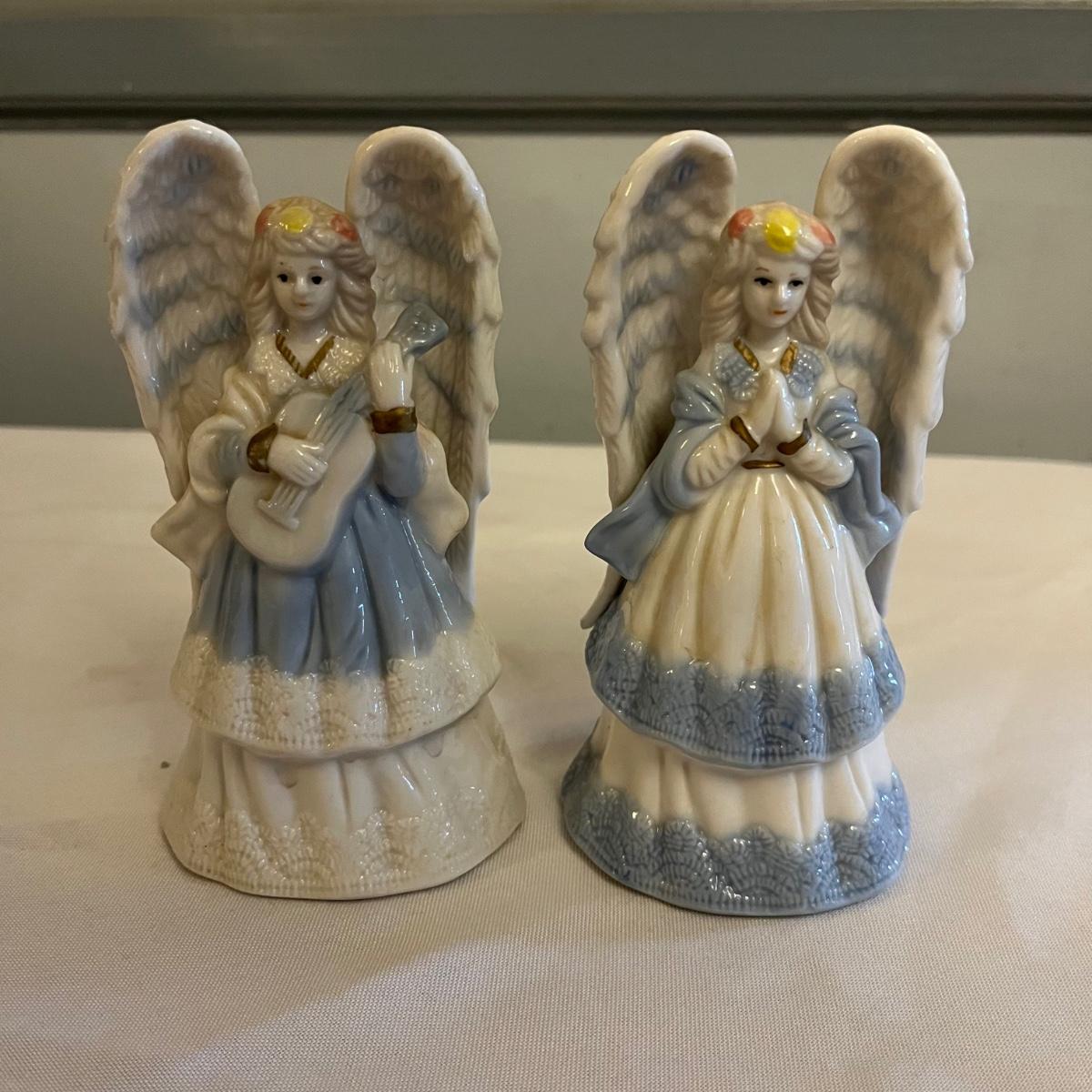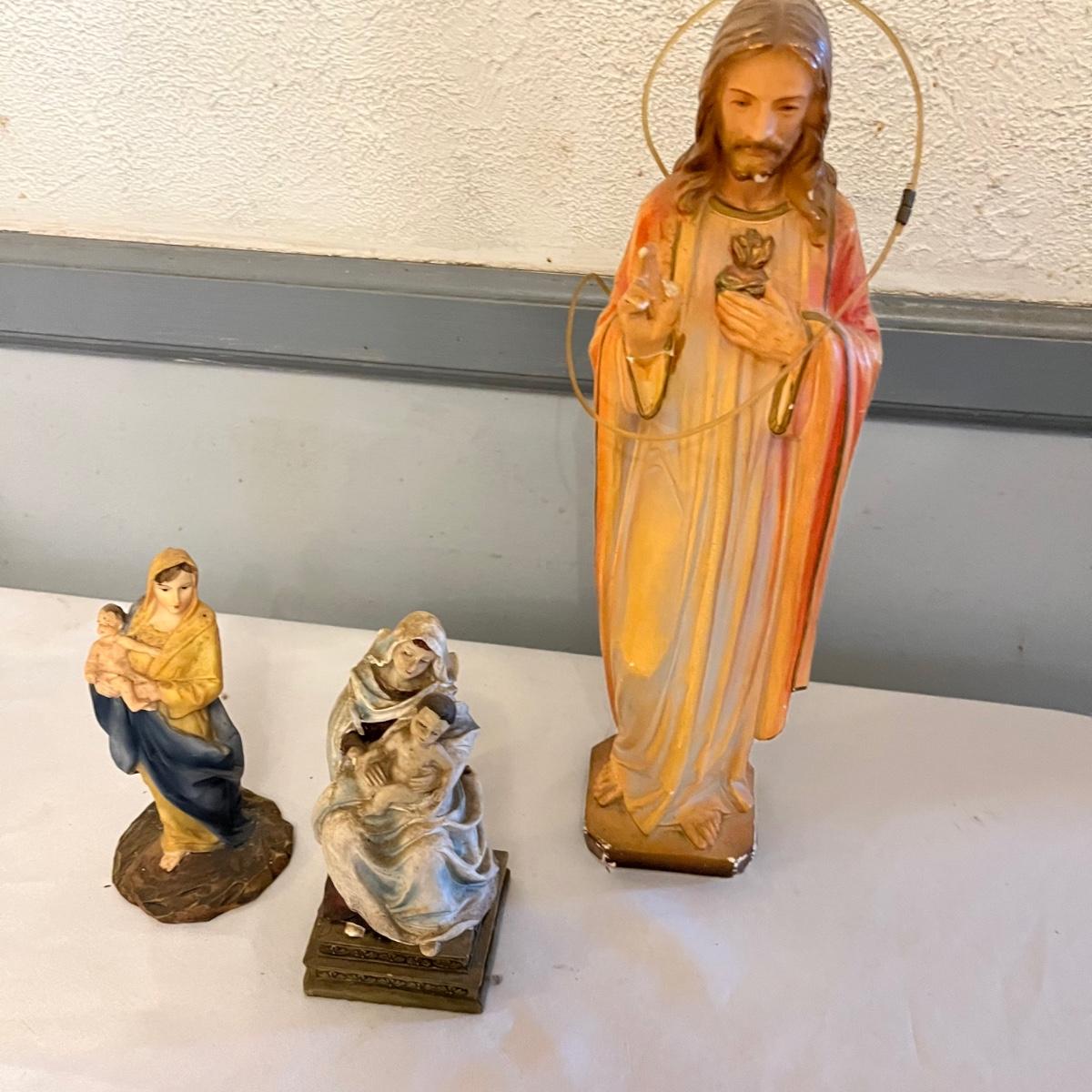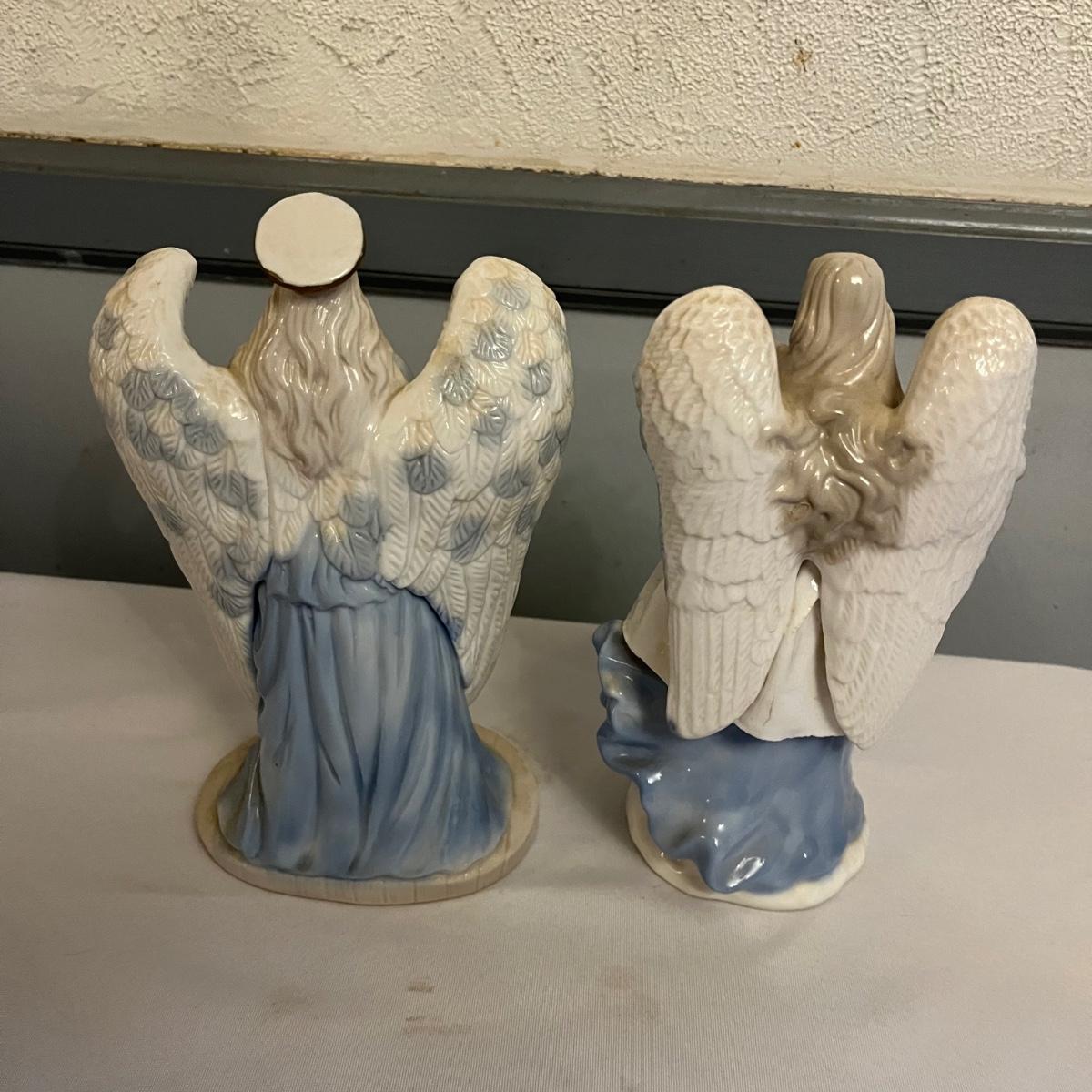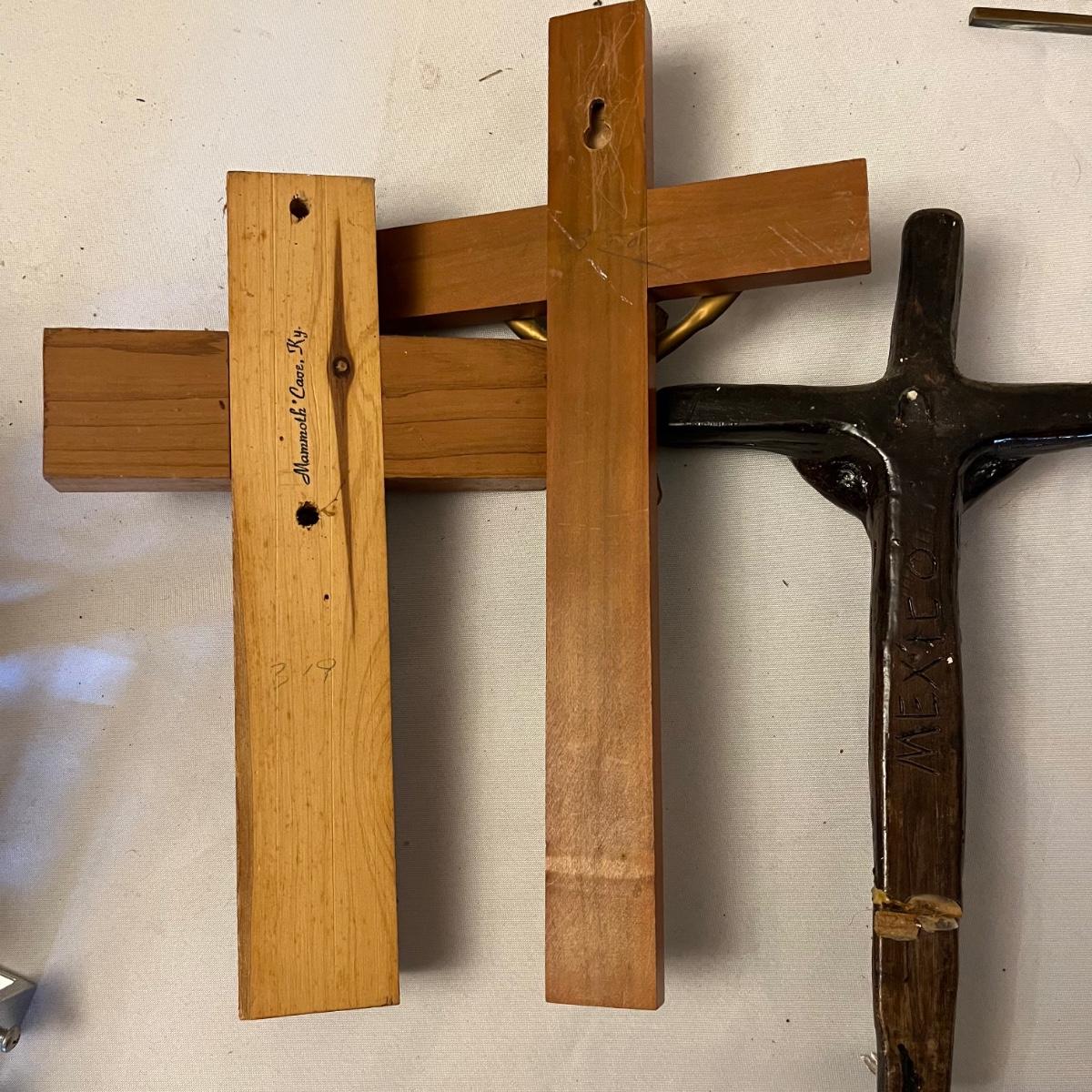 Lot includes wooden and metal crucifixes, Bible, figurines, beads, two ceramics angel figurines, two ceramic angel bells and more.