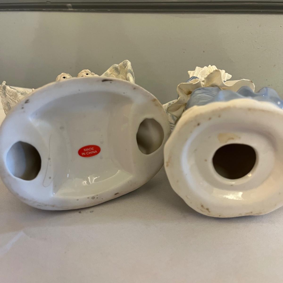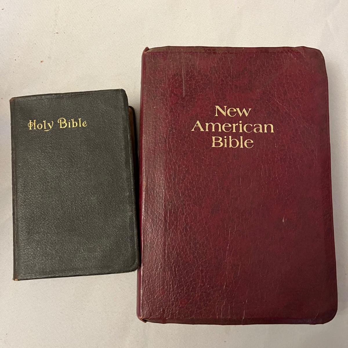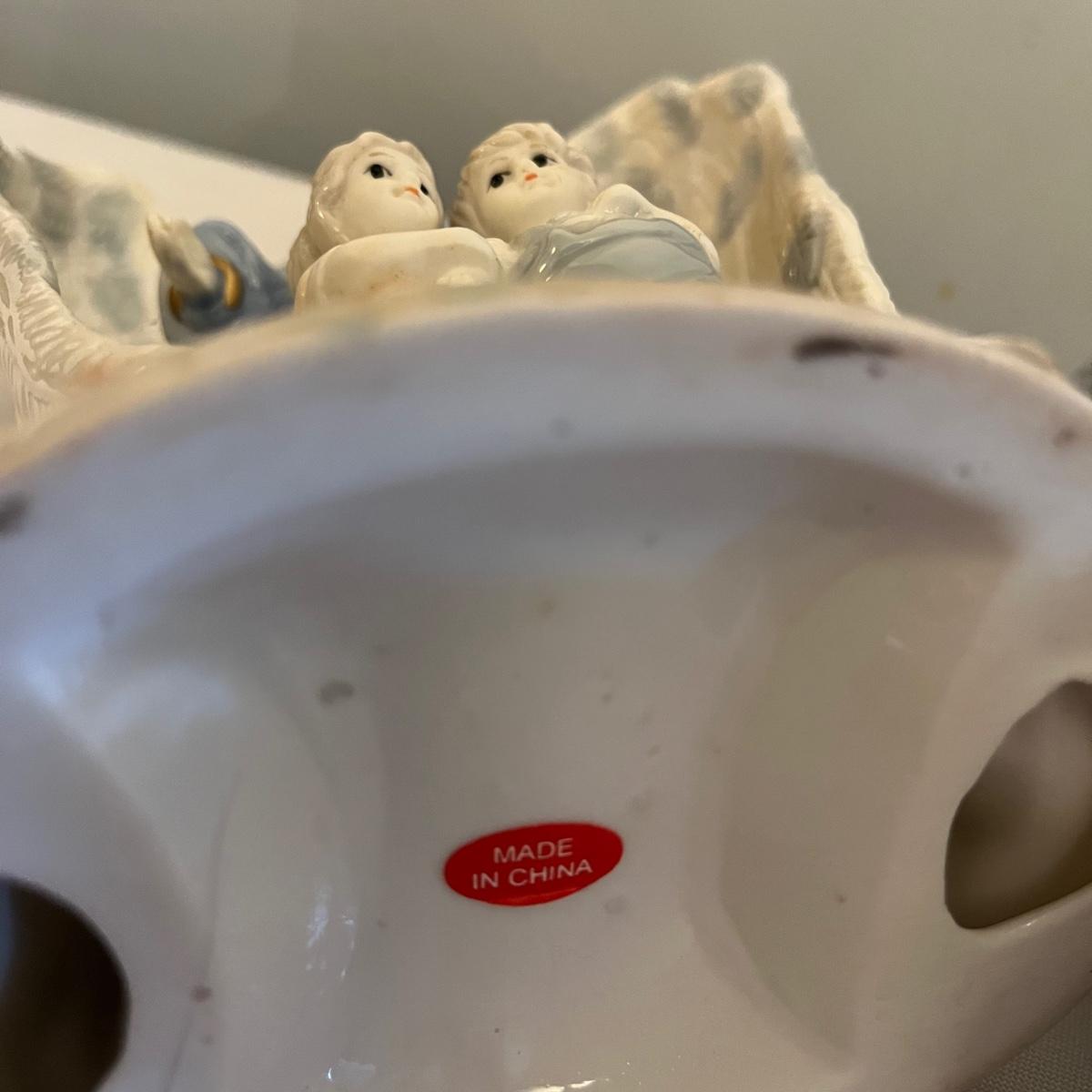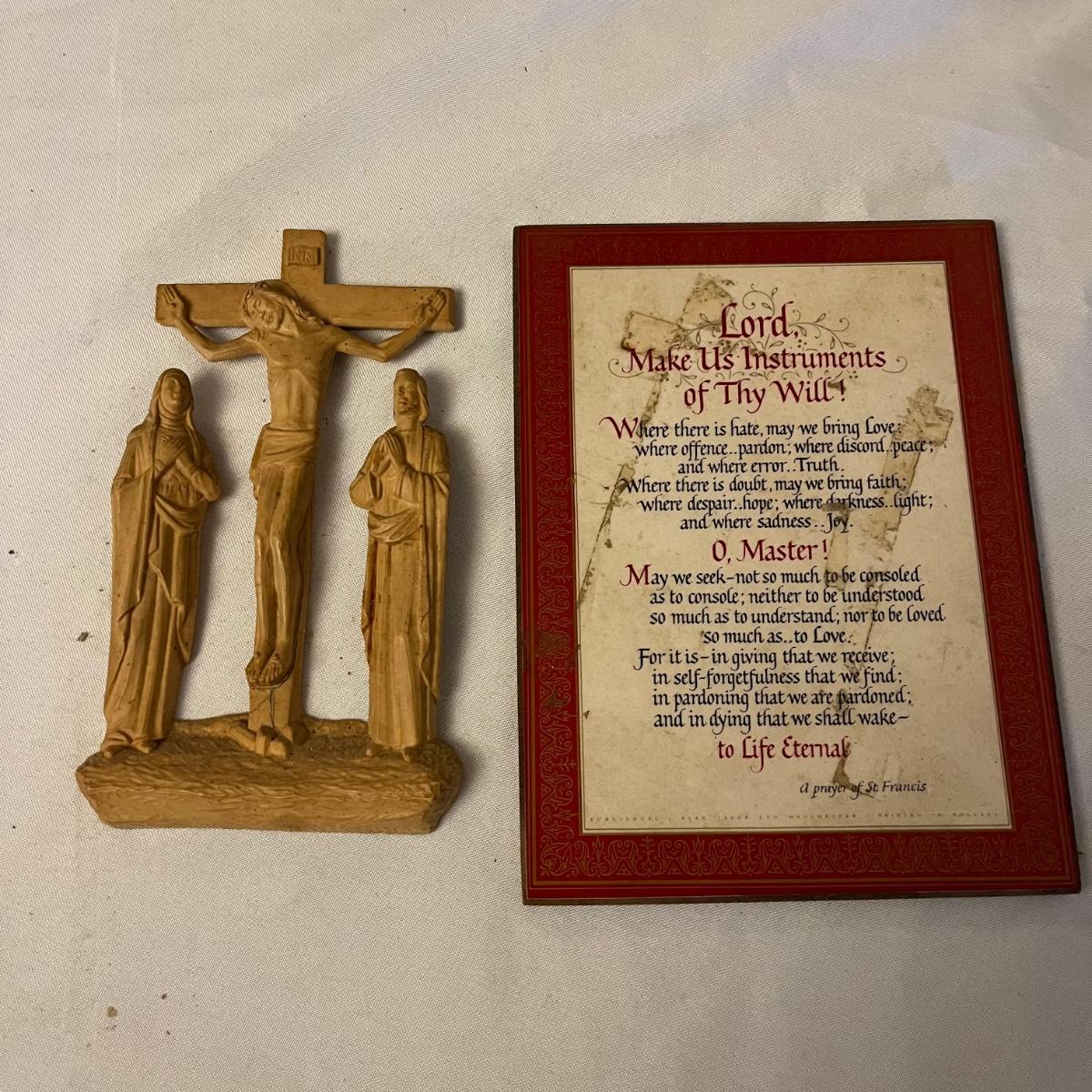 Lot includes wooden and metal crucifixes, Bible, figurines, beads, two ceramics angel figurines, two ceramic angel bells and more.