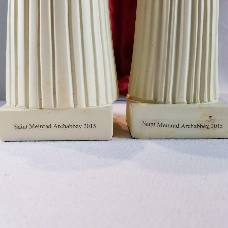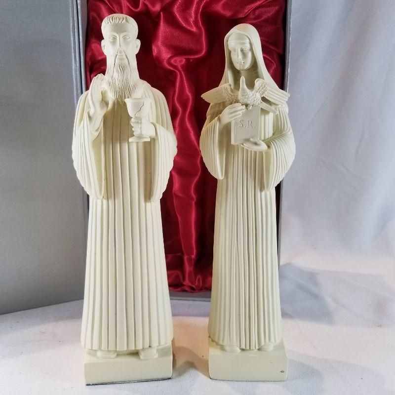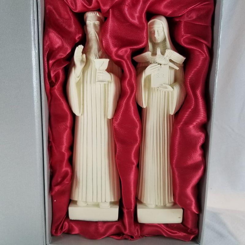 Gift-boxed set of figurines of Saint Benedict and Saint Scholastica. The statues are 10-1/2-inches tall and appear to be made out or a high quality marble resin. They are also in very good condition, no chips or cracks and ready to gift.