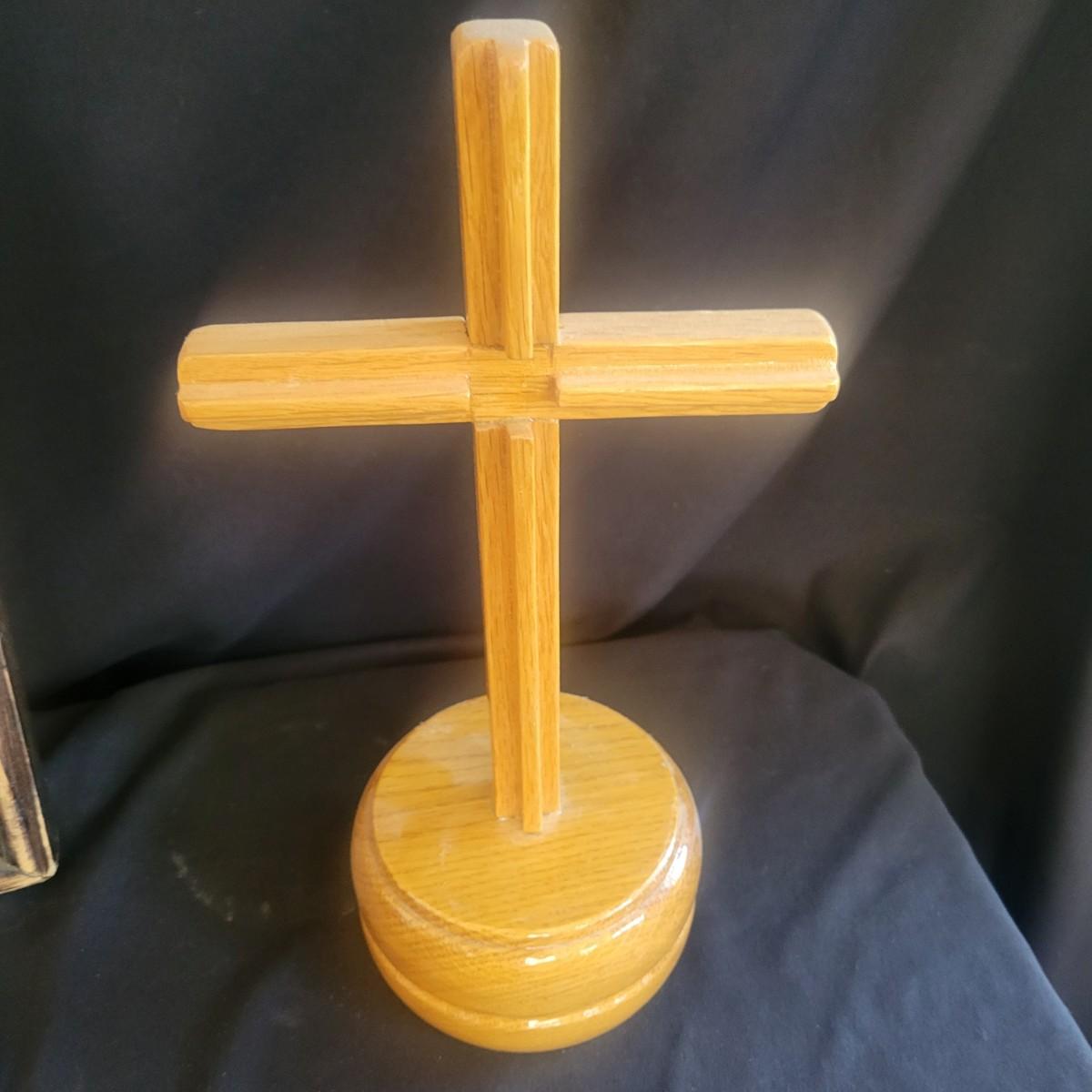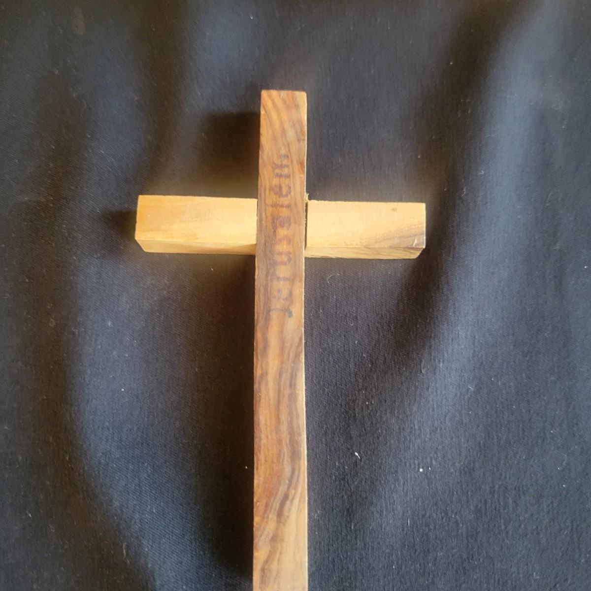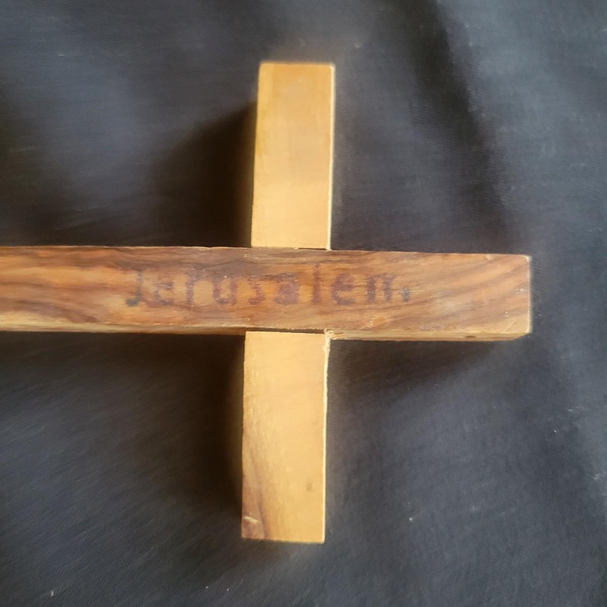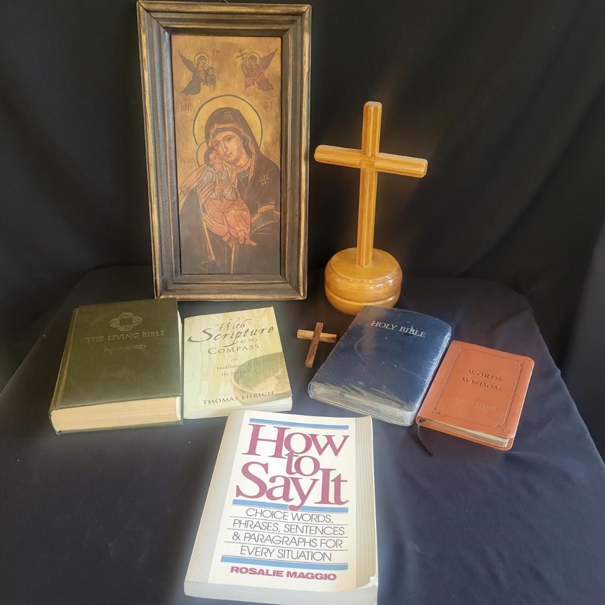 A collection of books and bibles on Christianity. The lot also includes two crosses made of wood. One is a small cross with Jerusalem stamped in it. Also includes one piece of framed art. This piece is mounted on wood with a rustic wood frame and measures approximately 10" x 1.5" x 17.5"H. Shipping available