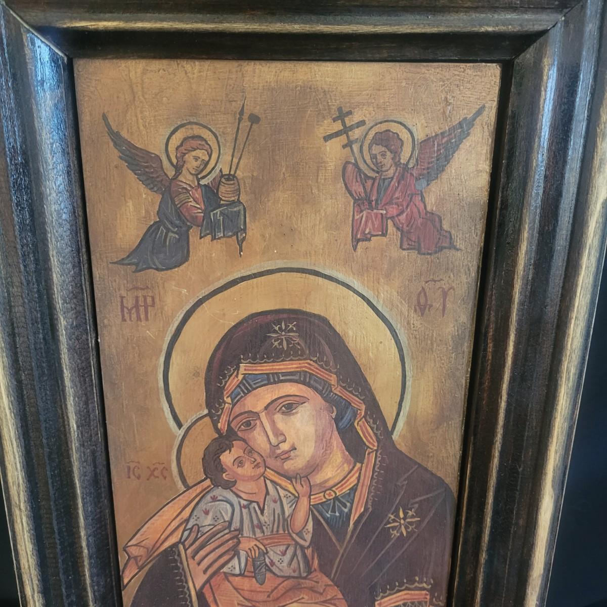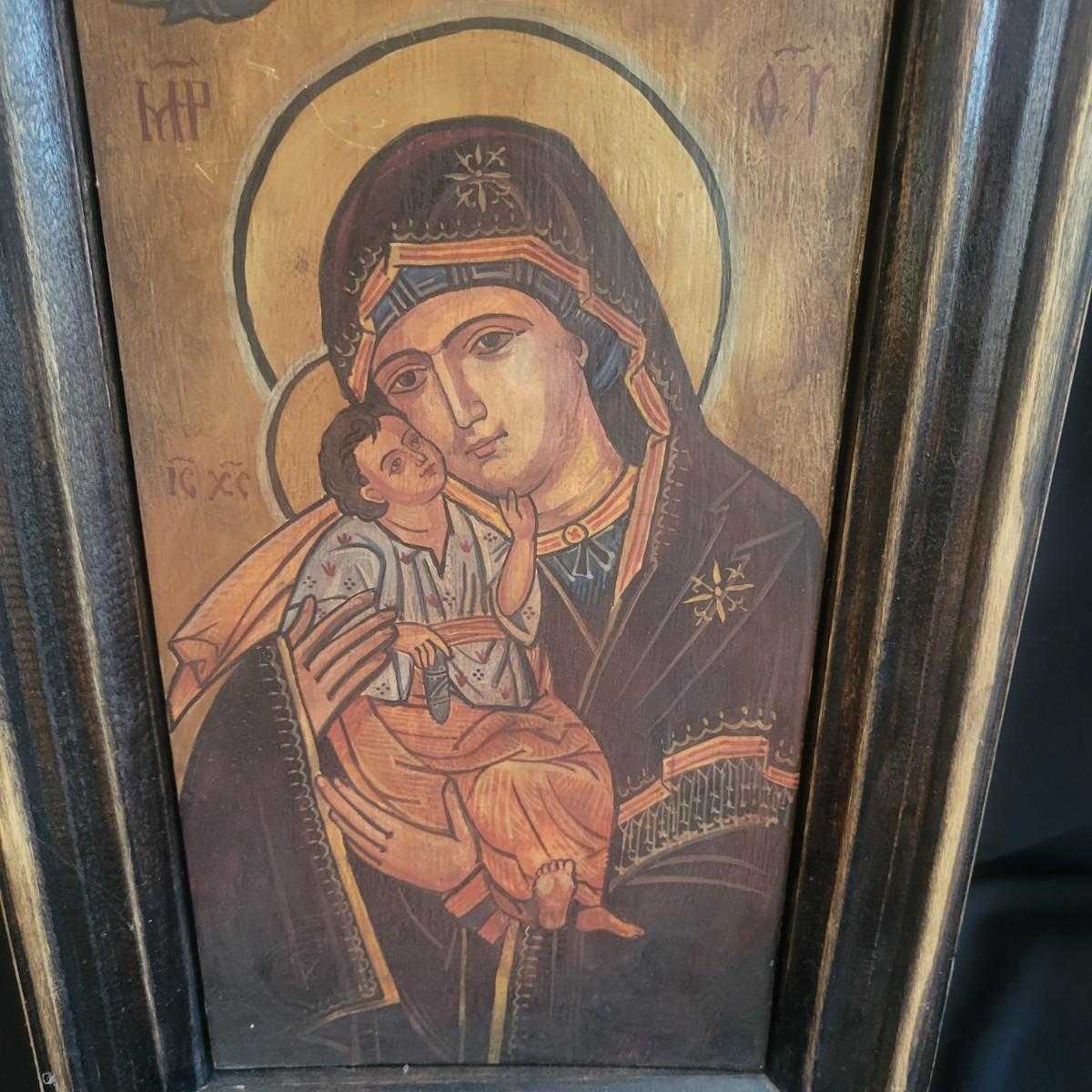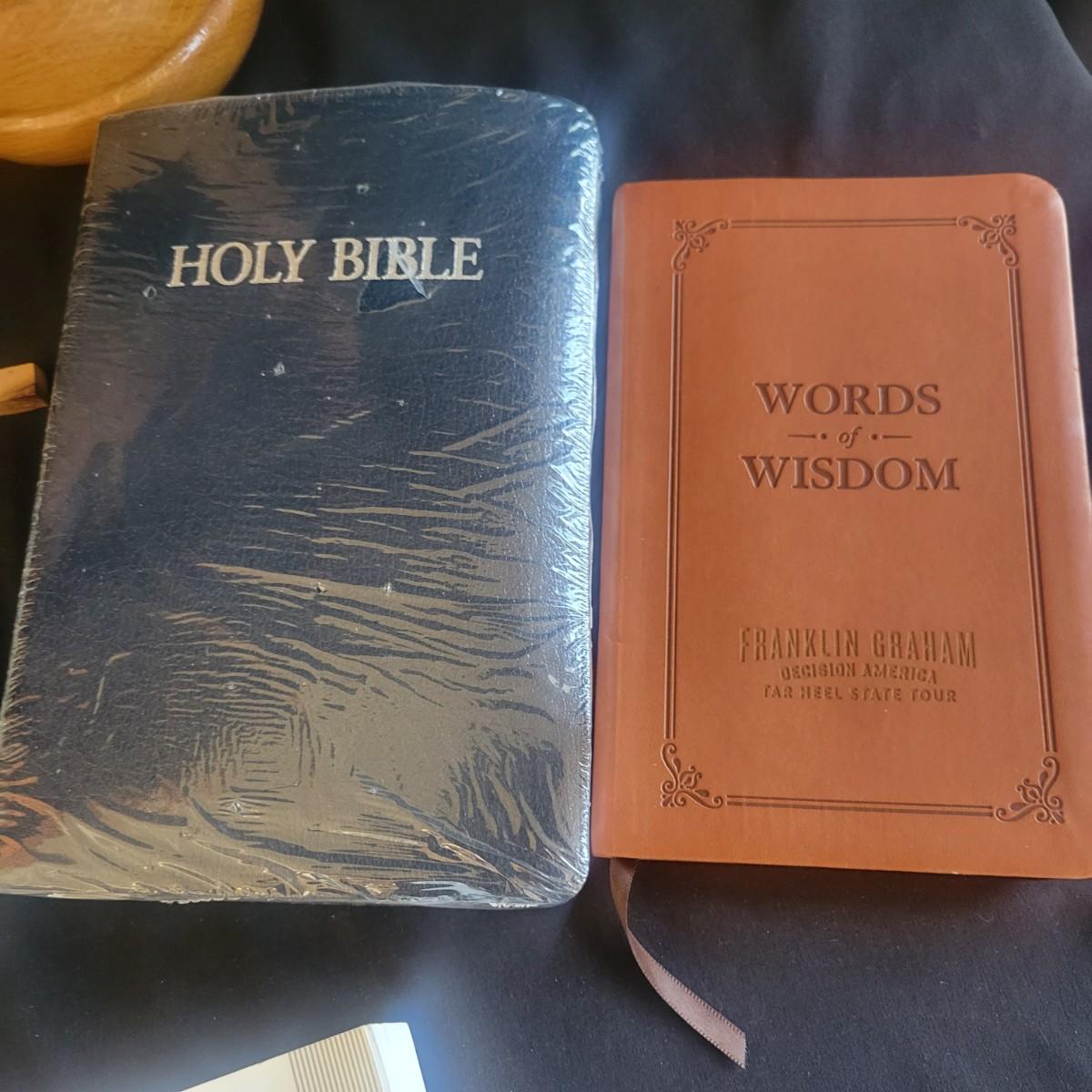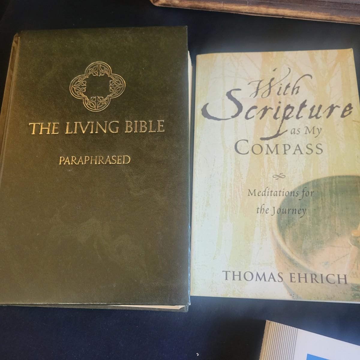 A collection of books and bibles on Christianity. The lot also includes two crosses made of wood. One is a small cross with Jerusalem stamped in it. Also includes one piece of framed art. This piece is mounted on wood with a rustic wood frame and measures approximately 10" x 1.5" x 17.5"H. Shipping available